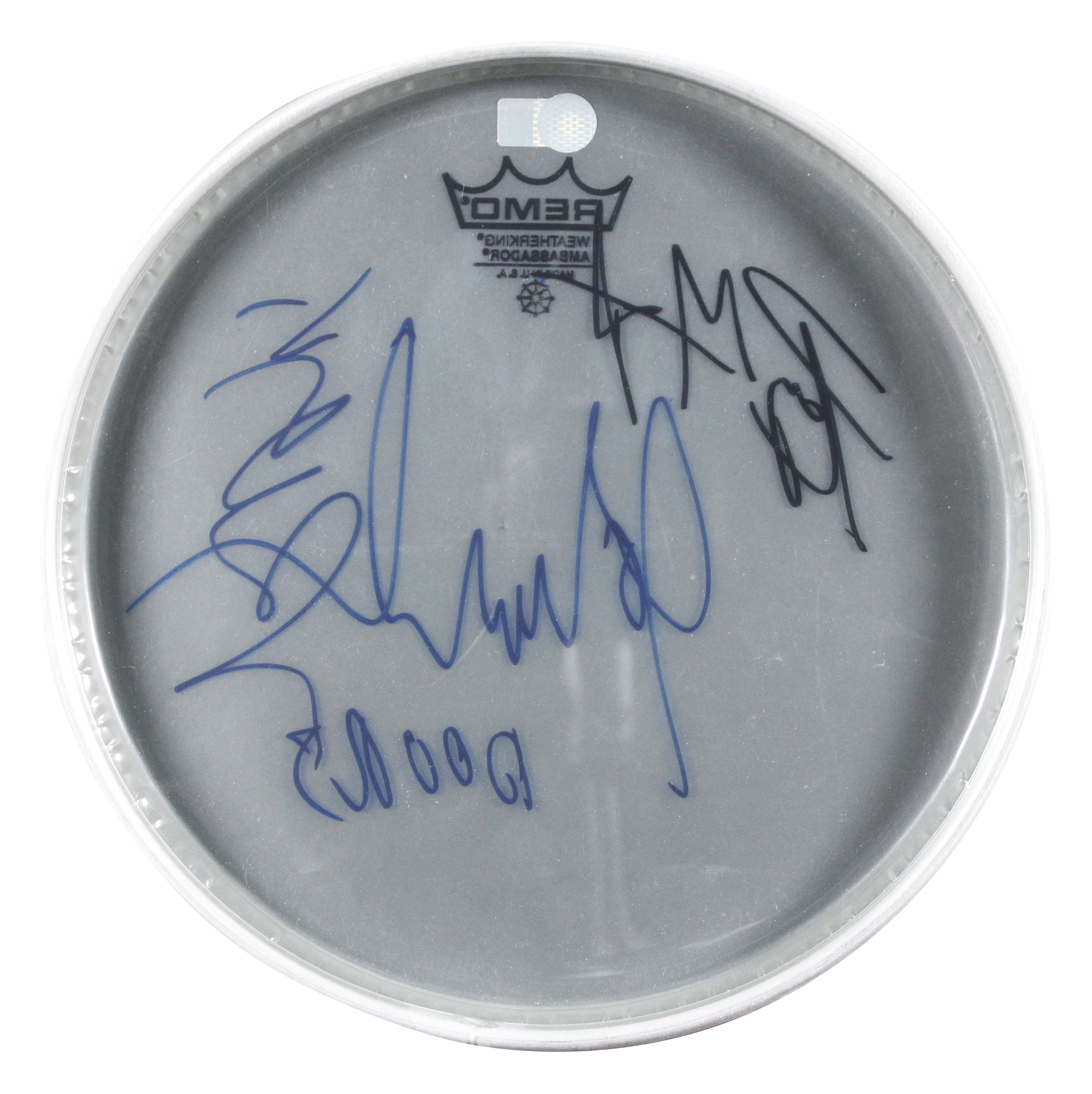 This Autographed 10 Inch Remo Drum Head has been Personally Signed by Ray Manzarek, John Densmore, and Robby Krieger of The Doors. This item is 100% Authentic to include a Certificate of Authenticity (COA) / hologram by Beckett Authentication Services. The authenticity can be verified on Beckett Authentication Services website.