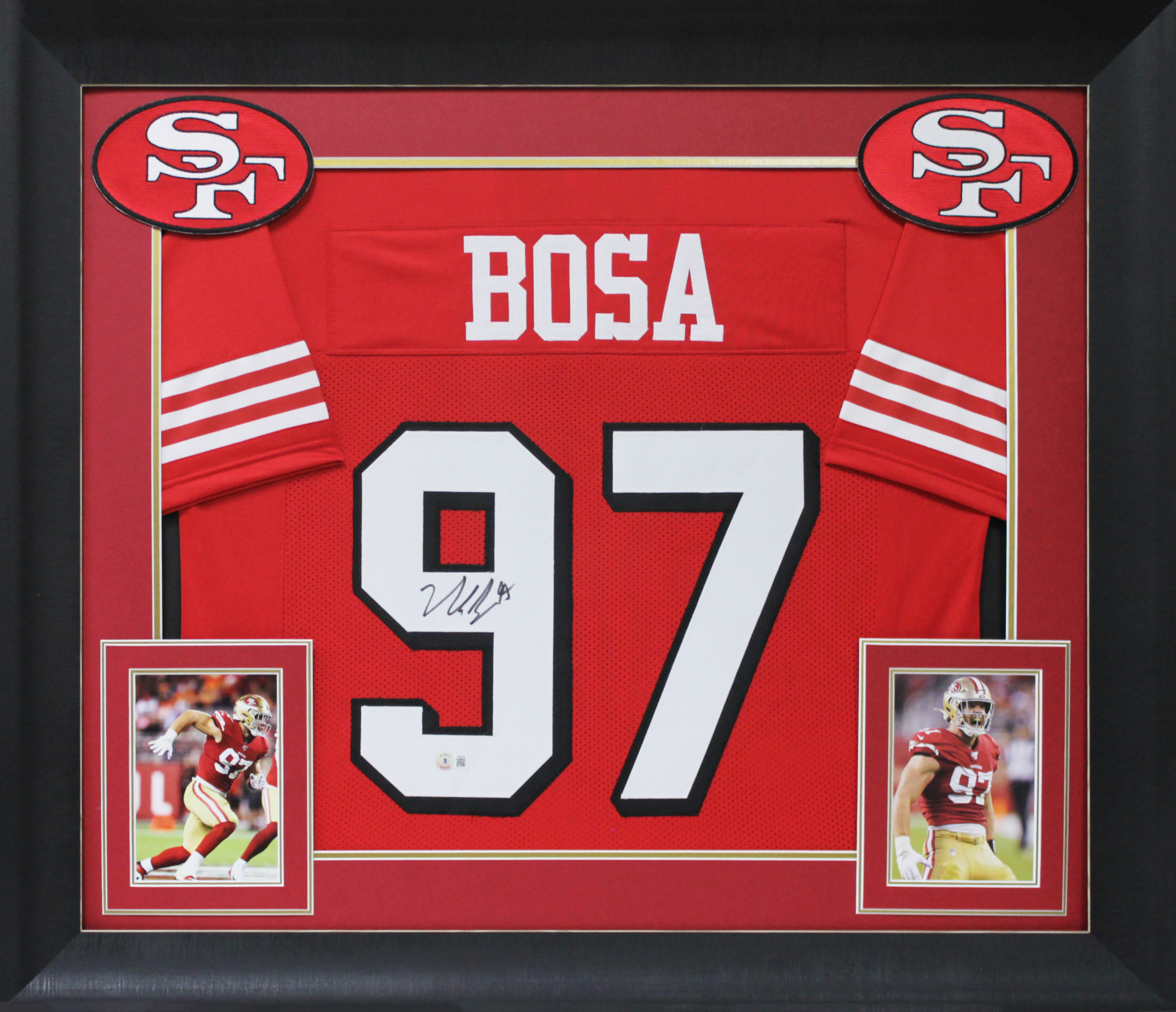 This Autographed w/ Dropshadow Red Pro Style Framed Jersey has been Personally Signed by Nick Bosa of the San Francisco 49ers. This item is 100% Authentic to include a hologram by Beckett Authentication Services. This item will come with an affixed Beckett Authentication Services (BAS) authentication sticker, which includes a scannable QR code to verify authenticity. Please note that Beckett no longer provides serial-numbered COA cards, and the attached BAS sticker will serve as the complete authentication for this item. This is a BAS Witnessed Protection Program item which means a Beckett Authentication Service representative was present when this item was being signed. We conducted an autograph signing with Nick Bosa where multiples of the same item were signed. While the photographs are representative of this item, the size, placement and strength of the signature may vary. Each item is hand signed, therefore, each autograph is unique. This item can be verified through BAS Witnessed. This item has been professionally framed to overall dimensions of approximately 32 x 37 inches. This is a X-Large sized Framed Jersey. This jersey will be framed to order, it will take approximately 3-4 business days from purchase date for it to ship.