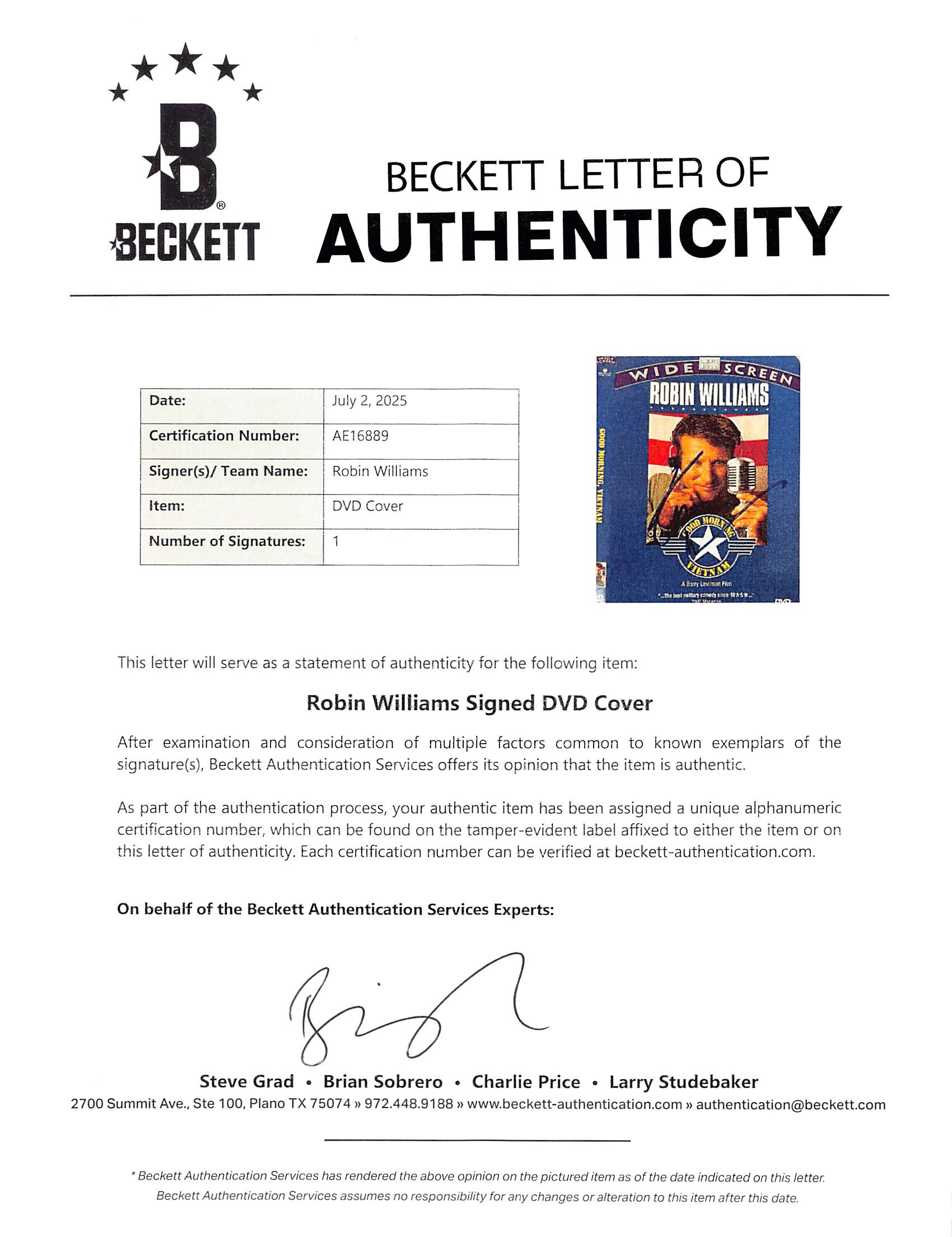 This Autographed Dvd Cover W/ Disk has been Personally Signed by Robin Williams of Good Morning Vietnam. This item is 100% Authentic to include a Certificate of Authenticity (COA) / hologram by Beckett Authentication Services. The authenticity can be verified on Beckett Authentication Services website.