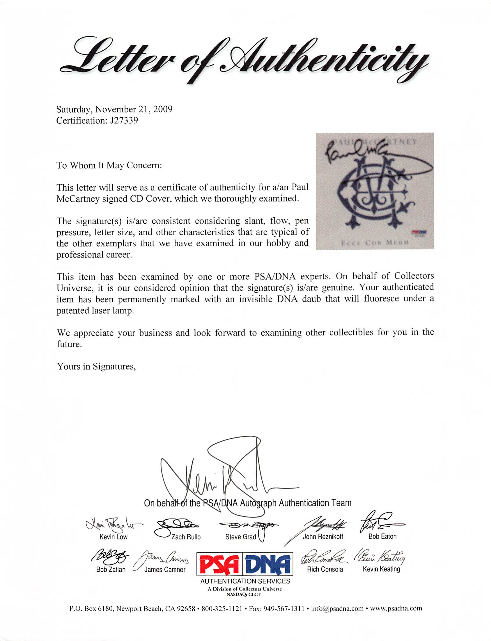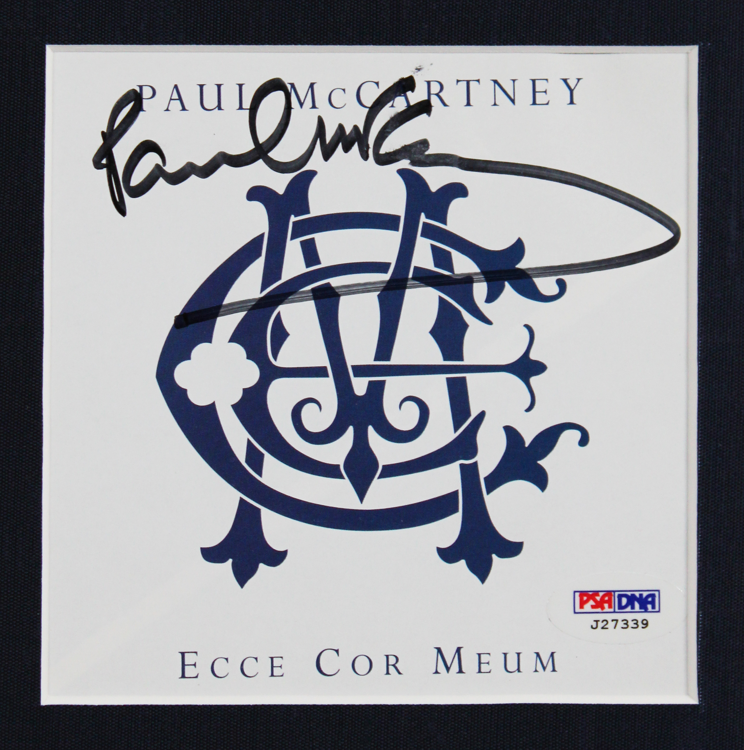 This Autographed & Framed Ecce Cor Meum Cd Cover has been Personally Signed by Paul McCartney of The Beatles. This item is 100% Authentic and comes with a PSA/DNA Certification Card and a matching numbered Hologram. The authenticity can be verified on Professional Sports Authenticator website. This item has been professionally framed to overall dimensions of approximately 13 x 22 inches.