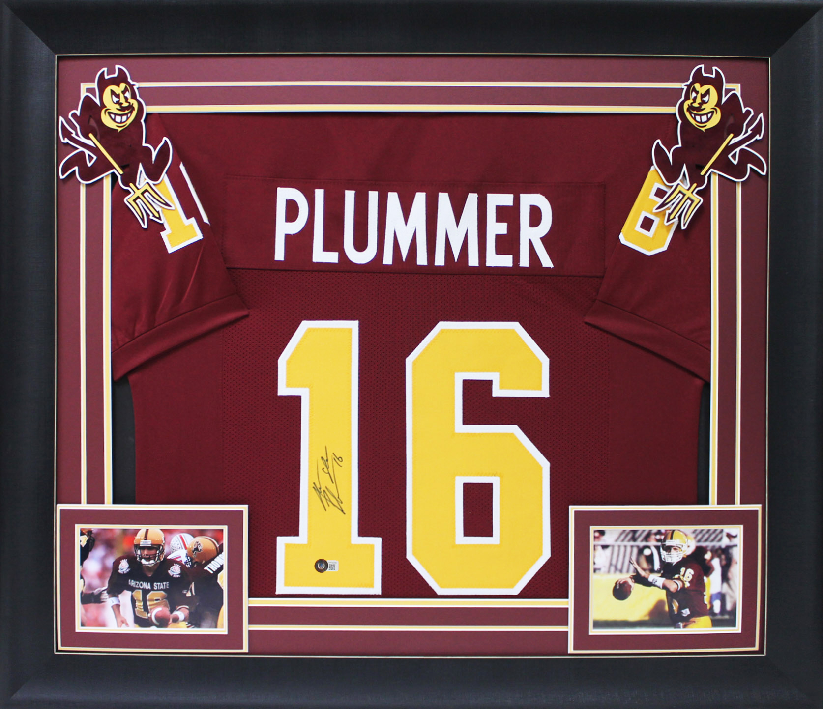 This Autographed Signed on #1 Maroon Pro Style Framed Jersey has been Personally Signed by Jake Plummer of the Arizona State Sun Devils. This item is 100% Authentic to include a hologram by Beckett Authentication Services. This item will come with an affixed Beckett Authentication Services (BAS) authentication sticker, which includes a scannable QR code to verify authenticity. Please note that Beckett no longer provides serial-numbered COA cards, and the attached BAS sticker will serve as the complete authentication for this item. This is a BAS Witnessed Protection Program item which means a Beckett Authentication Service representative was present when this item was being signed. We conducted an autograph signing with Jake Plummer where multiples of the same item were signed. While the photographs are representative of this item, the size, placement and strength of the signature may vary. Each item is hand signed, therefore, each autograph is unique. This item can be verified through BAS Witnessed. This item has been professionally framed to overall dimensions of approximately 32 x 37 inches. This is a X-Large sized, non-branded, custom-stitched Framed Jersey. This jersey will be framed to order, it will take approximately 3-4 business days from purchase date for it to ship.