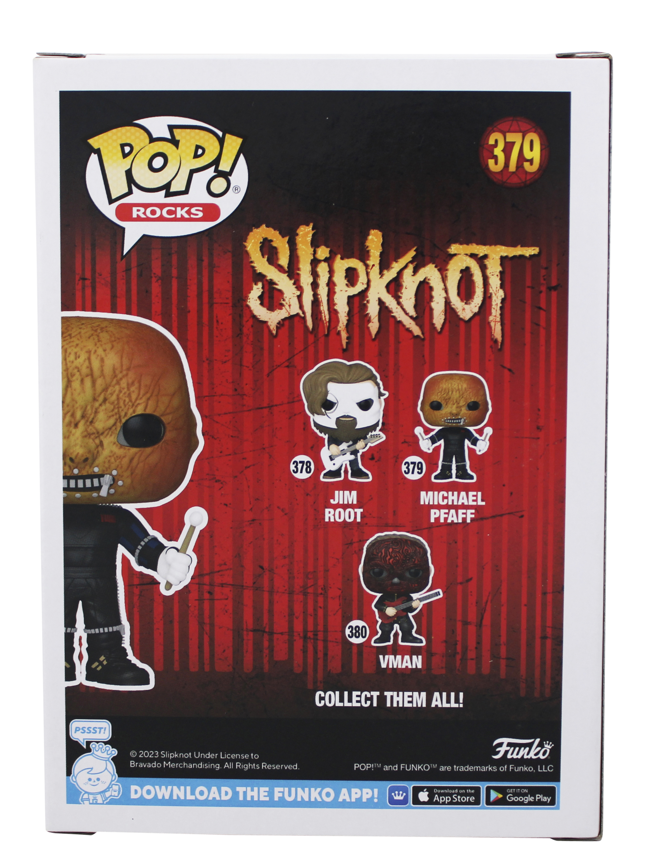 This Autographed Slipknot #379 Funko Pop Vinyl Figure has been Personally Signed by Michael Pfaff. This item is 100% Authentic to include a hologram by Beckett Authentication Services. This item will come with an affixed Beckett Authentication Services (BAS) authentication sticker, which includes a scannable QR code to verify authenticity. Please note that Beckett no longer provides serial-numbered COA cards, and the attached BAS sticker will serve as the complete authentication for this item. The authenticity can be verified on Beckett Authentication Services website. This will be shipped in a Pop Protector. This Funko will have some handling wear from shipment to the signing and back. This Funko is in good condition, but would not be considered mint. Please refer to photos for item's condition prior to purchase.
