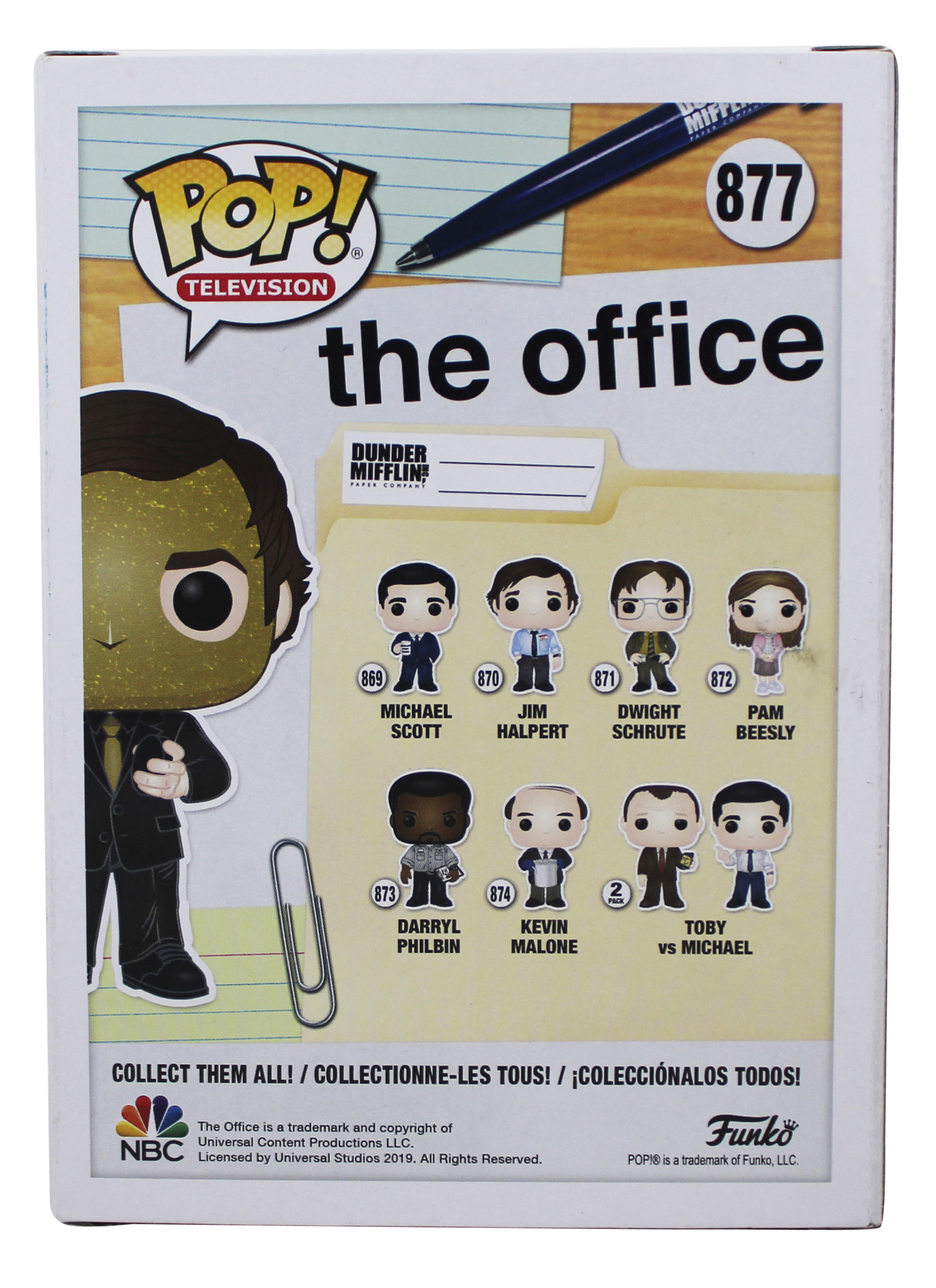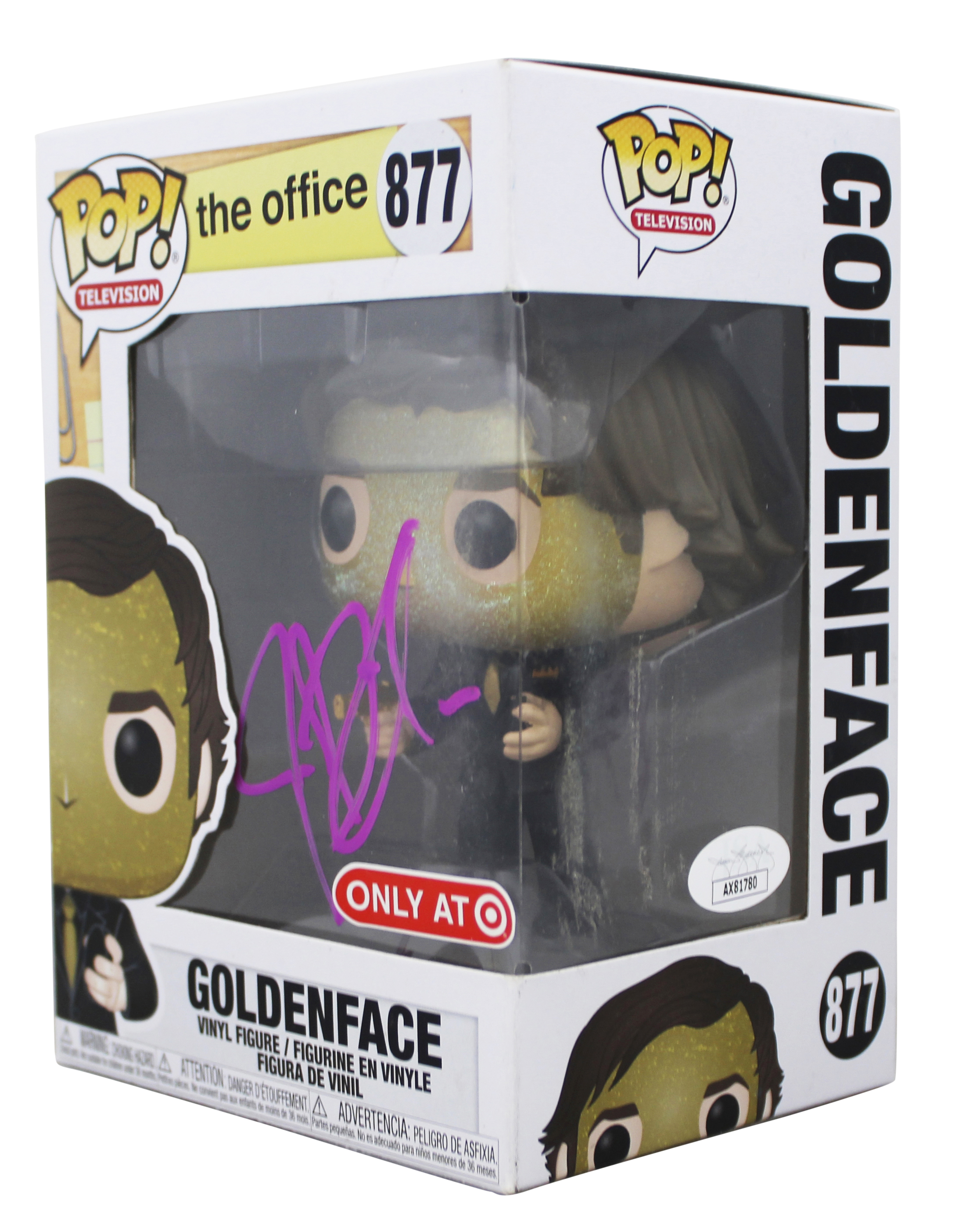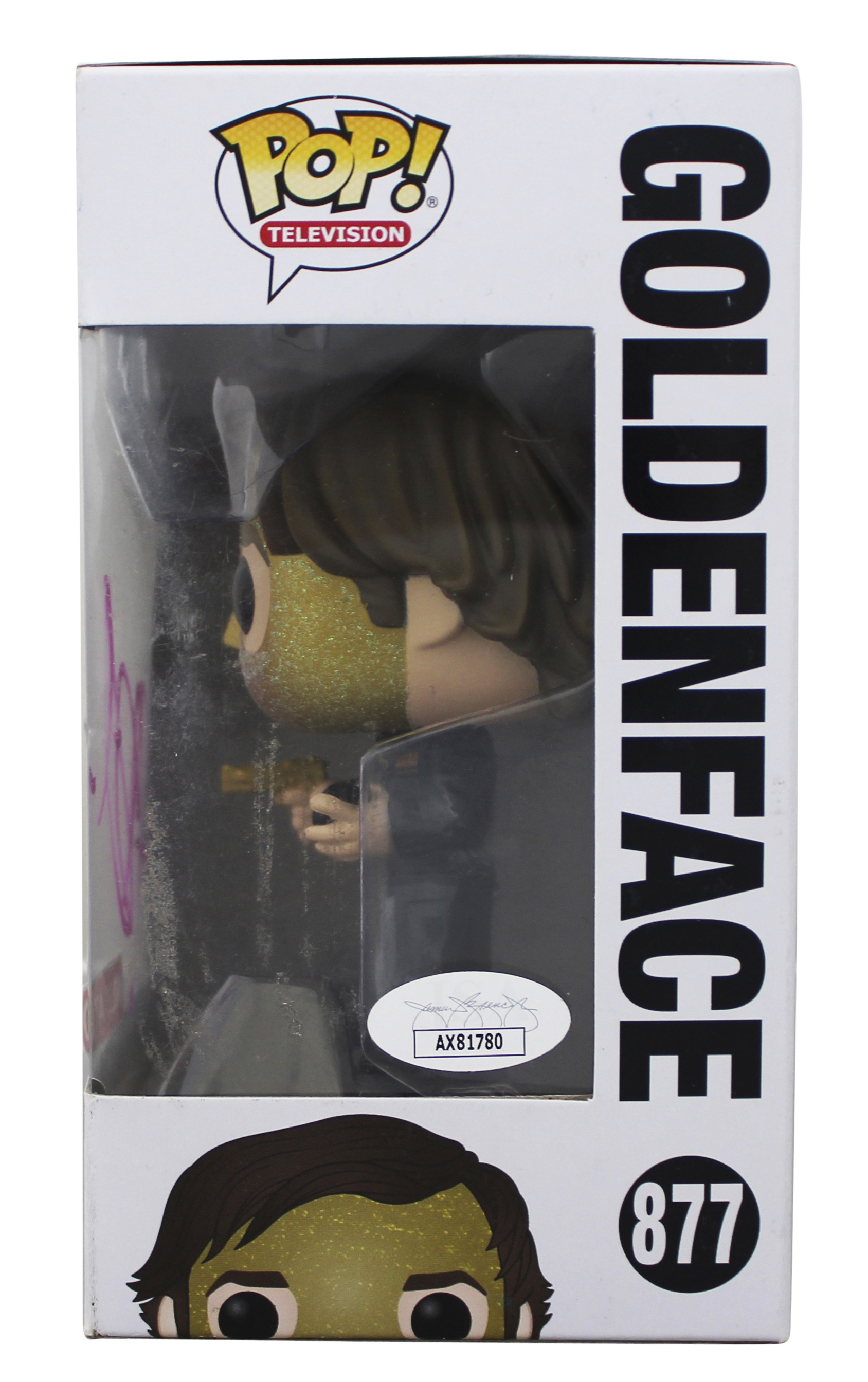 This Autographed Goldenface #877 Funko Pop Vinyl Figure has been Personally Signed by John Krasinski of The Office. This item is 100% Authentic to include a Certificate of Authenticity (COA) / hologram by JSA. The authenticity can be verified on JSA website. This will be shipped in a Pop Protector, each will have some handling wear from shipment to the signing and back. These would not be considered mint. The signature has some smearing and the plastic panels has some light clouding. There is a stray pen mark on the right side panel near the JSA hologram. Please refer to pictures for item's condition prior to purchase.