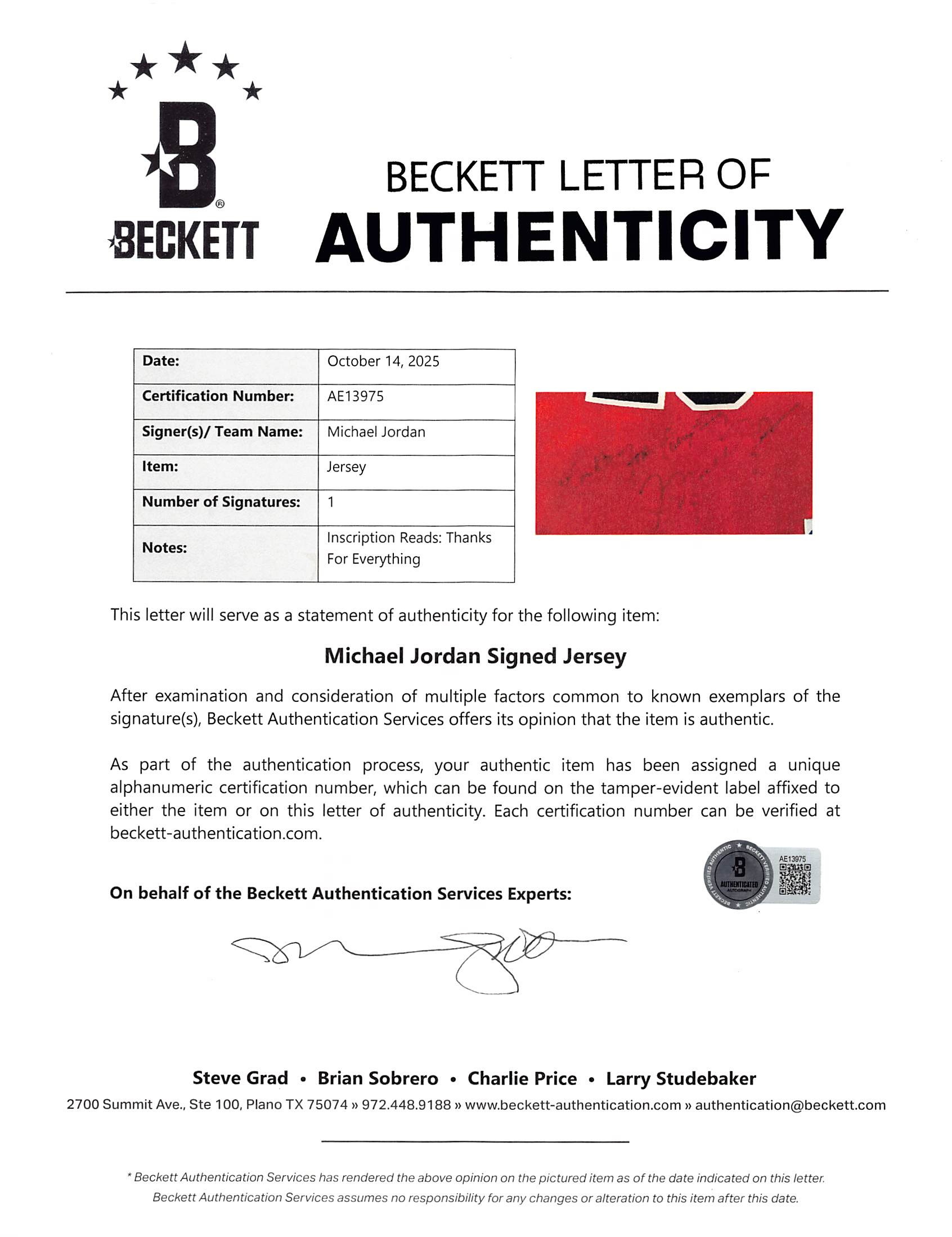 This Autographed Red Champion Size 44 Jersey with the inscription of "Thanks For Everything" has been Personally Signed by Michael Jordan of the Chicago Bulls. This item is 100% Authentic to include a Certificate of Authenticity (COA) / hologram by Beckett Authentication Services. The authenticity can be verified on Beckett Authentication Services website.