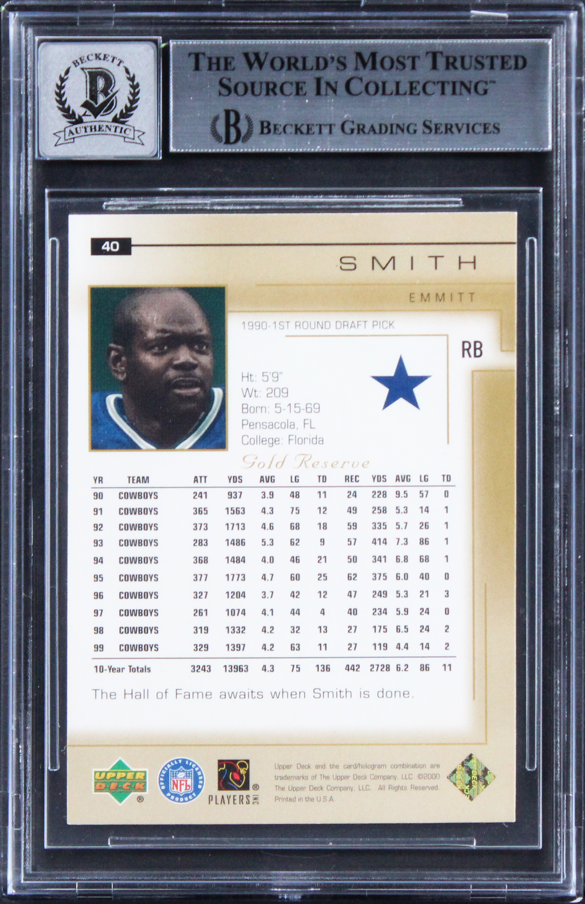This Autographed Auto Graded Gem Mint 10! 2000 Upper Deck Gold Reserve #40 Card has been Personally Signed by Emmitt Smith of the Dallas Cowboys. This item is 100% Authentic, it comes slabbed and authenticated by Beckett Authentication Services. The authenticity can be verified on Beckett Authentication Services website.