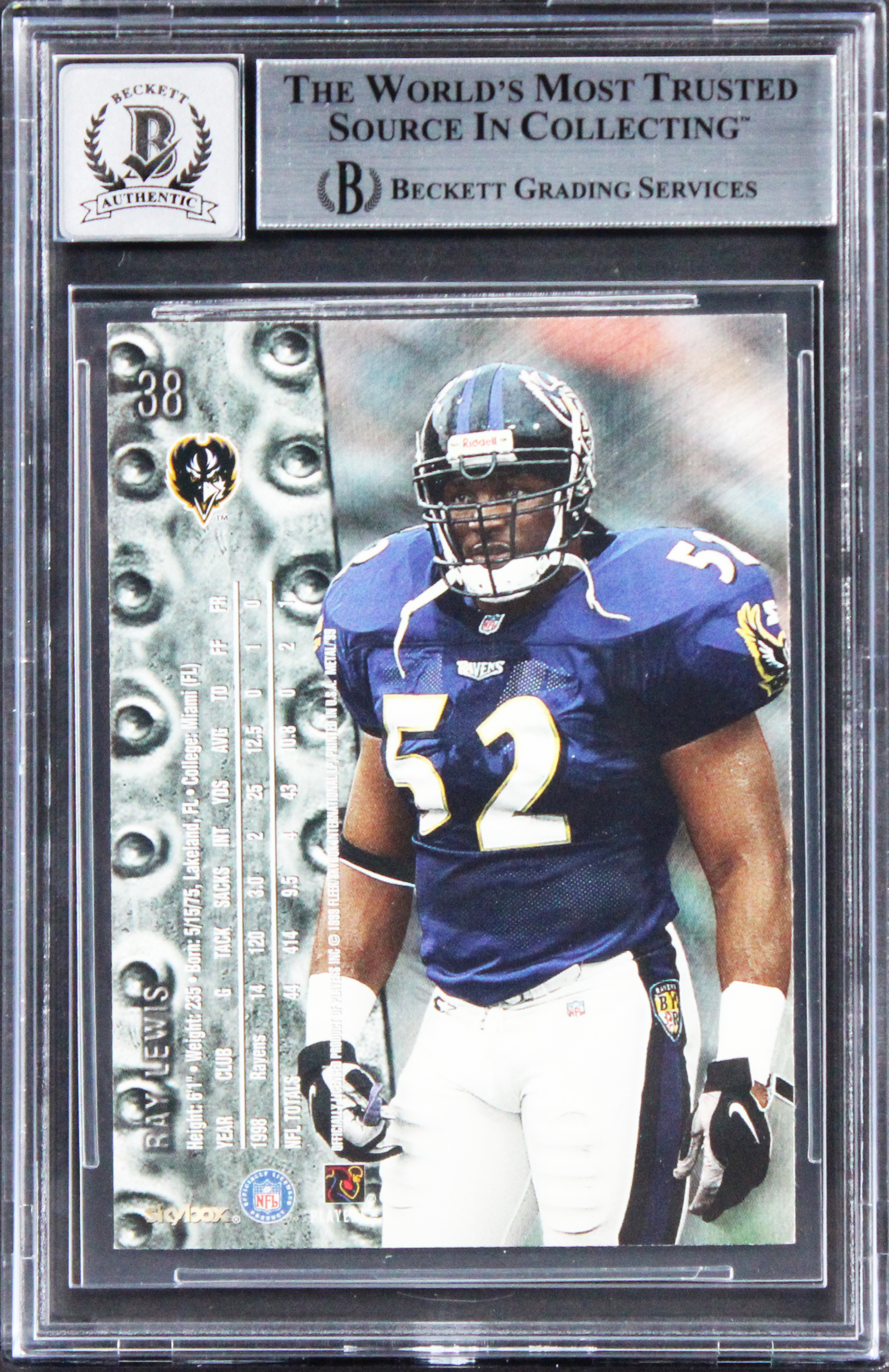 This Autographed Auto Graded Gem Mint 10! 1999 Metal Universe #38 Card has been Personally Signed by Ray Lewis of the Baltimore Ravens. This item is 100% Authentic, it comes slabbed and authenticated by Beckett Authentication Services. The authenticity can be verified on Beckett Authentication Services website.