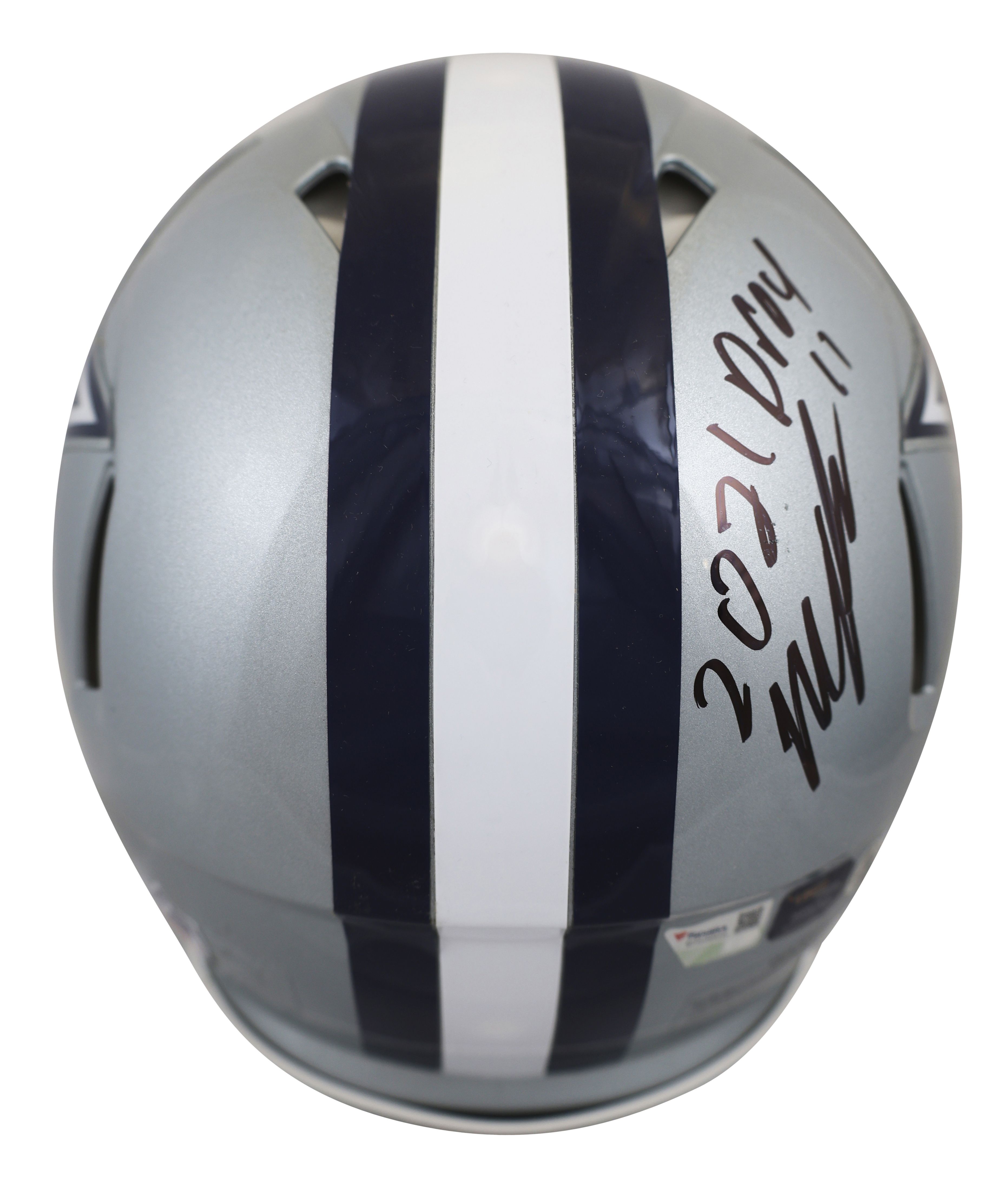 This Autographed Riddell Authentic Full Size Speed Proline Helmet with the inscription of "ROY 2016 (Prescott), ROY 1990 (Smith), ROY 2021 (Parsons), ROY 1977 (Dorsett), ROY 1969 (Hill)" has been Personally Signed by Dak Prescott, Emmitt Smith, Micah Parsons, Tony Dorsett & Calvin Hill of the Dallas Cowboys. This item is 100% Authentic to include a hologram by Beckett Authentication Services. This item will come with an affixed Beckett Authentication Services (BAS) authentication sticker, which includes a scannable QR code to verify authenticity. Please note that Beckett no longer provides serial-numbered COA cards, and the attached BAS sticker will serve as the complete authentication for this item. This is a BAS Witnessed Protection Program item which means a Beckett Authentication Service representative was present when this item was being signed. We conducted an autograph signing with Dak Prescott, Emmitt Smith, Micah Parsons, Tony Dorsett & Calvin Hill where multiples of the same item were signed. While the photographs are representative of this item, the size, placement and strength of the signature may vary. Each item is hand signed, therefore, each autograph is unique. This item can be verified through BAS Witnessed.
