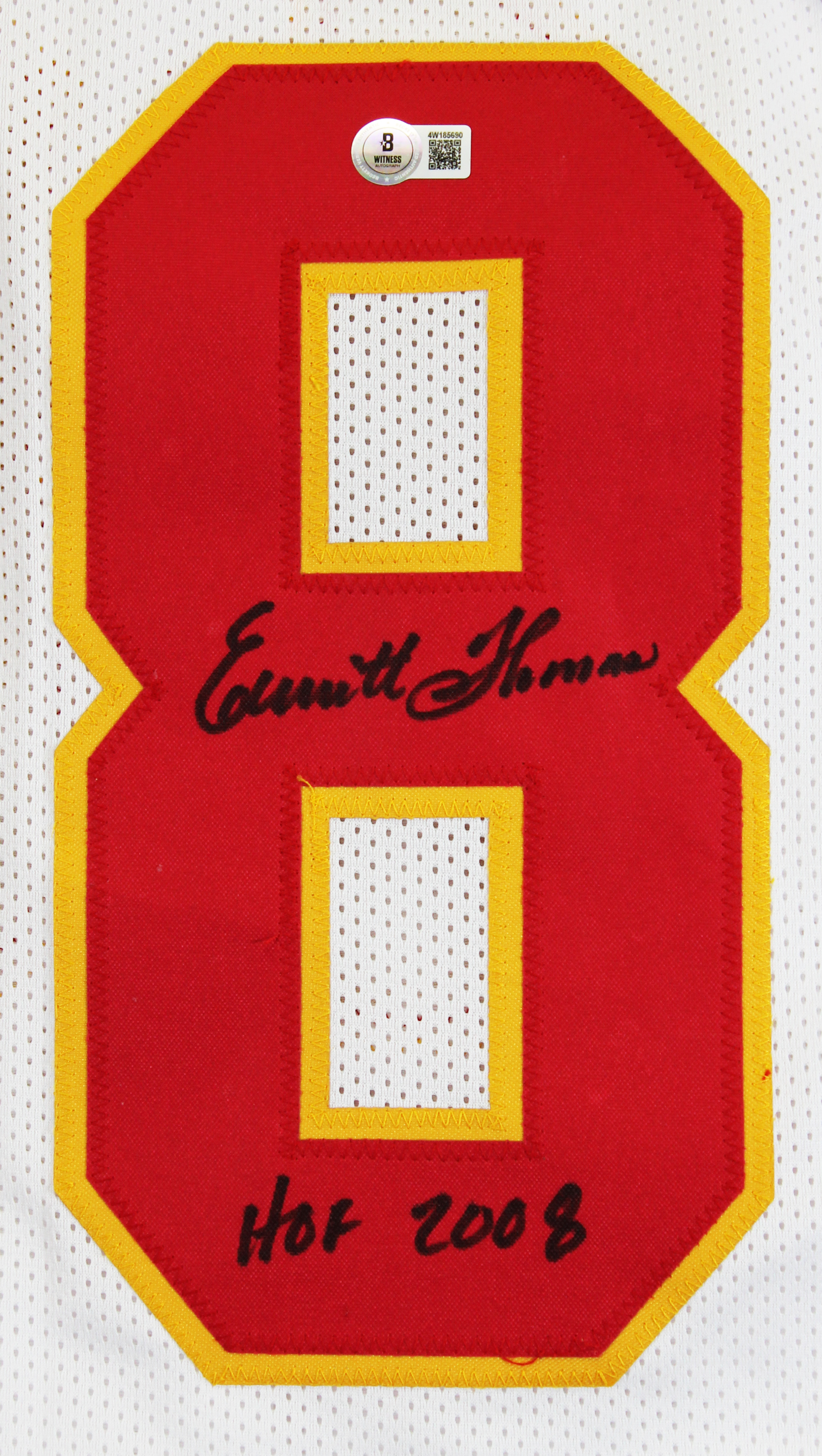 This Autographed White Pro Style Jersey with the inscription of "HOF 2008" has been Personally Signed by Emmitt Thomas of the Kansas City Chiefs. This item is 100% Authentic to include a hologram by Beckett Authentication Services. This item will come with an affixed Beckett Authentication Services (BAS) authentication sticker, which includes a scannable QR code to verify authenticity. Please note that Beckett no longer provides serial-numbered COA cards, and the attached BAS sticker will serve as the complete authentication for this item. This is a BAS Witnessed Protection Program item which means a Beckett Authentication Service representative was present when this item was being signed. We conducted an autograph signing with Emmitt Thomas where multiples of the same item were signed. While the photographs are representative of this item, the size, placement and strength of the signature may vary. Each item is hand signed, therefore, each autograph is unique. This item can be verified through BAS Witnessed. This is a X-Large sized, non-branded, custom-stitched Jersey.