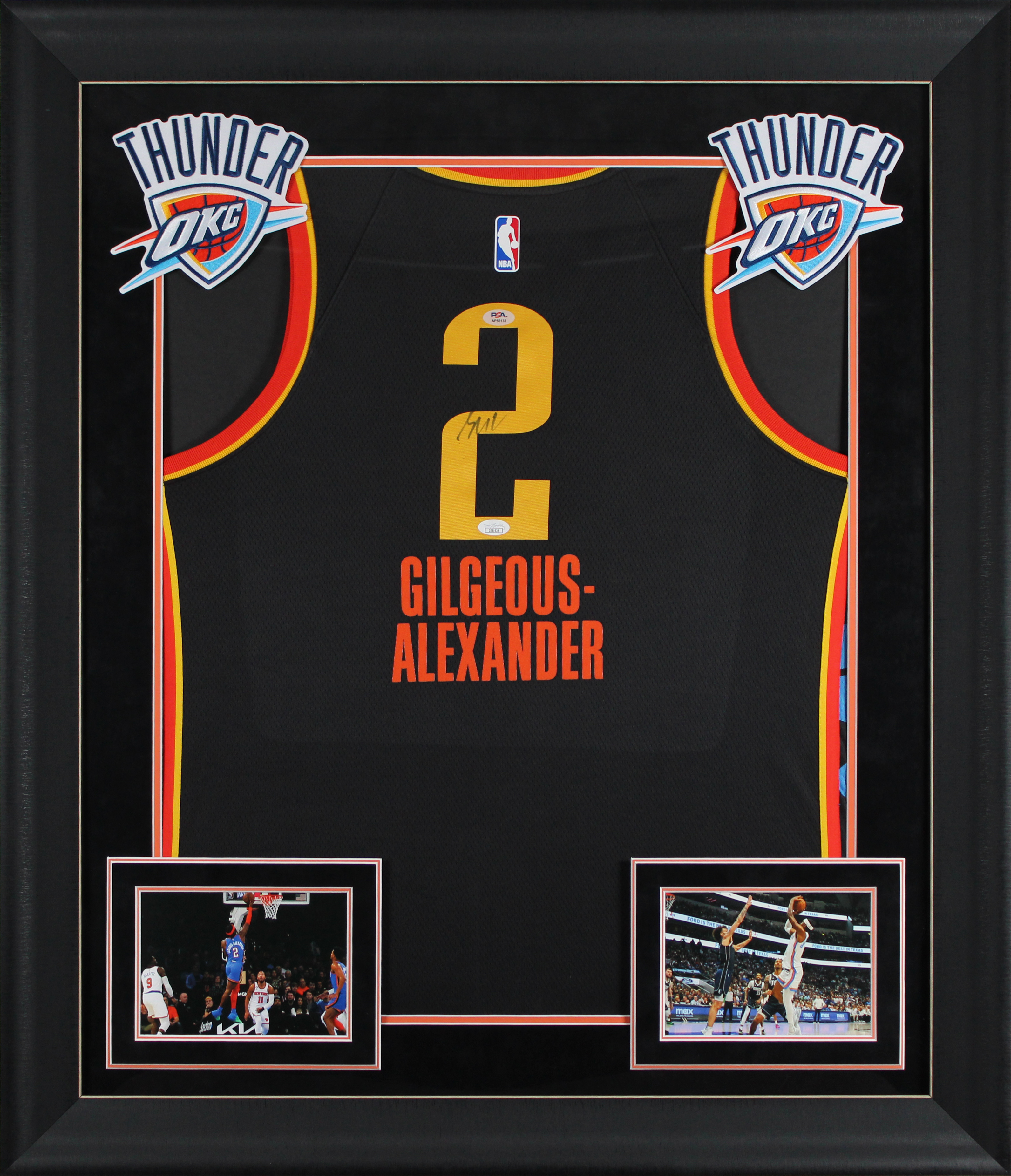 This Autographed Black Nike Swingman Framed Jersey has been Personally Signed by Shai Gilgeous-Alexander of the Oklahoma City Thunder. This item is 100% Authentic and comes with a PSA/DNA Certification Card and a matching numbered Hologram. The authenticity can be verified on Professional Sports Authenticator website. The jersey is also authenticated by JSA, but does not come with the matching numbered COA. This item has been professionally framed to overall dimensions of approximately 32 x 37 inches.