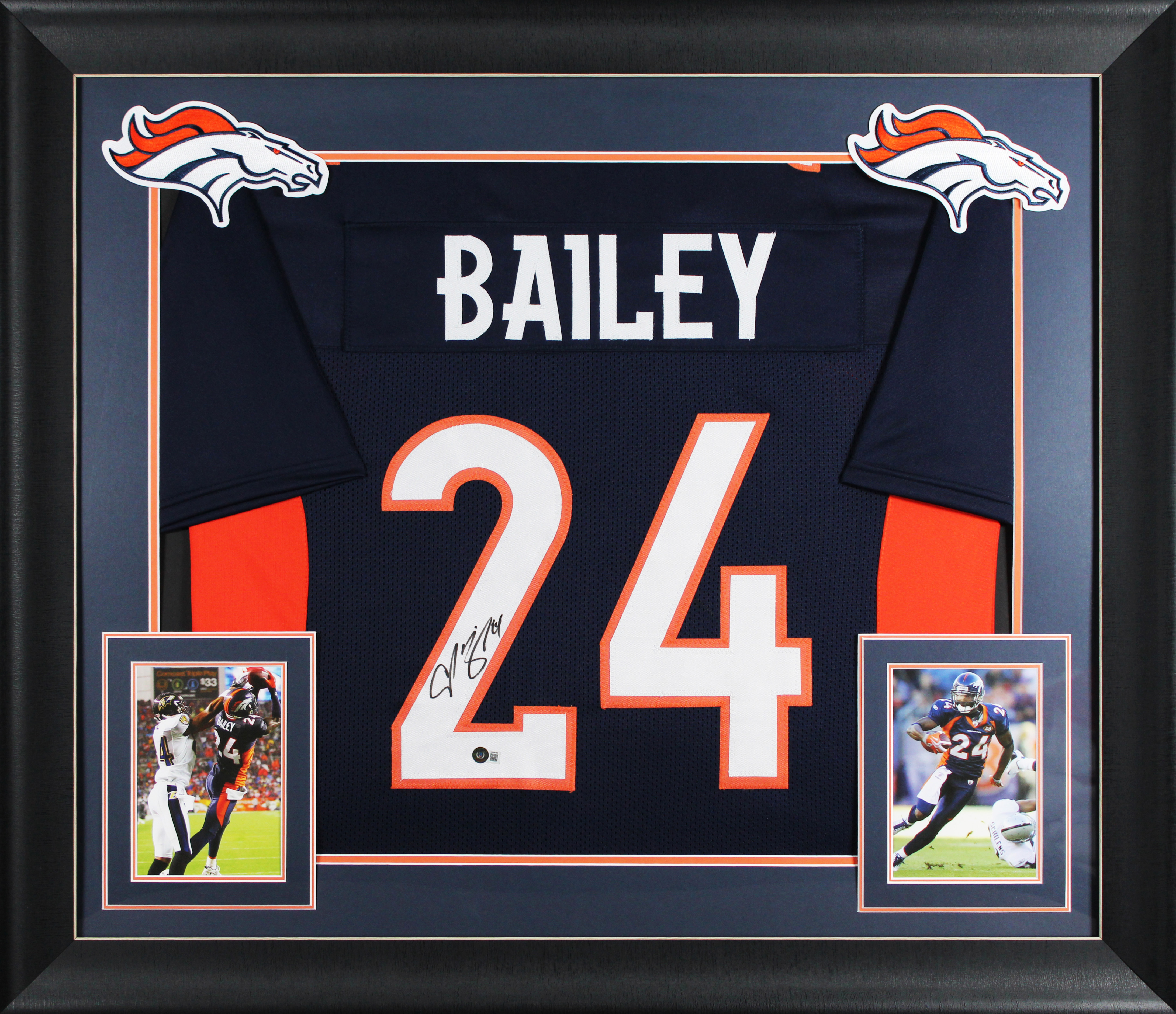 This Autographed Navy Blue Pro Style Framed Jersey has been Personally Signed by Champ Bailey of the Denver Broncos. This item is 100% Authentic to include a hologram by Beckett Authentication Services. This item will come with an affixed Beckett Authentication Services (BAS) authentication sticker, which includes a scannable QR code to verify authenticity. Please note that Beckett no longer provides serial-numbered COA cards, and the attached BAS sticker will serve as the complete authentication for this item. This is a BAS Witnessed Protection Program item which means a Beckett Authentication Service representative was present when this item was being signed. We conducted an autograph signing with Champ Bailey where multiples of the same item were signed. While the photographs are representative of this item, the size, placement and strength of the signature may vary. Each item is hand signed, therefore, each autograph is unique. This item can be verified through BAS Witnessed. This item has been professionally framed to overall dimensions of approximately 32 x 37 inches. This is a X-Large sized, non-branded, custom-stitched Framed Jersey. This jersey will be framed to order, it will take approximately 3-4 business days from purchase date for it to ship.