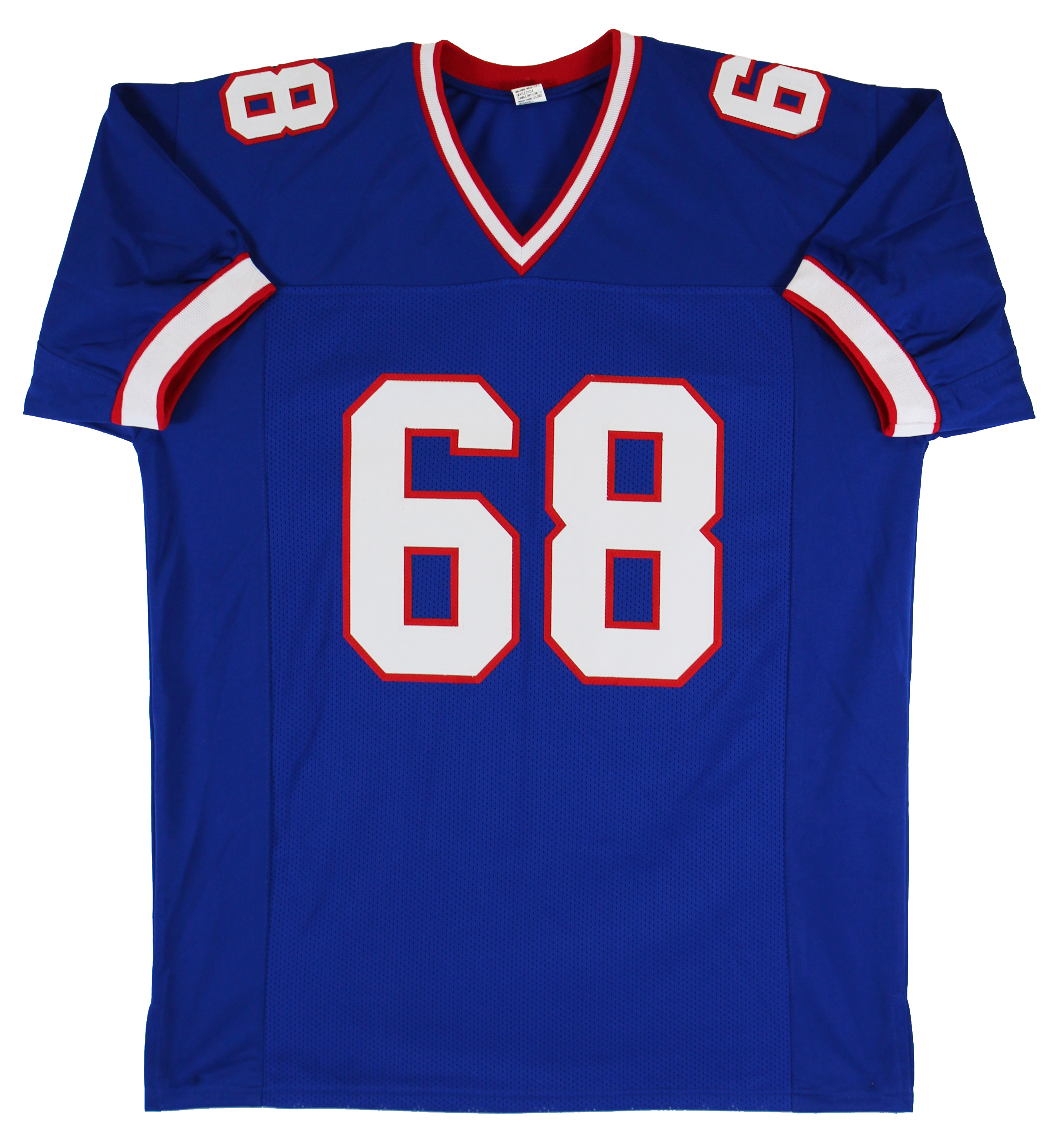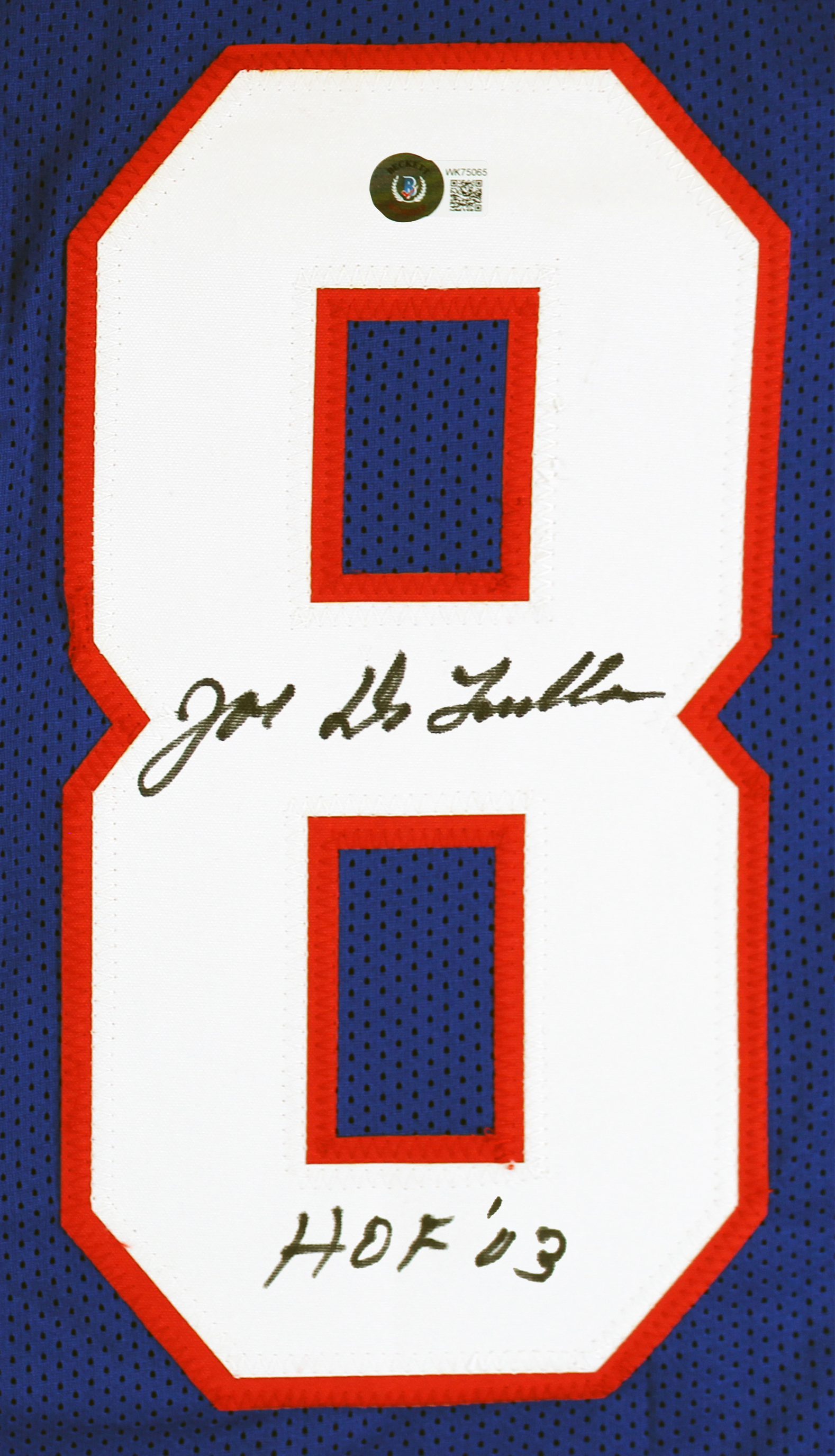 This Autographed Blue Pro Style Jersey with the inscription of "HOF 03" has been Personally Signed by Joe DeLamielleure of the Buffalo Bills. This item is 100% Authentic to include a hologram by Beckett Authentication Services. This item will come with an affixed Beckett Authentication Services (BAS) authentication sticker, which includes a scannable QR code to verify authenticity. Please note that Beckett no longer provides serial-numbered COA cards, and the attached BAS sticker will serve as the complete authentication for this item. This is a BAS Witnessed Protection Program item which means a Beckett Authentication Service representative was present when this item was being signed. We conducted an autograph signing with Joe DeLamielleure where multiples of the same item were signed. While the photographs are representative of this item, the size, placement and strength of the signature may vary. Each item is hand signed, therefore, each autograph is unique. This item can be verified through BAS Witnessed. This is a X-Large sized, non-branded, custom-stitched Jersey.