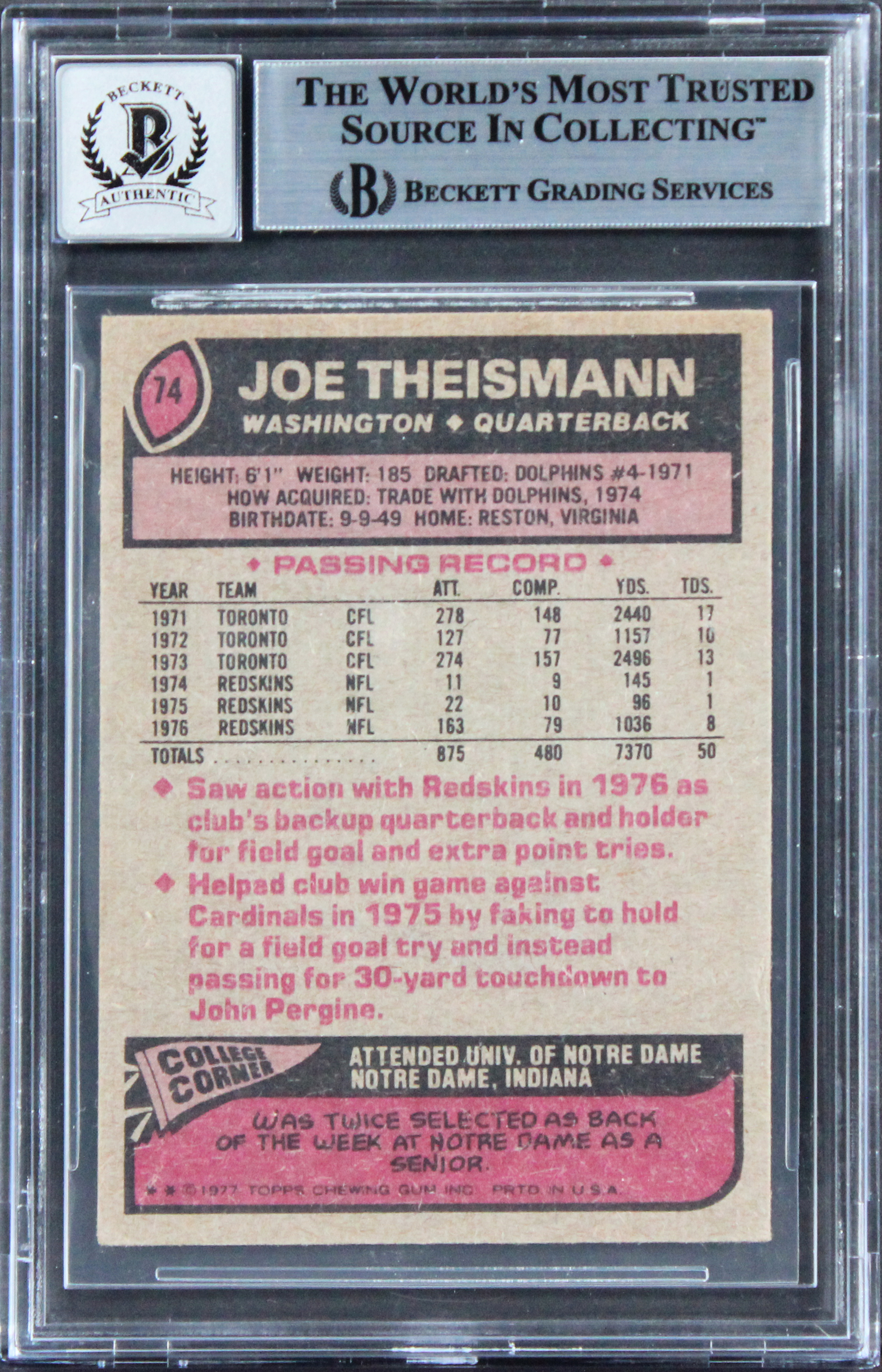 This Autographed Auto Graded Gem Mint 10! 1977 Topps #74 Card has been Personally Signed by Joe Theismann of the Washington Commanders. This item is 100% Authentic, it comes slabbed and authenticated by Beckett Authentication Services. The authenticity can be verified on Beckett Authentication Services website.
