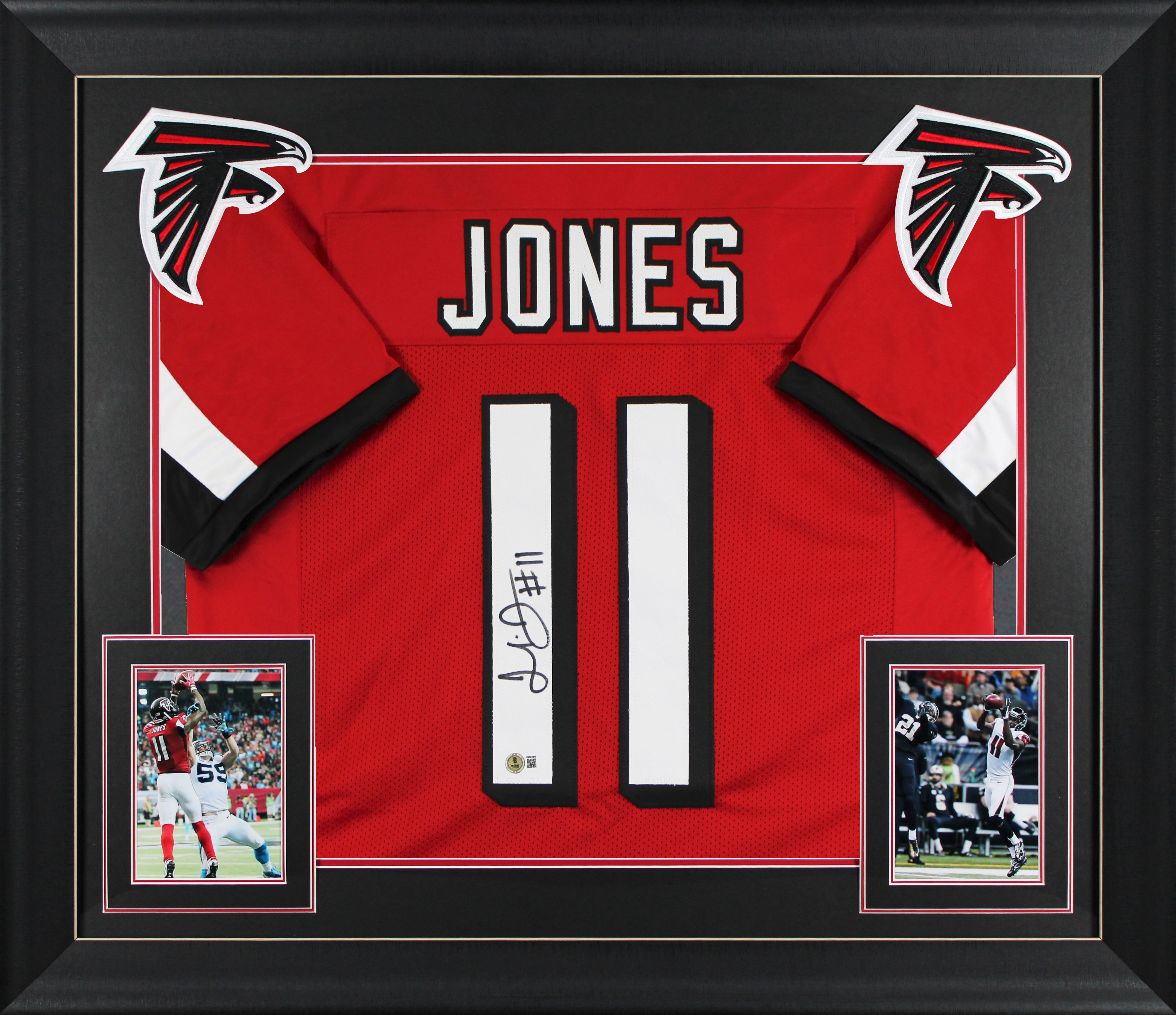 This Autographed Red Pro Style Framed Jersey has been Personally Signed by Julio Jones of the Atlanta Falcons. This item is 100% Authentic to include a hologram by Beckett Authentication Services. This item will come with an affixed Beckett Authentication Services (BAS) authentication sticker, which includes a scannable QR code to verify authenticity. Please note that Beckett no longer provides serial-numbered COA cards, and the attached BAS sticker will serve as the complete authentication for this item. This is a BAS Witnessed Protection Program item which means a Beckett Authentication Service representative was present when this item was being signed. We conducted an autograph signing with Julio Jones where multiples of the same item were signed. While the photographs are representative of this item, the size, placement and strength of the signature may vary. Each item is hand signed, therefore, each autograph is unique. This item can be verified through BAS Witnessed. This item has been professionally framed to overall dimensions of approximately 32 x 37 inches. This is a X-Large sized, non-branded, custom-stitched Framed Jersey. This jersey will be framed to order, it will take approximately 3-4 business days from purchase date for it to ship.