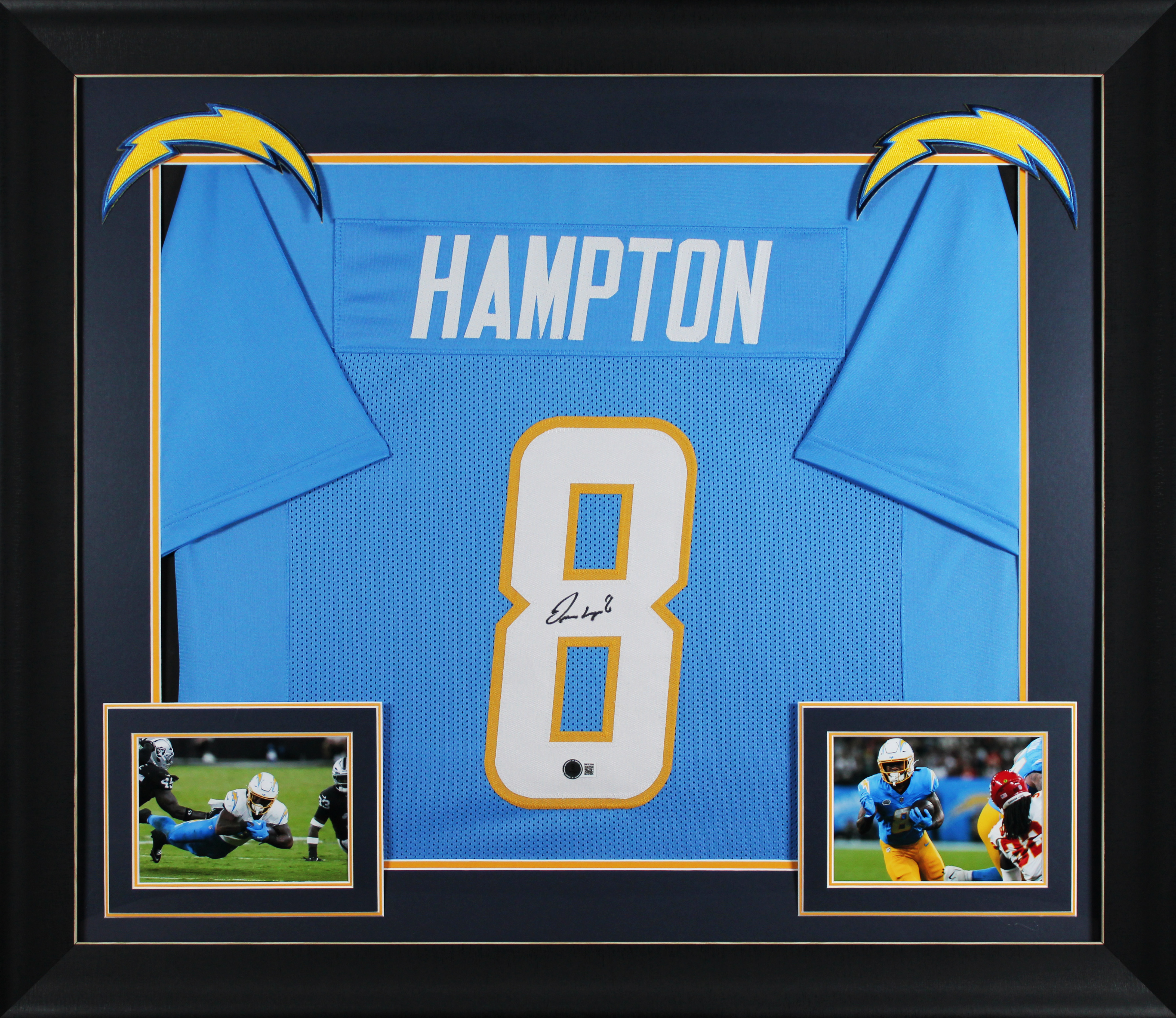 This Autographed Powder Blue Pro Style Framed Jersey has been Personally Signed by Omarion Hampton of the Los Angeles Chargers. This item is 100% Authentic to include a hologram by Beckett Authentication Services. This item will come with an affixed Beckett Authentication Services (BAS) authentication sticker, which includes a scannable QR code to verify authenticity. Please note that Beckett no longer provides serial-numbered COA cards, and the attached BAS sticker will serve as the complete authentication for this item. This is a BAS Witnessed Protection Program item which means a Beckett Authentication Service representative was present when this item was being signed. We conducted an autograph signing with Omarion Hampton where multiples of the same item were signed. While the photographs are representative of this item, the size, placement and strength of the signature may vary. Each item is hand signed, therefore, each autograph is unique. This item can be verified through BAS Witnessed. This item has been professionally framed to overall dimensions of approximately 32 x 37 inches. This is a X-Large sized, non-branded, custom-stitched Framed Jersey. This jersey will be framed to order, it will take approximately 3-4 business days from purchase date for it to ship.