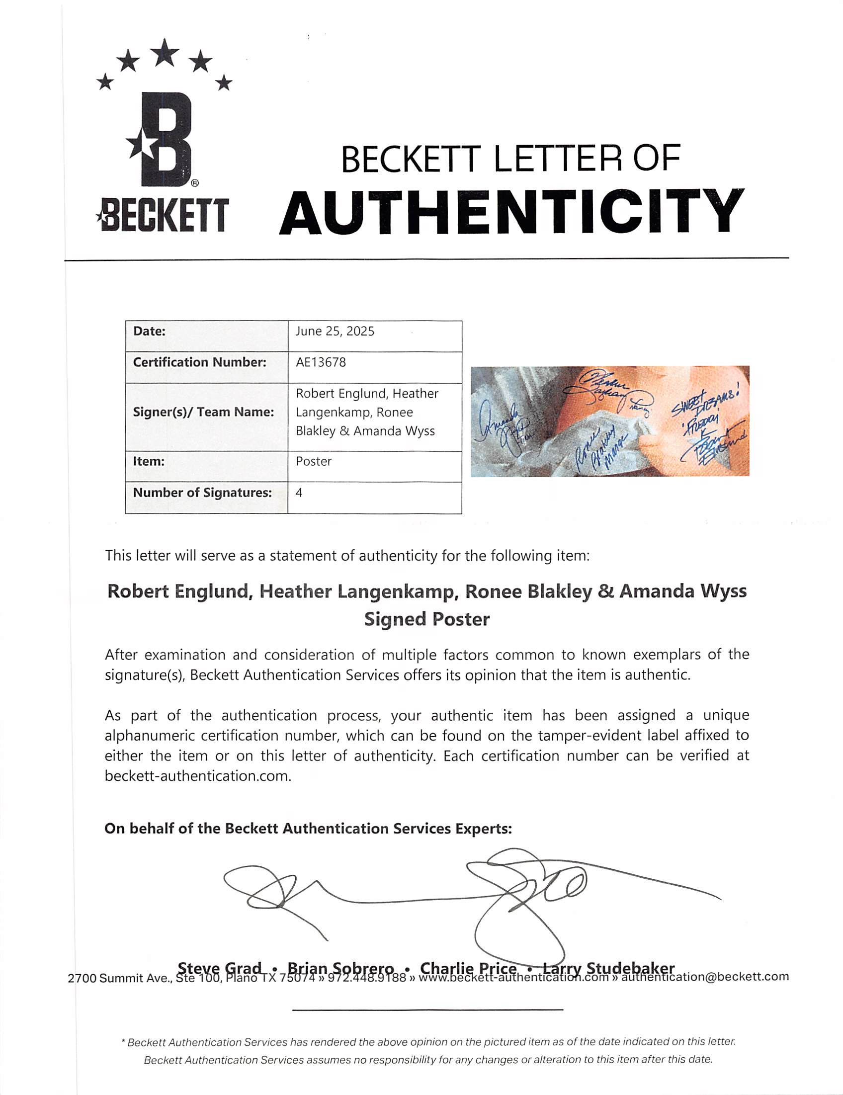 This Autographed 27x40 Poster with the inscription of "Sweet Dreamz "Freddy K" (Englund), Nancy (Langenkamp), Tina (Wyss), Marge (Blakley)" has been Personally Signed by Robert Englund, Heather Langenkamp, Amanda Wyss & Ronnee Blakley of A Nightmare on Elm Street. This item is 100% Authentic to include a Certificate of Authenticity (COA) / hologram by Beckett Authentication Services. We have multiples of this same item. While the photographs are representative of this item, the size, placement and strength of the signature may vary. Each item is hand signed, therefore, each autograph is unique. Sample Letter of Authenticity attached.