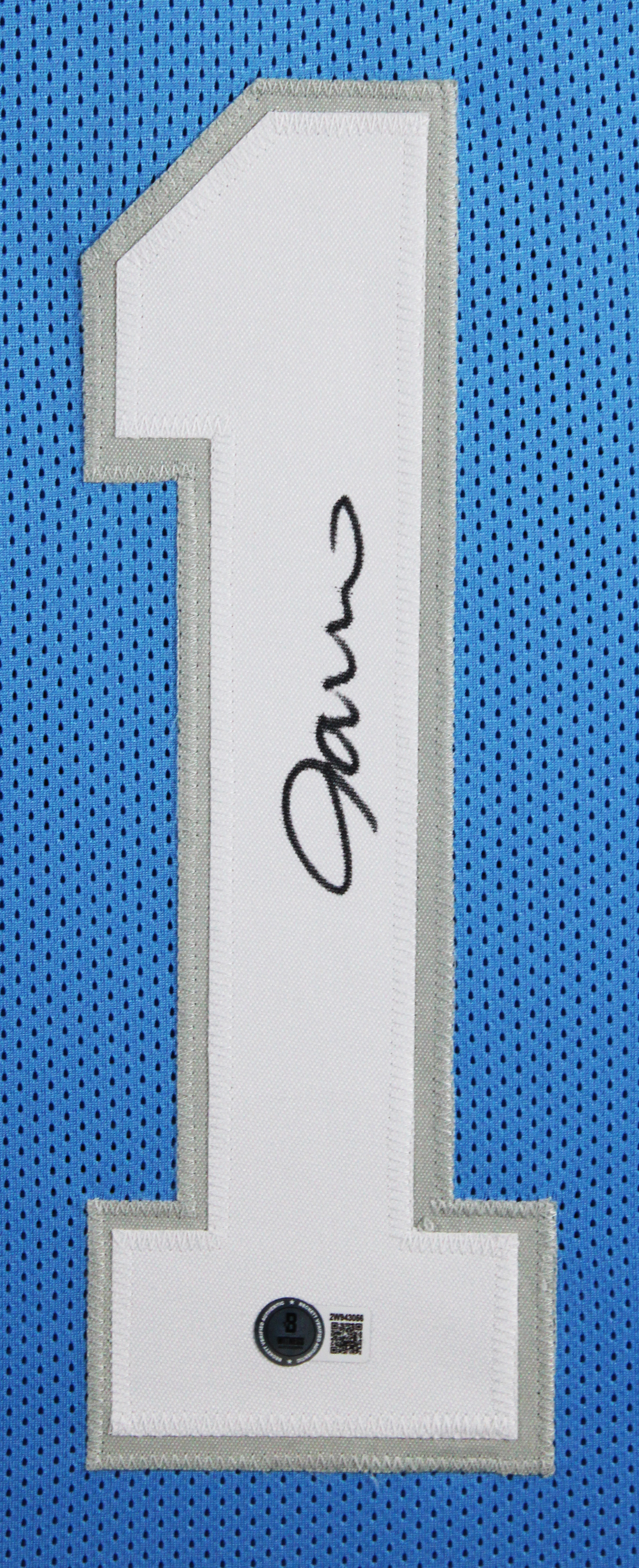 This Autographed Blue Pro Style Framed Jersey has been Personally Signed by Jameson Williams of the Detroit Lions. This item is 100% Authentic to include a hologram by Beckett Authentication Services. This item will come with an affixed Beckett Authentication Services (BAS) authentication sticker, which includes a scannable QR code to verify authenticity. Please note that Beckett no longer provides serial-numbered COA cards, and the attached BAS sticker will serve as the complete authentication for this item. This is a BAS Witnessed Protection Program item which means a Beckett Authentication Service representative was present when this item was being signed. We conducted an autograph signing with Jameson Williams where multiples of the same item were signed. While the photographs are representative of this item, the size, placement and strength of the signature may vary. Each item is hand signed, therefore, each autograph is unique. This item can be verified through BAS Witnessed. This item has been professionally framed to overall dimensions of approximately 32 x 37 inches. This is a X-Large sized, non-branded, custom-stitched Framed Jersey. This jersey will be framed to order, it will take approximately 3-4 business days from purchase date for it to ship.