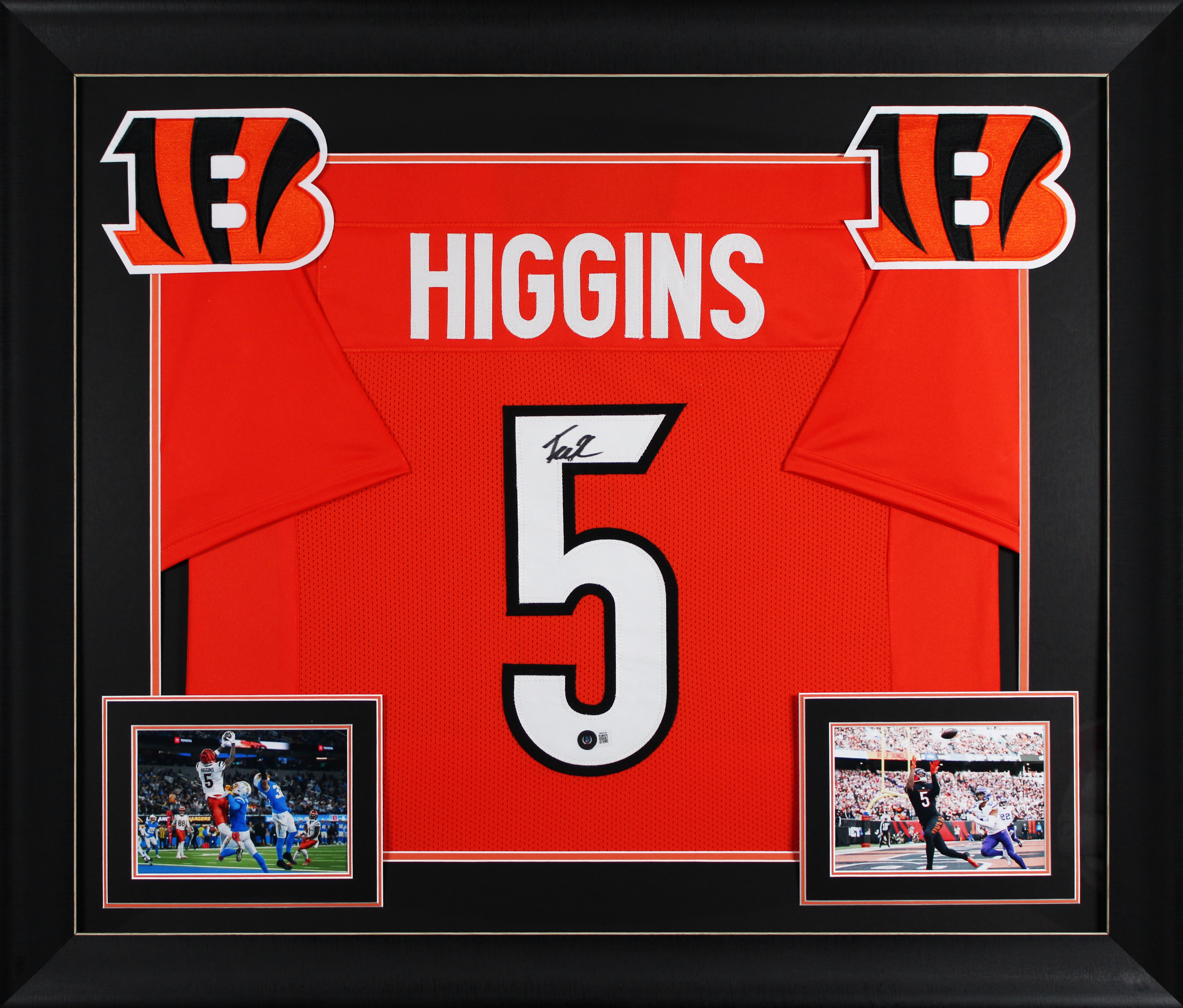 This Autographed Orange Pro Style Framed Jersey has been Personally Signed by Tee Higgins of the Cincinnati Bengals. This item is 100% Authentic to include a hologram by Beckett Authentication Services. This item will come with an affixed Beckett Authentication Services (BAS) authentication sticker, which includes a scannable QR code to verify authenticity. Please note that Beckett no longer provides serial-numbered COA cards, and the attached BAS sticker will serve as the complete authentication for this item. This is a BAS Witnessed Protection Program item which means a Beckett Authentication Service representative was present when this item was being signed. We conducted an autograph signing with Tee Higgins where multiples of the same item were signed. While the photographs are representative of this item, the size, placement and strength of the signature may vary. Each item is hand signed, therefore, each autograph is unique. This item can be verified through BAS Witnessed. This item has been professionally framed to overall dimensions of approximately 32 x 37 inches. This is a X-Large sized, non-branded, custom-stitched Framed Jersey. This jersey will be framed to order, it will take 3-4 days from purchase date for it to ship.