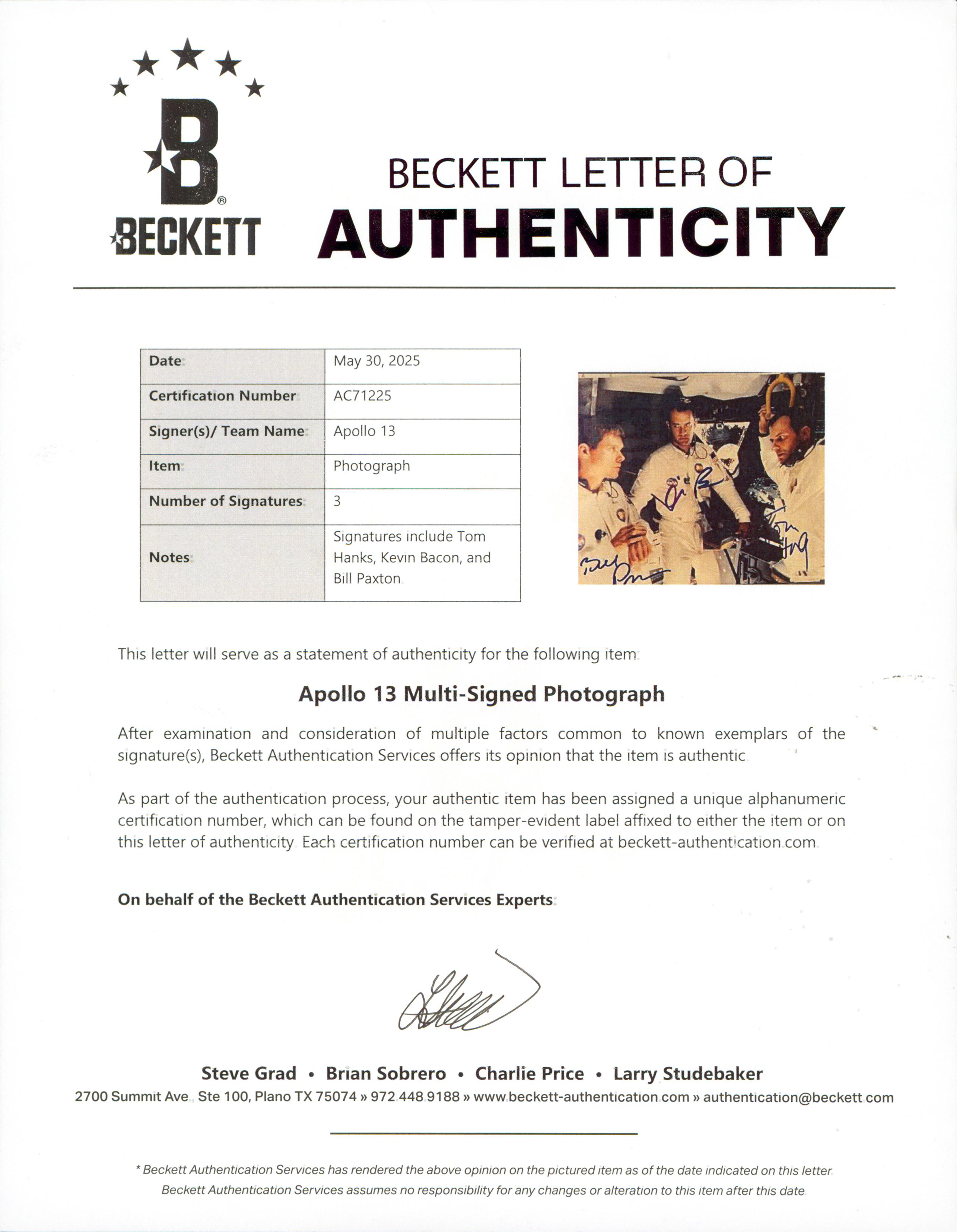 This Autographed 8x10 Framed Photo has been Personally Signed by Tom Hanks, Kevin Bacon, & Bill Paxton of Apollo 13. This item is 100% Authentic to include a Certificate of Authenticity (COA) / hologram by Beckett Authentication Services. The authenticity can be verified on Beckett Authentication Services website. This item has been professionally framed to overall dimensions of approximately 27.5 x 37.5 inches.