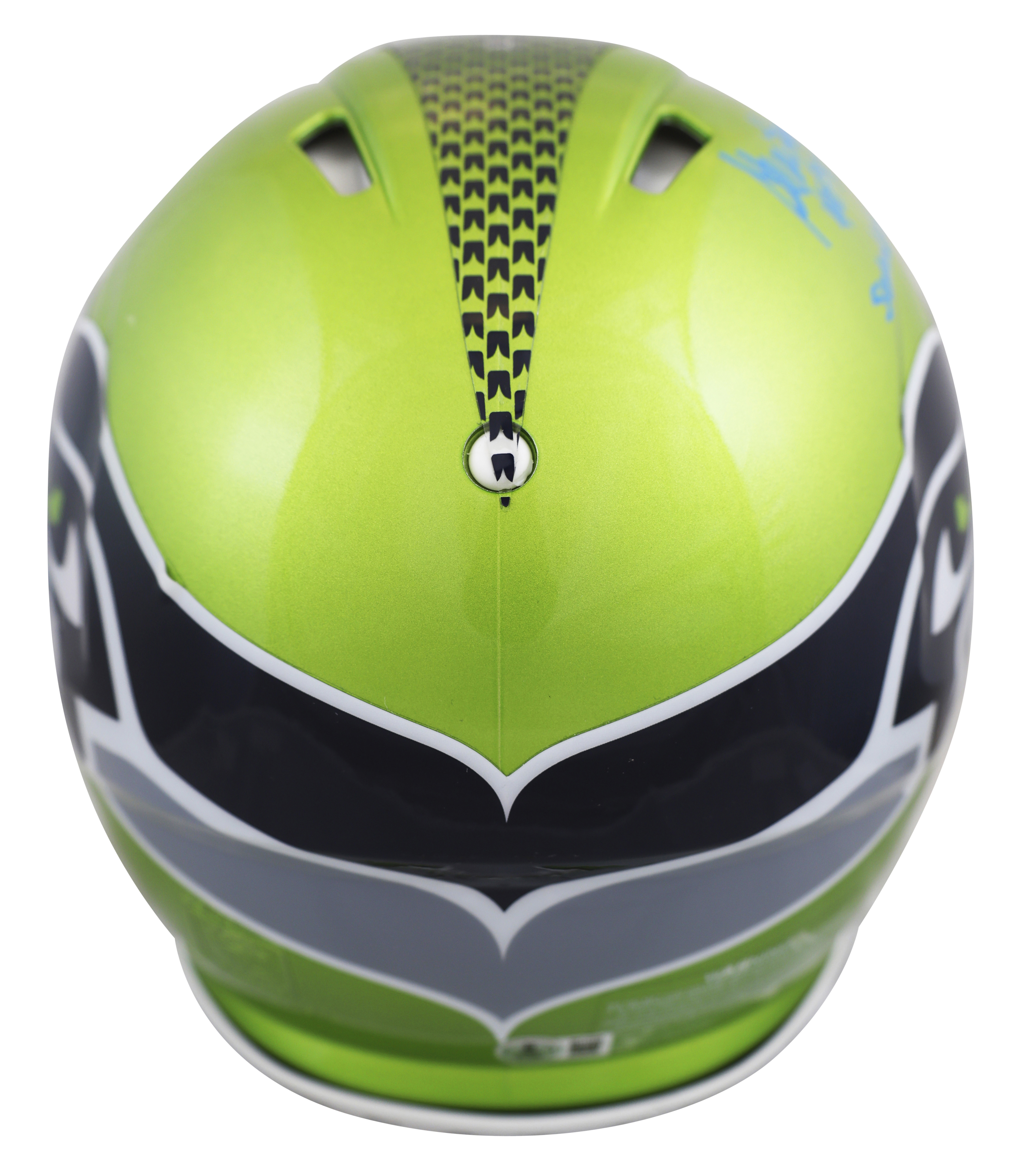 This Autographed Alternate Flash Riddell Authentic Full Size Speed Proline Helmet with the inscription of "HOF 1995, Seahawks Triple Crown, 819 Recs, 13,089 Yds, 100 TD's" has been Personally Signed by Steve Largent of the Seattle Seahawks. This item is 100% Authentic to include a hologram by Beckett Authentication Services. This item will come with an affixed Beckett Authentication Services (BAS) authentication sticker, which includes a scannable QR code to verify authenticity. Please note that Beckett no longer provides serial-numbered COA cards, and the attached BAS sticker will serve as the complete authentication for this item. This is a BAS Witnessed Protection Program item which means a Beckett Authentication Service representative was present when this item was being signed. We conducted an autograph signing with Steve Largent where multiples of the same item were signed. While the photographs are representative of this item, the size, placement and strength of the signature may vary. Each item is hand signed, therefore, each autograph is unique. This item can be verified through BAS Witnessed.