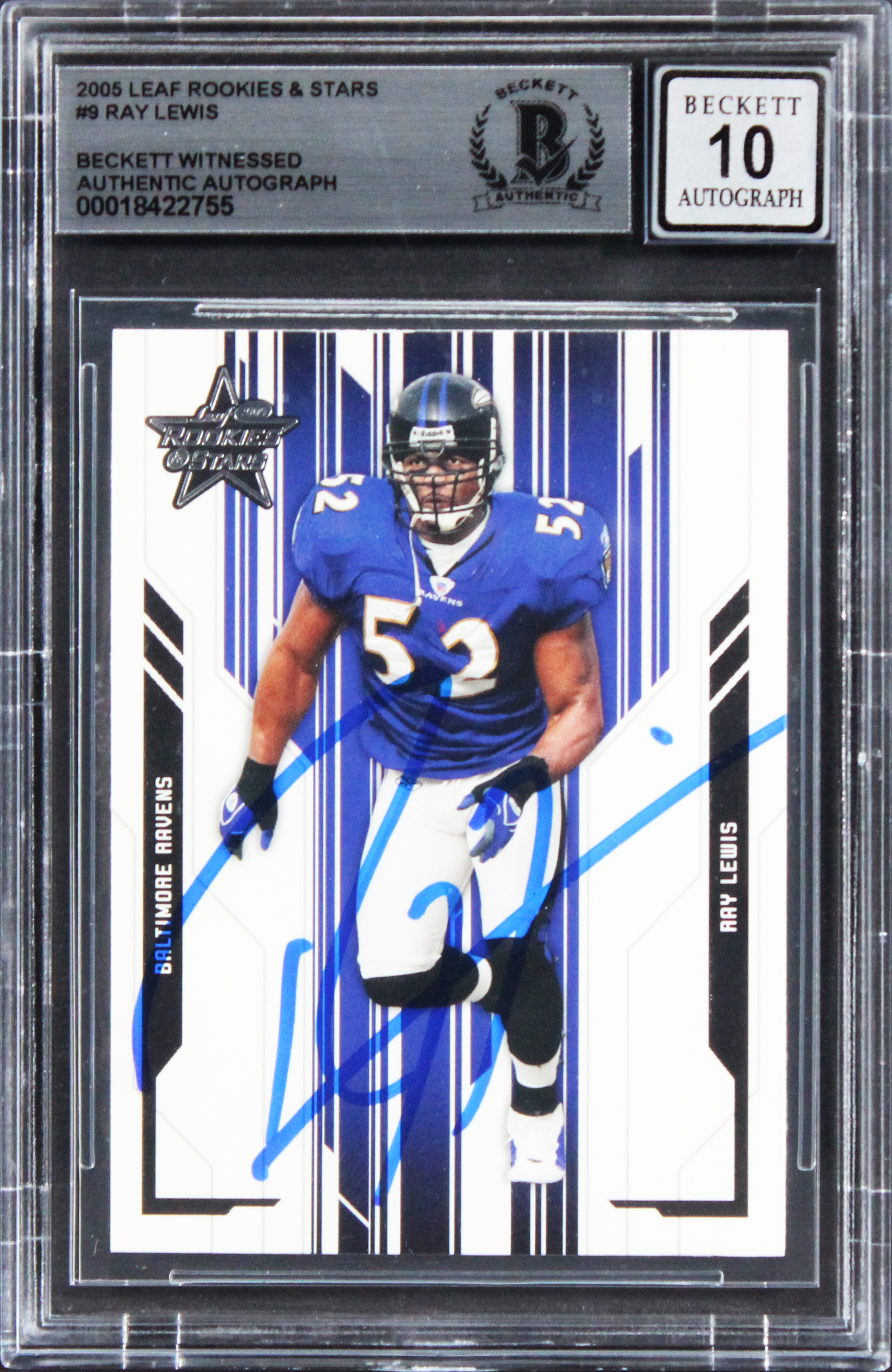 This Autographed Auto Graded Gem Mint 10! 2005 Leaf Rookies & Stars #9 Card has been Personally Signed by Ray Lewis of the Baltimore Ravens. This item is 100% Authentic, it comes slabbed and authenticated by Beckett Authentication Services. We conducted an autograph signing with Ray Lewis where multiples of the same item were signed. While the photographs are representative of this item, the size, placement and strength of the signature may vary. Each item is hand signed, therefore, each autograph is unique. This item can be verified through BAS Slabbed.