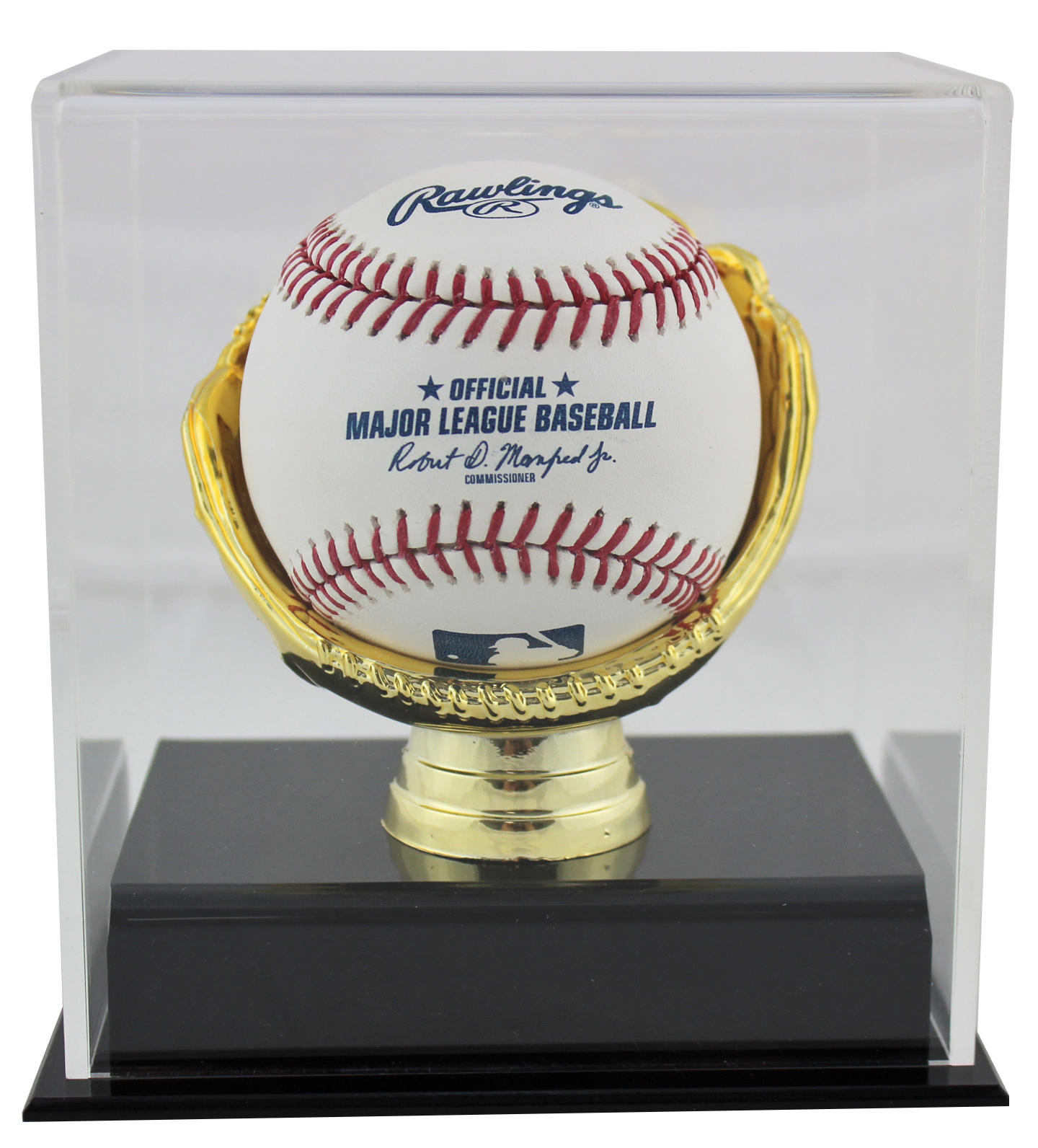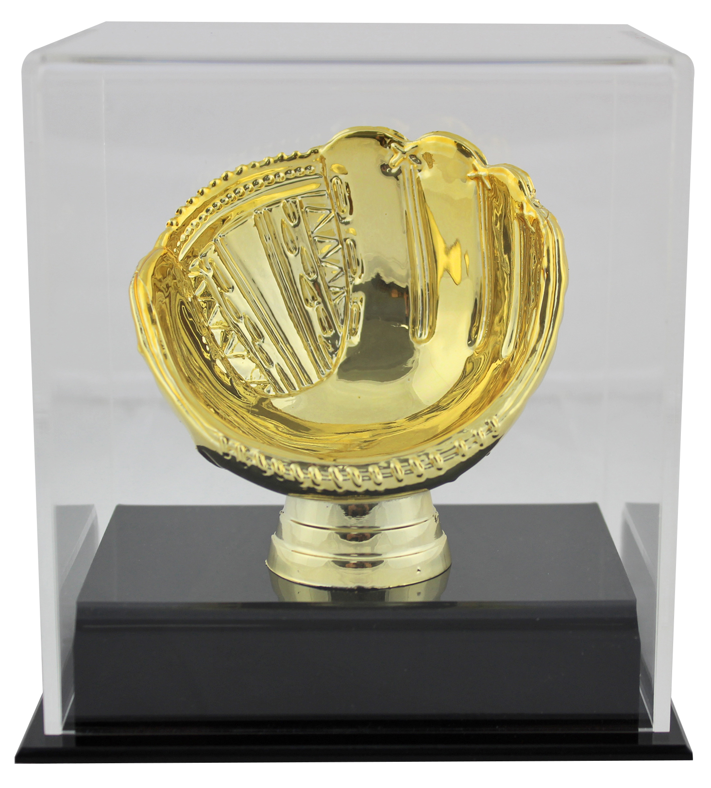This is a Deluxe Acrylic Gold Glove Baseball Display Case. This is a stock item in which we have several available. The one you will receive will be of equal quality to the one pictured. ��������� Hand-made acrylic baseball display��������� Made with high clarity acrylic with UV protection��������� Clear acrylic cover with elevated black acrylic base��������� Gold glove riser to hold the baseball in place��������� Each holds 1 regulation sized MLB, NCAA, high school, little league baseball��������� Exterior dimensions: 5 1/16" x 4 1/8" x 5 1/2"��������� Interior dimensions: 4 1/2" x 3 9/16" x 4"��������� 1 per box��������� Baseball in photo not included with product