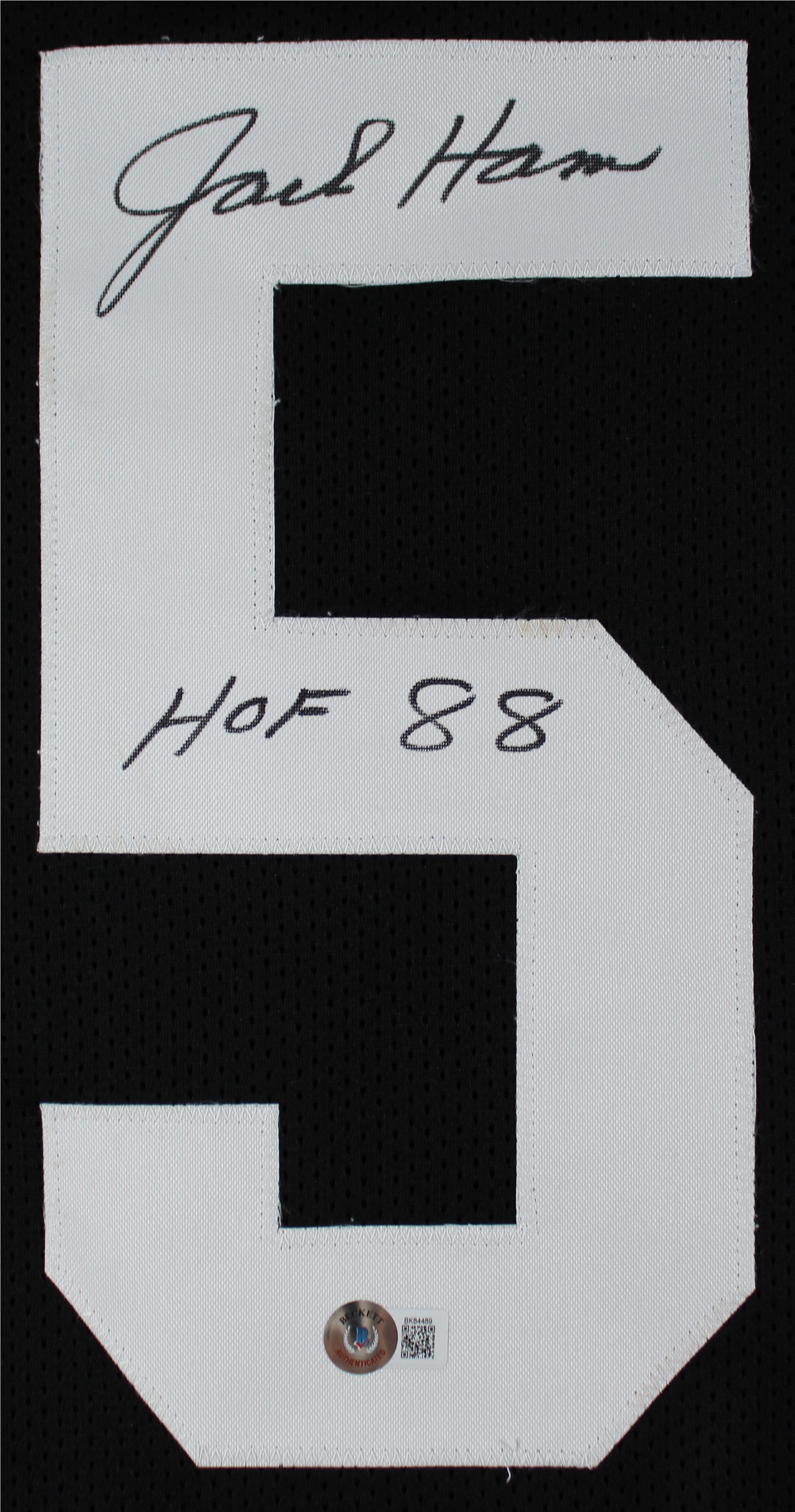 This Autographed Black Pro Style Framed Jersey with the inscription of "HOF 88" has been Personally Signed by Jack Ham of the Pittsburgh Steelers. This item is 100% Authentic to include a hologram by Beckett Authentication Services. This item will come with an affixed Beckett Authentication Services (BAS) authentication sticker, which includes a scannable QR code to verify authenticity. Please note that Beckett no longer provides serial-numbered COA cards, and the attached BAS sticker will serve as the complete authentication for this item. We conducted an autograph signing with Jack Ham where multiples of the same item were signed. While the photographs are representative of this item, the size, placement and strength of the signature may vary. Each item is hand signed, therefore, each autograph is unique. This item can be verified through BAS. This item has been professionally framed to overall dimensions of approximately 32 x 37 inches. This is a X-Large sized, non-branded, custom-stitched Framed Jersey. This jersey will be framed to order, it will take approximately 3-4 business days from purchase date for it to ship.