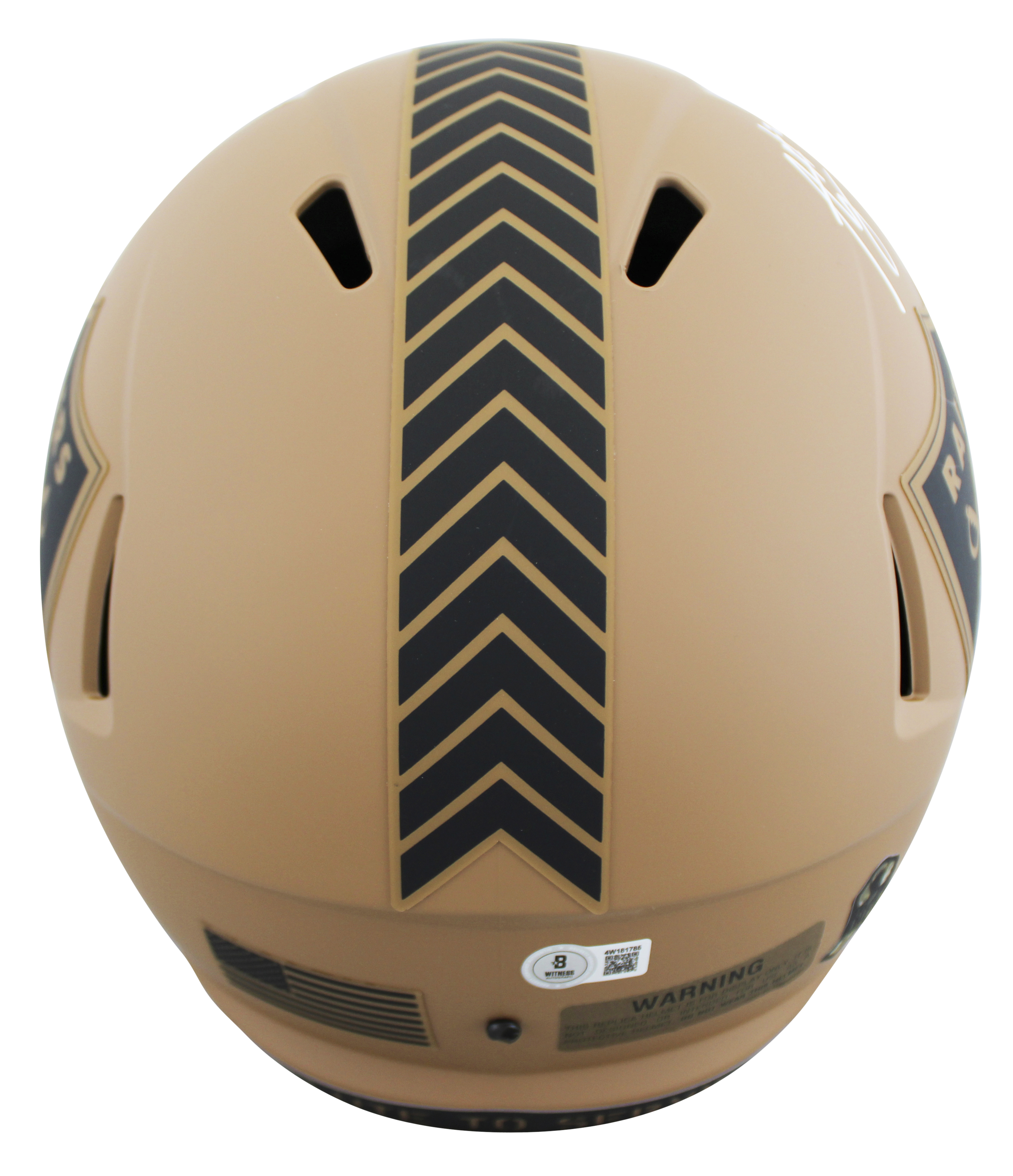 This Autographed Alternate 2023 Salute To Service II Riddell Full Size Speed Rep Helmet has been Personally Signed by Ashton Jeanty of the Las Vegas Raiders. This item is 100% Authentic to include a hologram by Beckett Authentication Services. This item will come with an affixed Beckett Authentication Services (BAS) authentication sticker, which includes a scannable QR code to verify authenticity. Please note that Beckett no longer provides serial-numbered COA cards, and the attached BAS sticker will serve as the complete authentication for this item. This is a BAS Witnessed Protection Program item which means a Beckett Authentication Service representative was present when this item was being signed. We conducted an autograph signing with Ashton Jeanty where multiples of the same item were signed. While the photographs are representative of this item, the size, placement and strength of the signature may vary. Each item is hand signed, therefore, each autograph is unique. This item can be verified through BAS Witnessed.