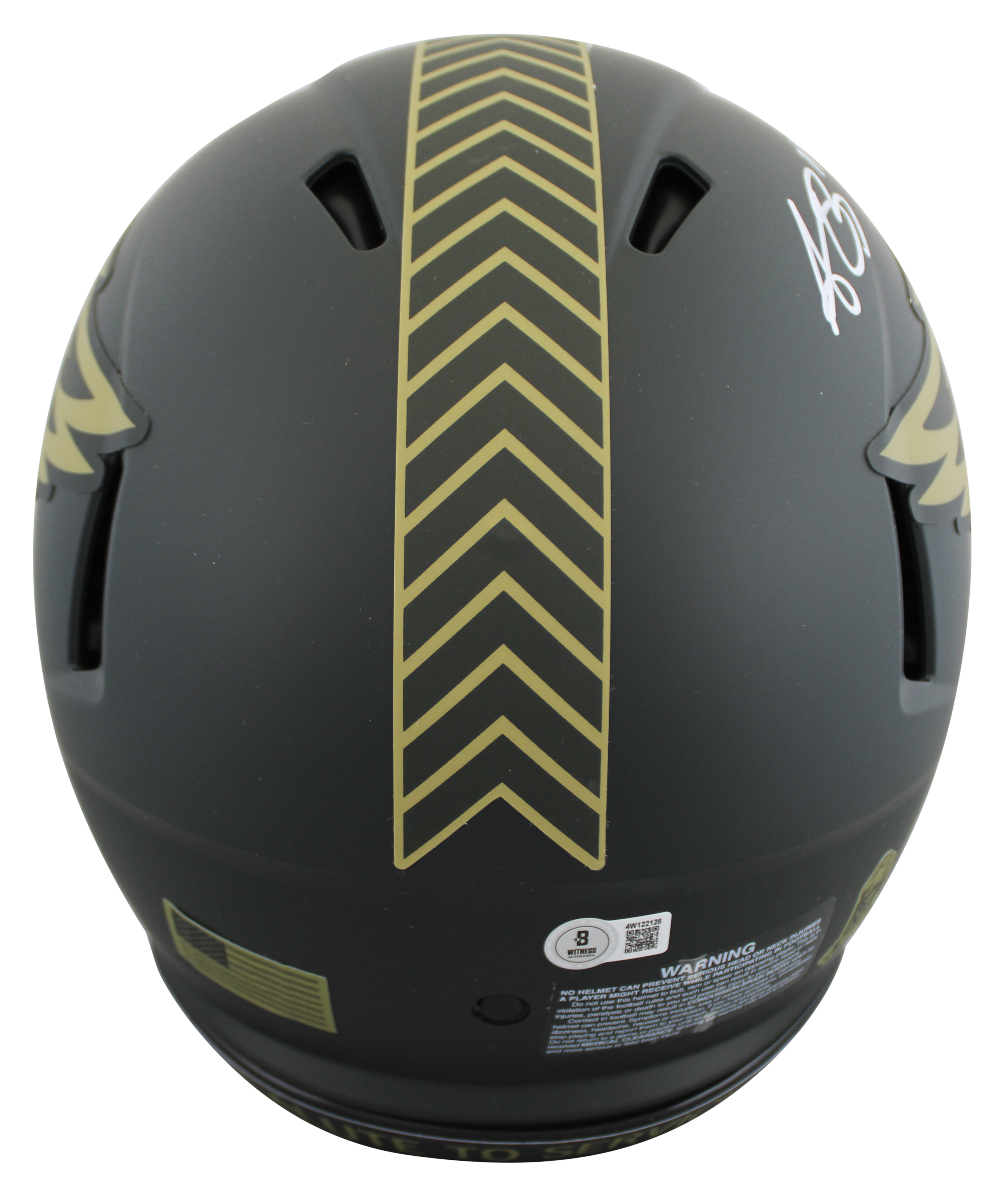This Autographed Alternate 2025 Salute to Service IV Riddell Authentic Full Size Speed Proline Helmet has been Personally Signed by A.J. Brown of the Philadelphia Eagles. This item is 100% Authentic to include a hologram by Beckett Authentication Services. This item will come with an affixed Beckett Authentication Services (BAS) authentication sticker, which includes a scannable QR code to verify authenticity. Please note that Beckett no longer provides serial-numbered COA cards, and the attached BAS sticker will serve as the complete authentication for this item. This is a BAS Witnessed Protection Program item which means a Beckett Authentication Service representative was present when this item was being signed. We conducted an autograph signing with A.J. Brown where multiples of the same item were signed. While the photographs are representative of this item, the size, placement and strength of the signature may vary. Each item is hand signed, therefore, each autograph is unique. This item can be verified through BAS Witnessed.