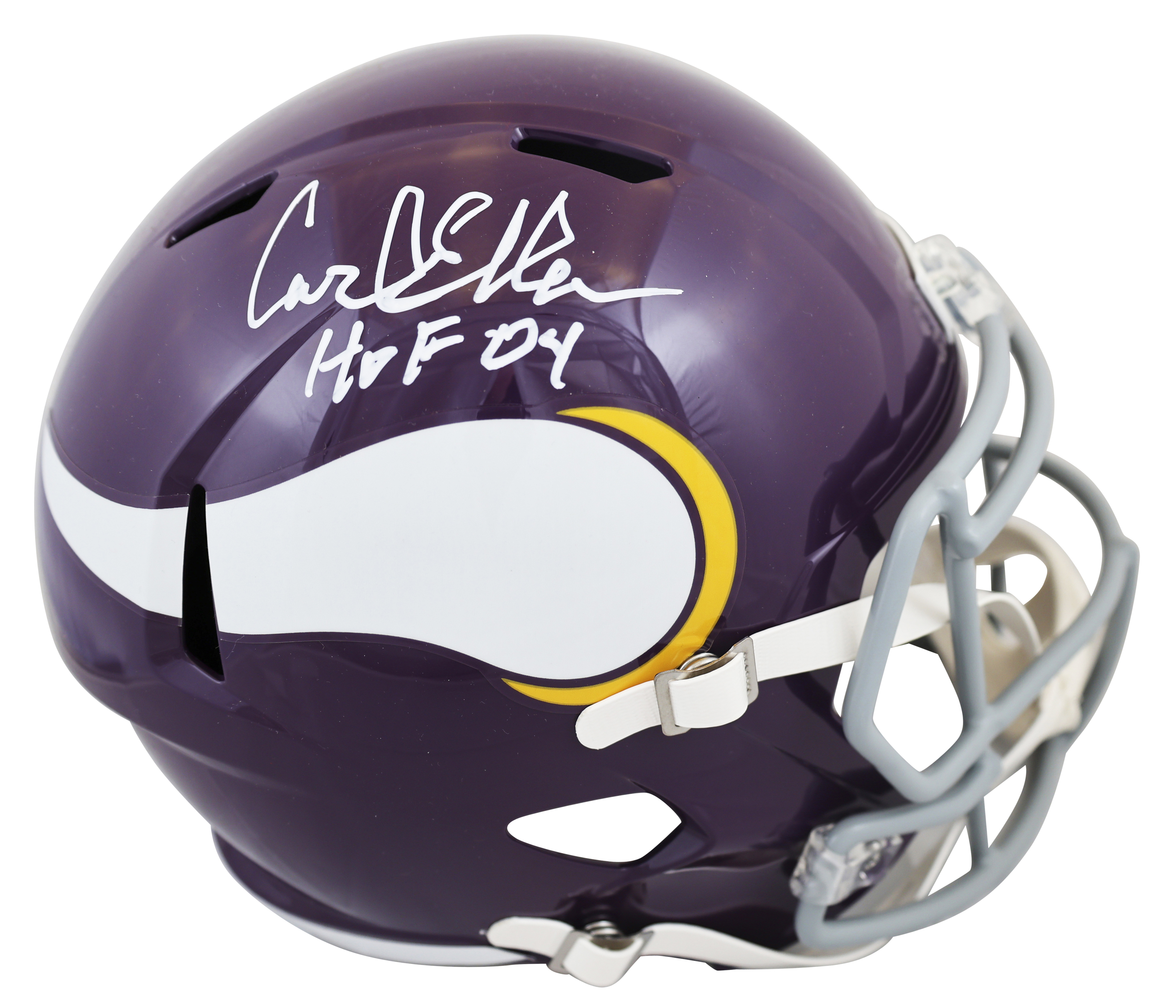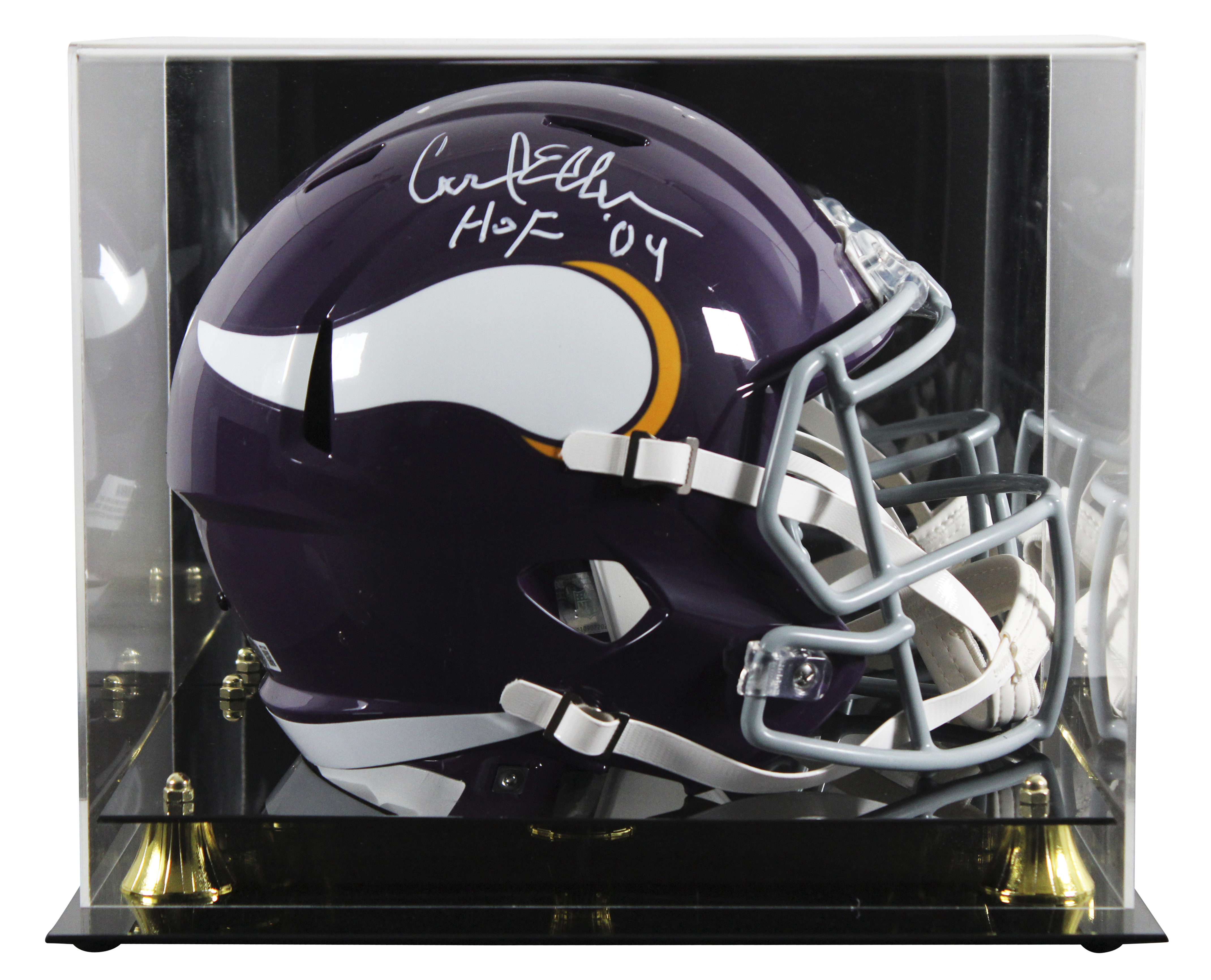 This Autographed 1961-79 Throwback Full Size Speed Rep Helmet W/ Uv Mirrored Back Acrylic Display Case with the inscription of "HOF 2004" has been Personally Signed by Carl Eller of the Minnesota Vikings. This item is 100% Authentic to include a hologram by Beckett Authentication Services. This item will come with an affixed Beckett Authentication Services (BAS) authentication sticker, which includes a scannable QR code to verify authenticity. Please note that Beckett no longer provides serial-numbered COA cards, and the attached BAS sticker will serve as the complete authentication for this item. This is a BAS Witnessed Protection Program item which means a Beckett Authentication Service representative was present when this item was being signed. We conducted an autograph signing with Carl Eller where multiples of the same item were signed. While the photographs are representative of this item, the size, placement and strength of the signature may vary. Each item is hand signed, therefore, each autograph is unique. This item can be verified through BAS Witnessed.