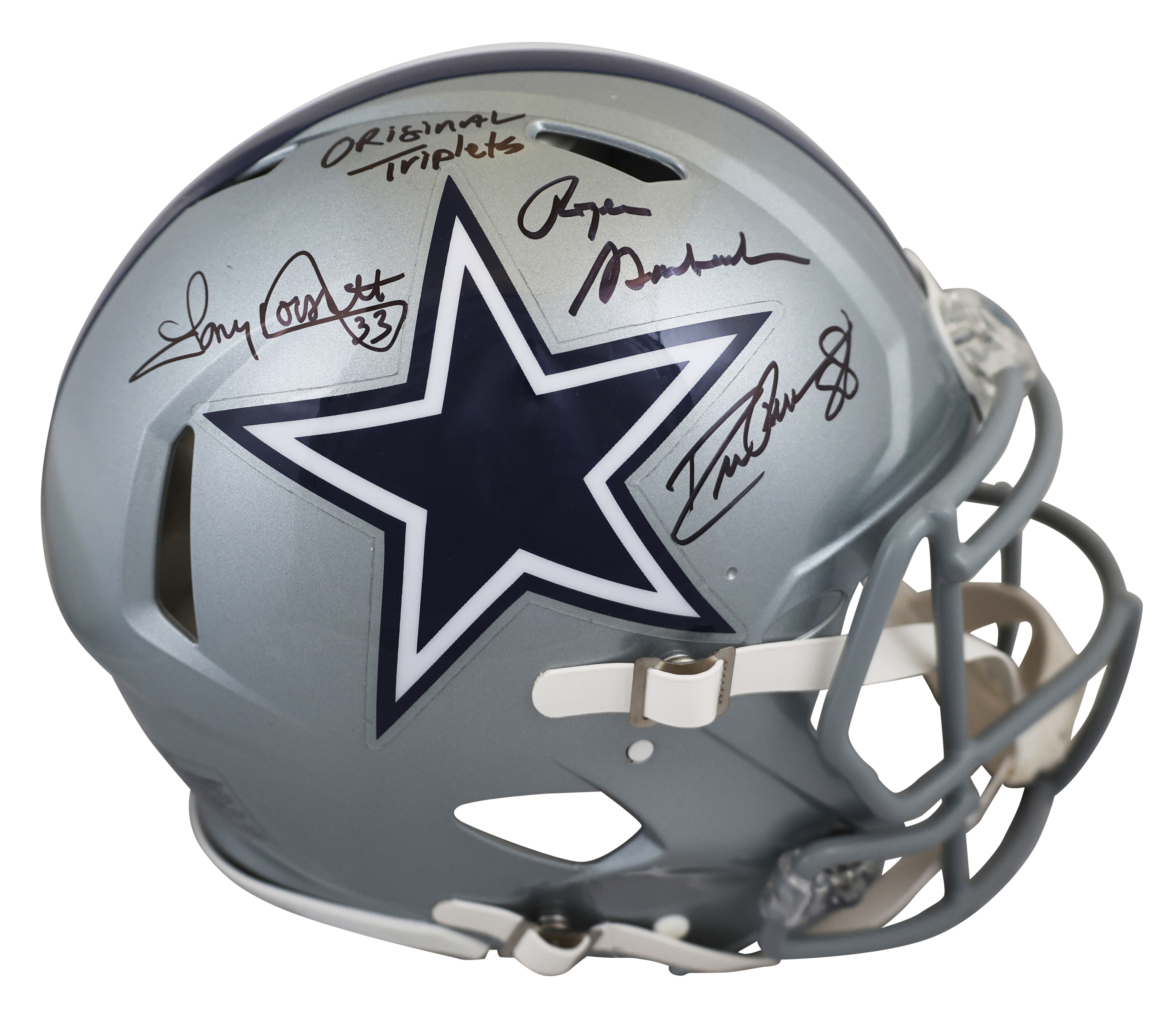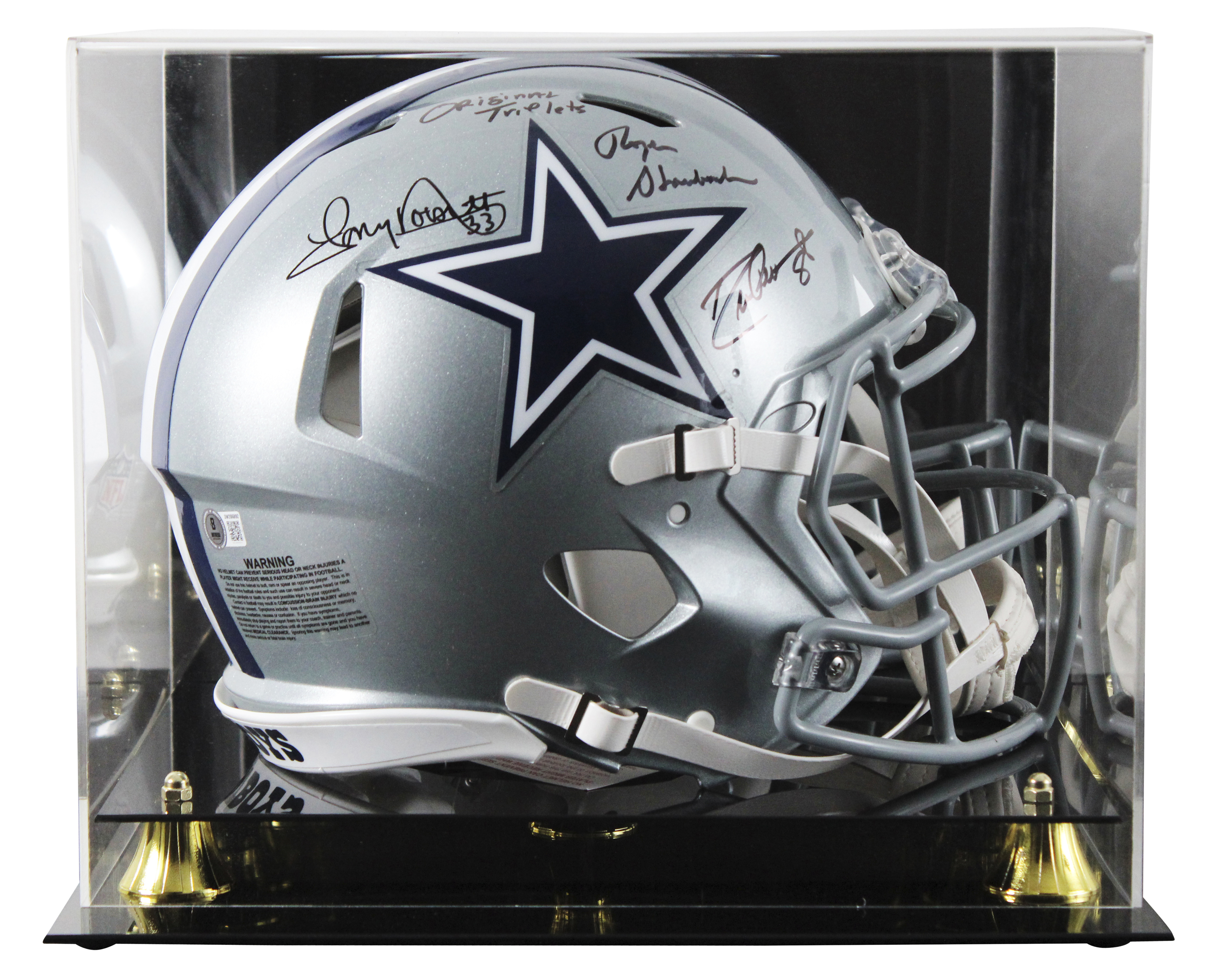 This Autographed Riddell Full Size Speed Proline Helmet W/ Uv Mirrored Back Acrylic Display Case with the inscription of "Original Triplets (Pearson)" has been Personally Signed by Drew Pearson, Roger Staubach & Tony Dorsett of the Dallas Cowboys. This item is 100% Authentic to include a hologram by Beckett Authentication Services. This item will come with an affixed Beckett Authentication Services (BAS) authentication sticker, which includes a scannable QR code to verify authenticity. Please note that Beckett no longer provides serial-numbered COA cards, and the attached BAS sticker will serve as the complete authentication for this item. This is a BAS Witnessed Protection Program item which means a Beckett Authentication Service representative was present when this item was being signed. We conducted an autograph signing with Drew Pearson, Roger Staubach & Tony Dorsett where multiples of the same item were signed. While the photographs are representative of this item, the size, placement and strength of the signature may vary. Each item is hand signed, therefore, each autograph is unique. This item can be verified through BAS Witnessed.