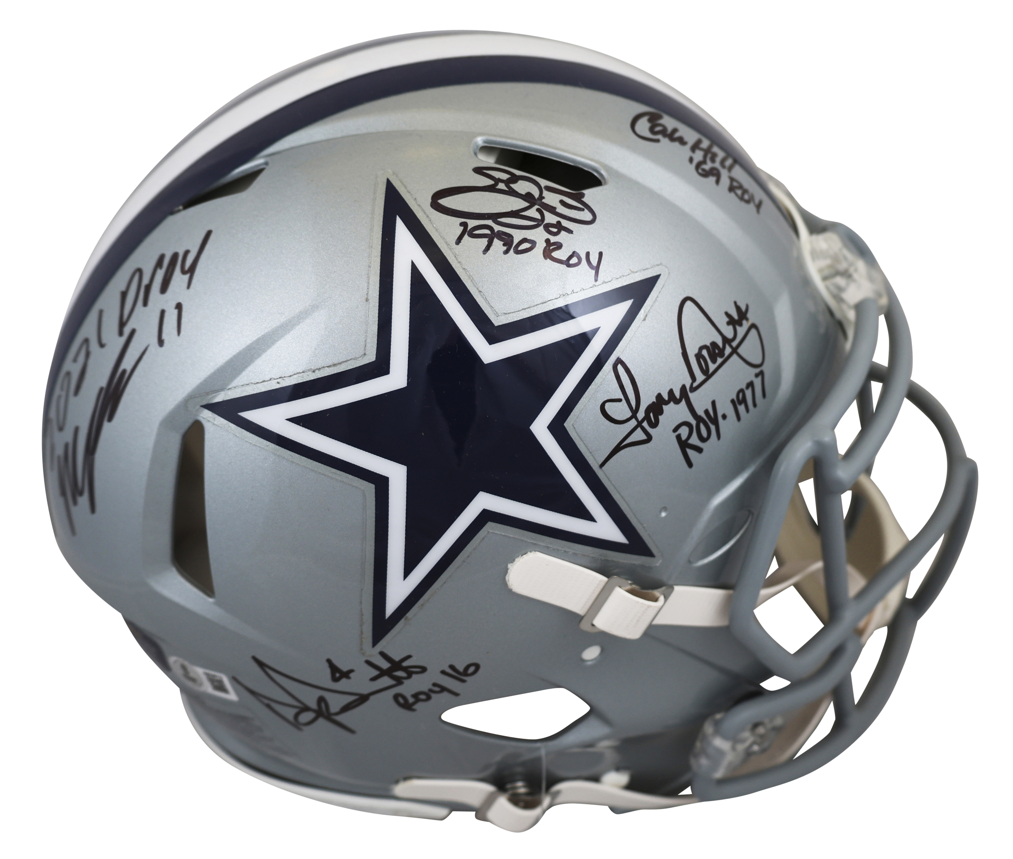 This Autographed Riddell Full Size Speed Proline Helmet W/ Uv Mirrored Back Acrylic Display Case with the inscription of "ROY 2016 (Prescott), ROY 1990 (Smith), ROY 2021 (Parsons), ROY 1977 (Dorsett), ROY 1969 (Hill)" has been Personally Signed by Dak Prescott, Emmitt Smith, Micah Parsons, Tony Dorsett & Calvin Hill of the Dallas Cowboys. This item is 100% Authentic to include a hologram by Beckett Authentication Services. This item will come with an affixed Beckett Authentication Services (BAS) authentication sticker, which includes a scannable QR code to verify authenticity. Please note that Beckett no longer provides serial-numbered COA cards, and the attached BAS sticker will serve as the complete authentication for this item. This is a BAS Witnessed Protection Program item which means a Beckett Authentication Service representative was present when this item was being signed. We conducted an autograph signing with Dak Prescott, Emmitt Smith, Micah Parsons, Tony Dorsett & Calvin Hill where multiples of the same item were signed. While the photographs are representative of this item, the size, placement and strength of the signature may vary. Each item is hand signed, therefore, each autograph is unique. This item can be verified through BAS Witnessed.