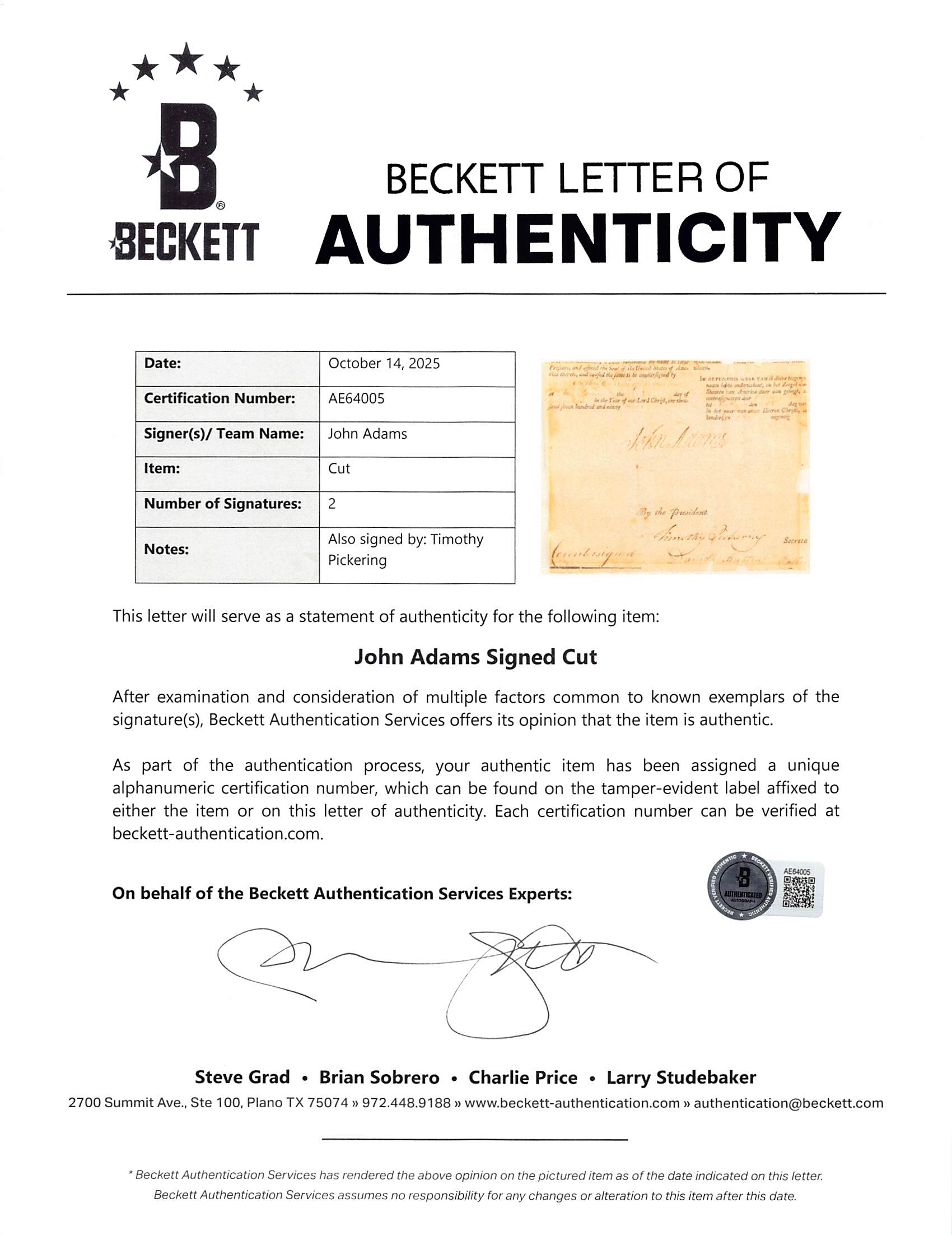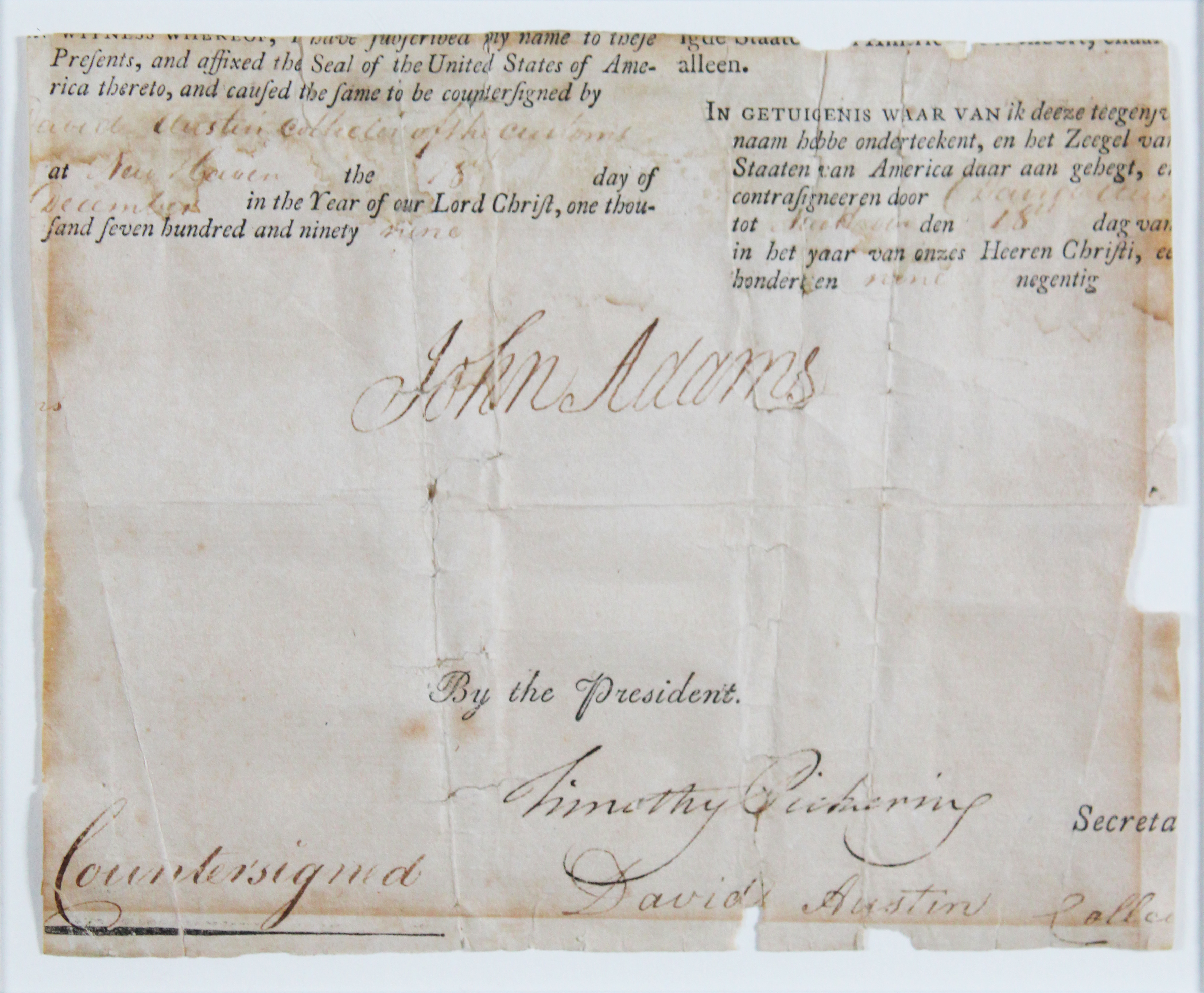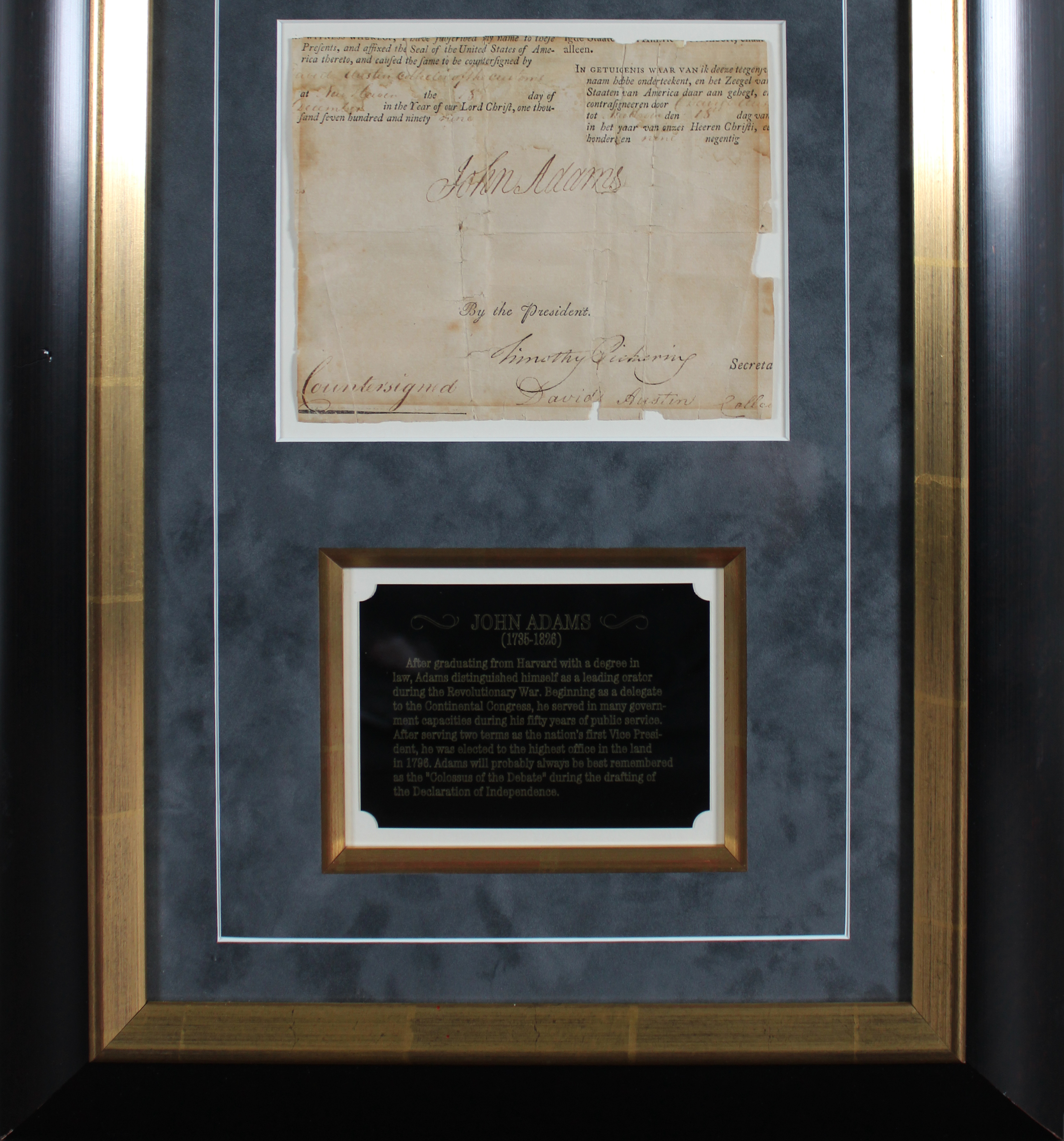This Autographed From A 4 Language Ship's Passport Dated June 1799 & Framed 5x7 Cut Signature has been Personally Signed by John Adams & Timothy Pickering. This item is 100% Authentic to include a Certificate of Authenticity (COA) / hologram by Beckett Authentication Services. The authenticity can be verified on Beckett Authentication Services website. This item has been professionally framed to overall dimensions of approximately 15.5 x 27 inches. The frame has some wear and dings from the original owner/collector. Please refer to photos for condition prior to purchase.
