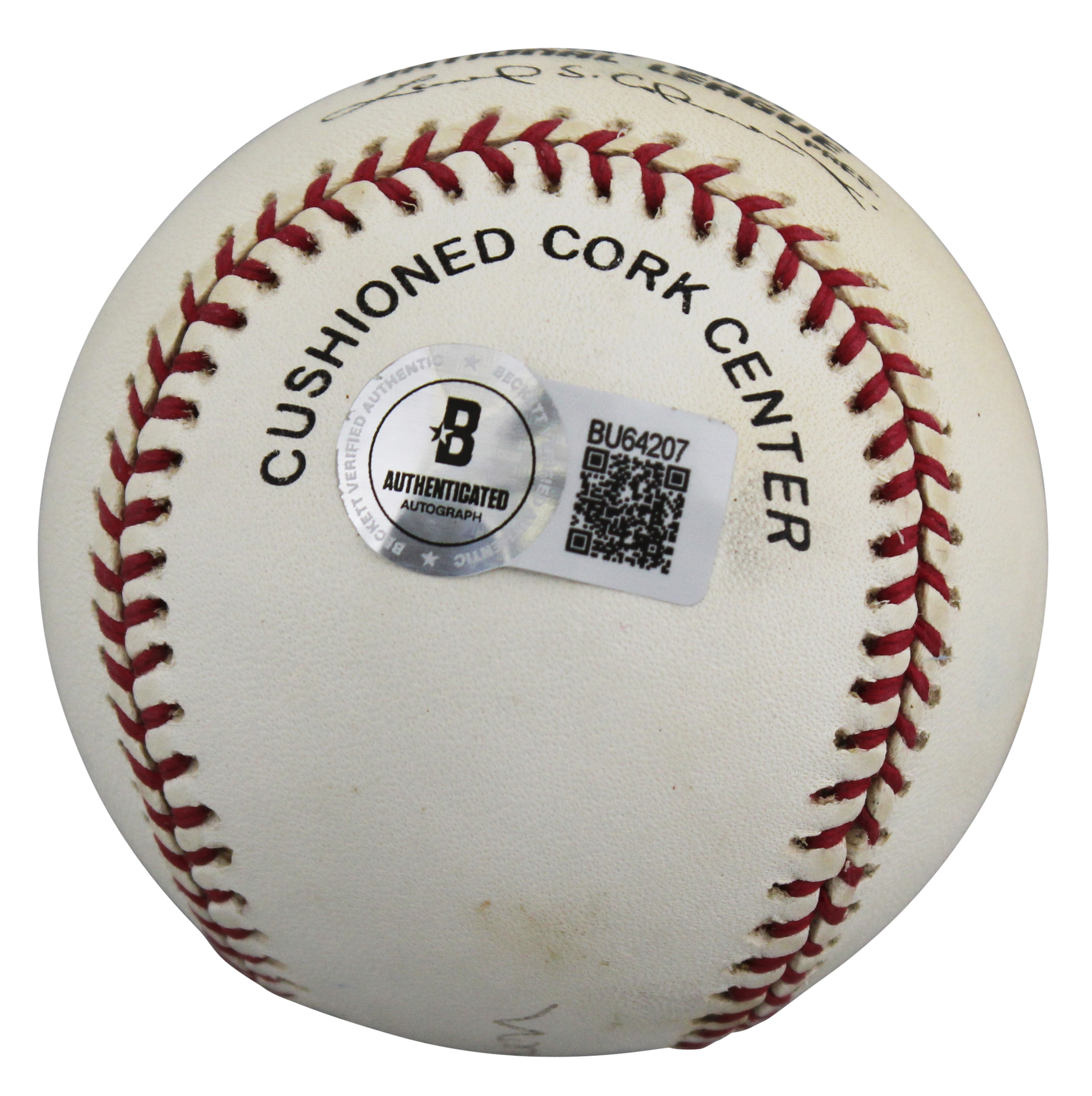 This Autographed Leonard Coleman Baseball has been Personally Signed by Bob Gibson of the St. Louis Cardinals. This item is 100% Authentic to include a hologram by Beckett Authentication Services. This item will come with an affixed Beckett Authentication Services (BAS) authentication sticker, which includes a scannable QR code to verify authenticity. Please note that Beckett no longer provides serial-numbered COA cards, and the attached BAS sticker will serve as the complete authentication for this item. The authenticity can be verified on Beckett Authentication Services website.