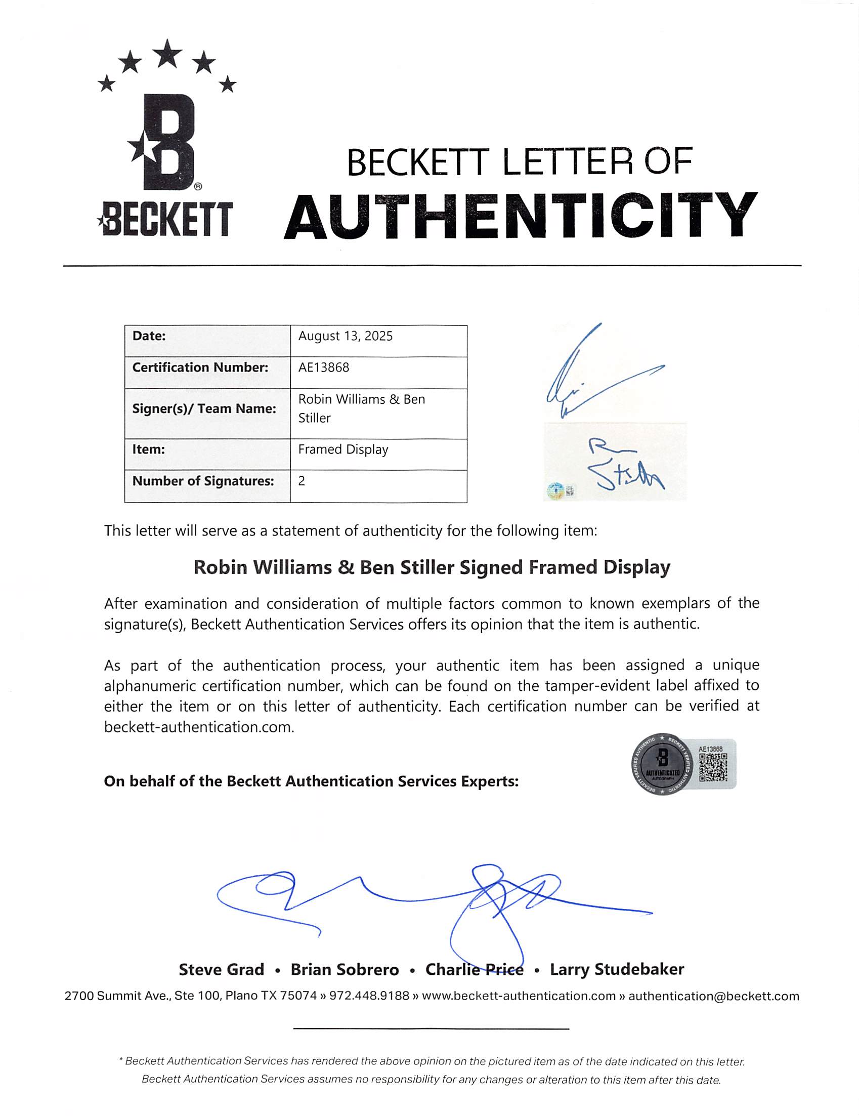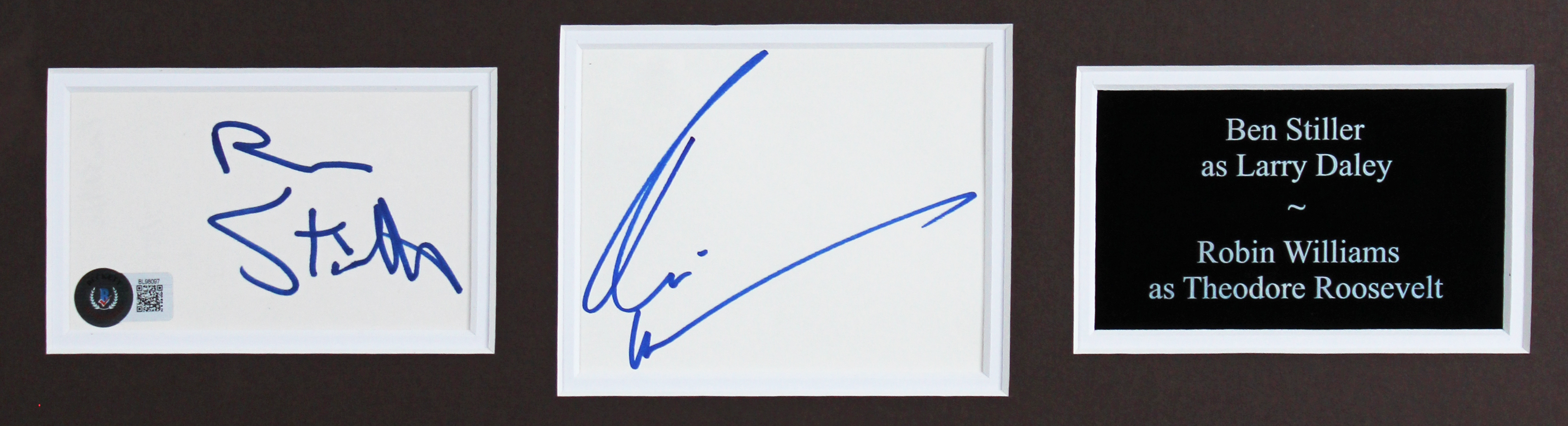 This Autographed Framed Display has been Personally Signed by Robin Williams & Ben Stiller of Night at the Museum. This item is 100% Authentic to include a Certificate of Authenticity (COA) / hologram by Beckett Authentication Services. The authenticity can be verified on Beckett Authentication Services website. This item has been professionally framed to overall dimensions of approximately 28.5 x 29.5 inches.
