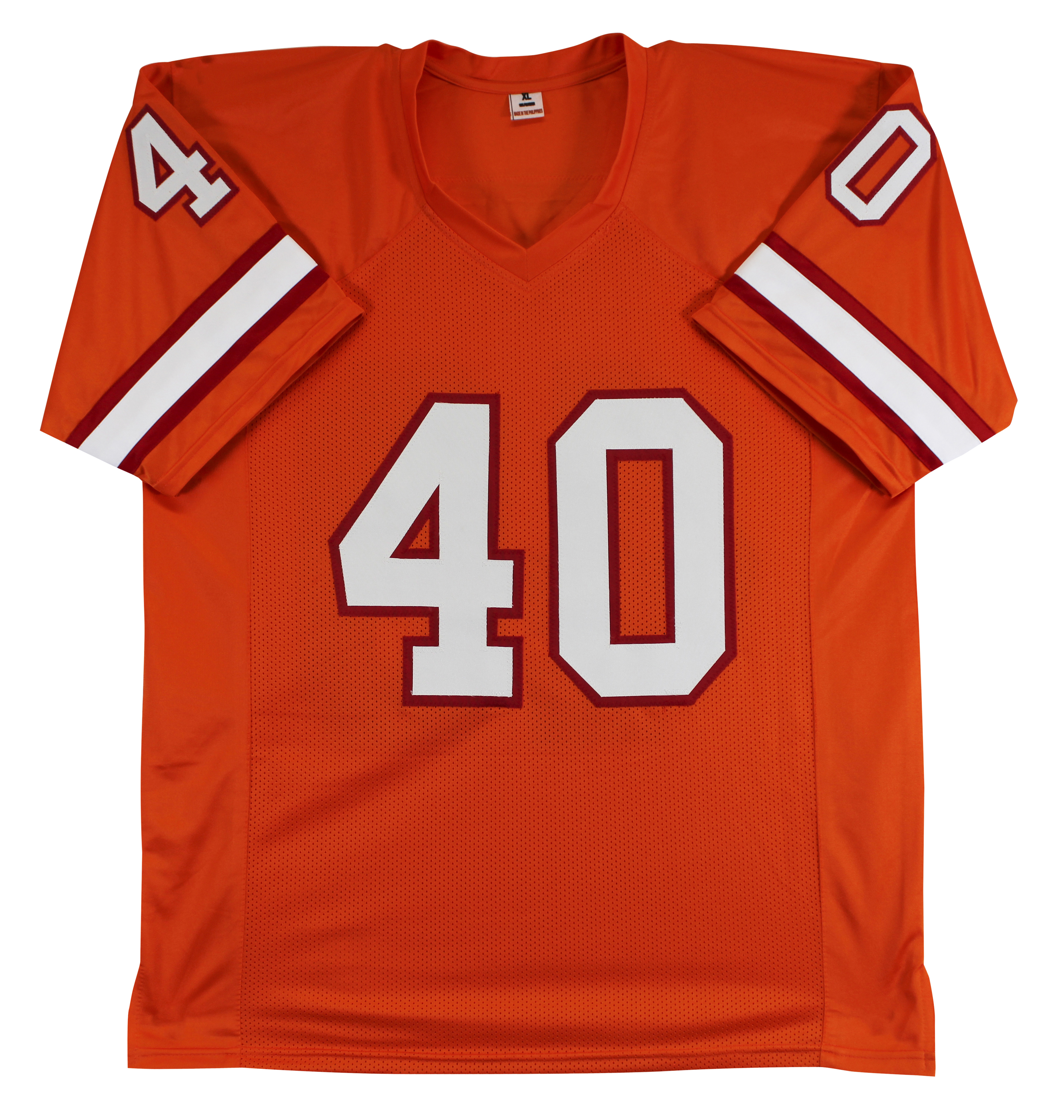 This Autographed Orange Throwback Pro Style Jersey with the inscription of "A-Train" has been Personally Signed by Mike Alstott of the Tampa Bay Buccaneers. This item is 100% Authentic to include a hologram by Beckett Authentication Services. This item will come with an affixed Beckett Authentication Services (BAS) authentication sticker, which includes a scannable QR code to verify authenticity. Please note that Beckett no longer provides serial-numbered COA cards, and the attached BAS sticker will serve as the complete authentication for this item. This is a BAS Witnessed Protection Program item which means a Beckett Authentication Service representative was present when this item was being signed. We conducted an autograph signing with Mike Alstott where multiples of the same item were signed. While the photographs are representative of this item, the size, placement and strength of the signature may vary. Each item is hand signed, therefore, each autograph is unique. This item can be verified through BAS Witnessed. This is a X-Large sized, non-branded, custom-stitched Jersey.