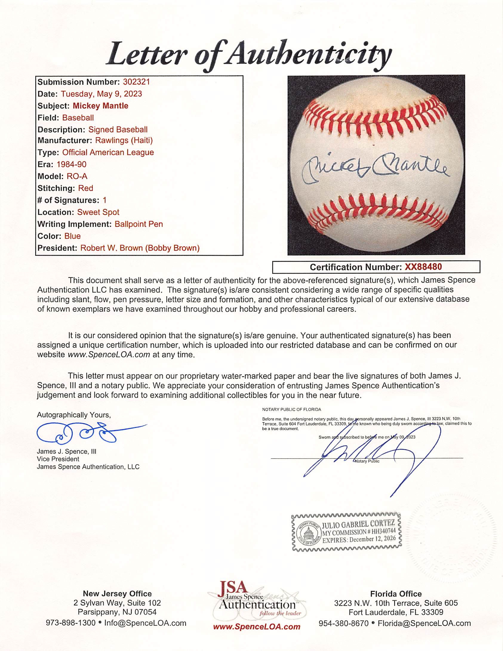 This Autographed Bobby Brown OAL Baseball has been Personally Signed by Mickey Mantle of the New York Yankees. This item is 100% Authentic to include a Certificate of Authenticity (COA) / hologram by JSA. The authenticity can be verified on JSA website.