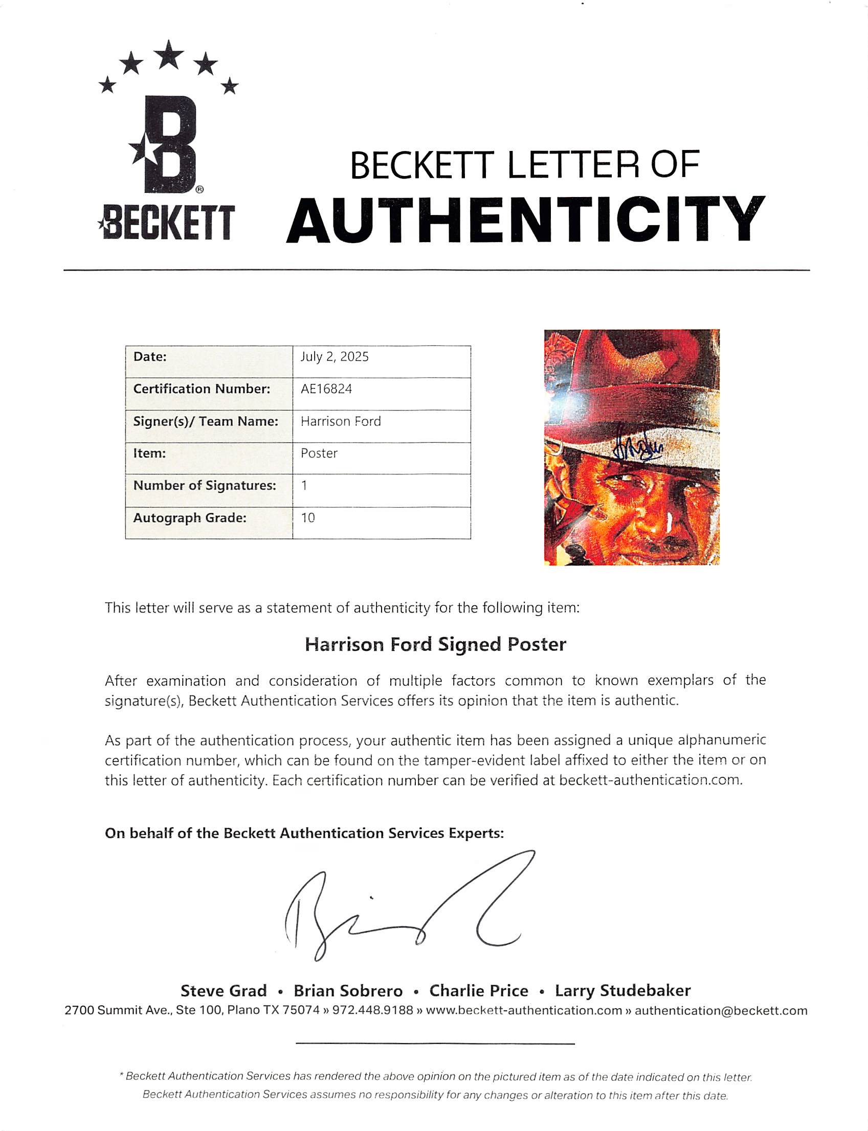 This Autographed Auto Graded Gem Mint 10! & Framed 24x36 Poster has been Personally Signed by Harrison Ford of Indiana Jones & The Temple Of Doom. This item is 100% Authentic to include a Certificate of Authenticity (COA) / hologram by Beckett Authentication Services. The authenticity can be verified on Beckett Authentication Services website. This item has been professionally framed to overall dimensions of approximately 32.5 x 44.5 inches.
