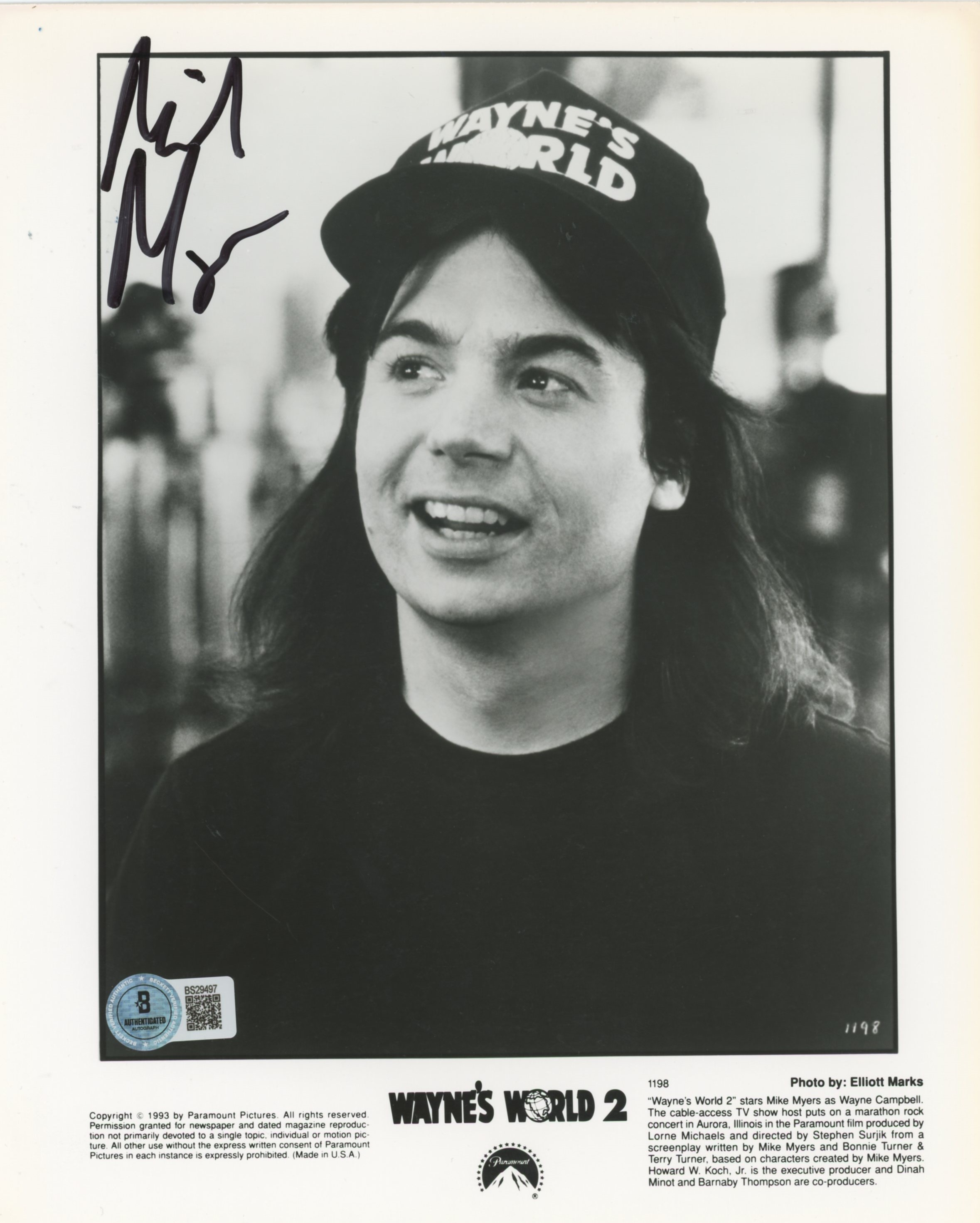 This Autographed Vertical 8x10 Photo has been Personally Signed by Mike Myers of Wayne's World. This item is 100% Authentic to include a hologram by Beckett Authentication Services. This item will come with an affixed Beckett Authentication Services (BAS) authentication sticker, which includes a scannable QR code to verify authenticity. Please note that Beckett no longer provides serial-numbered COA cards, and the attached BAS sticker will serve as the complete authentication for this item. The authenticity can be verified on Beckett Authentication Services website.
