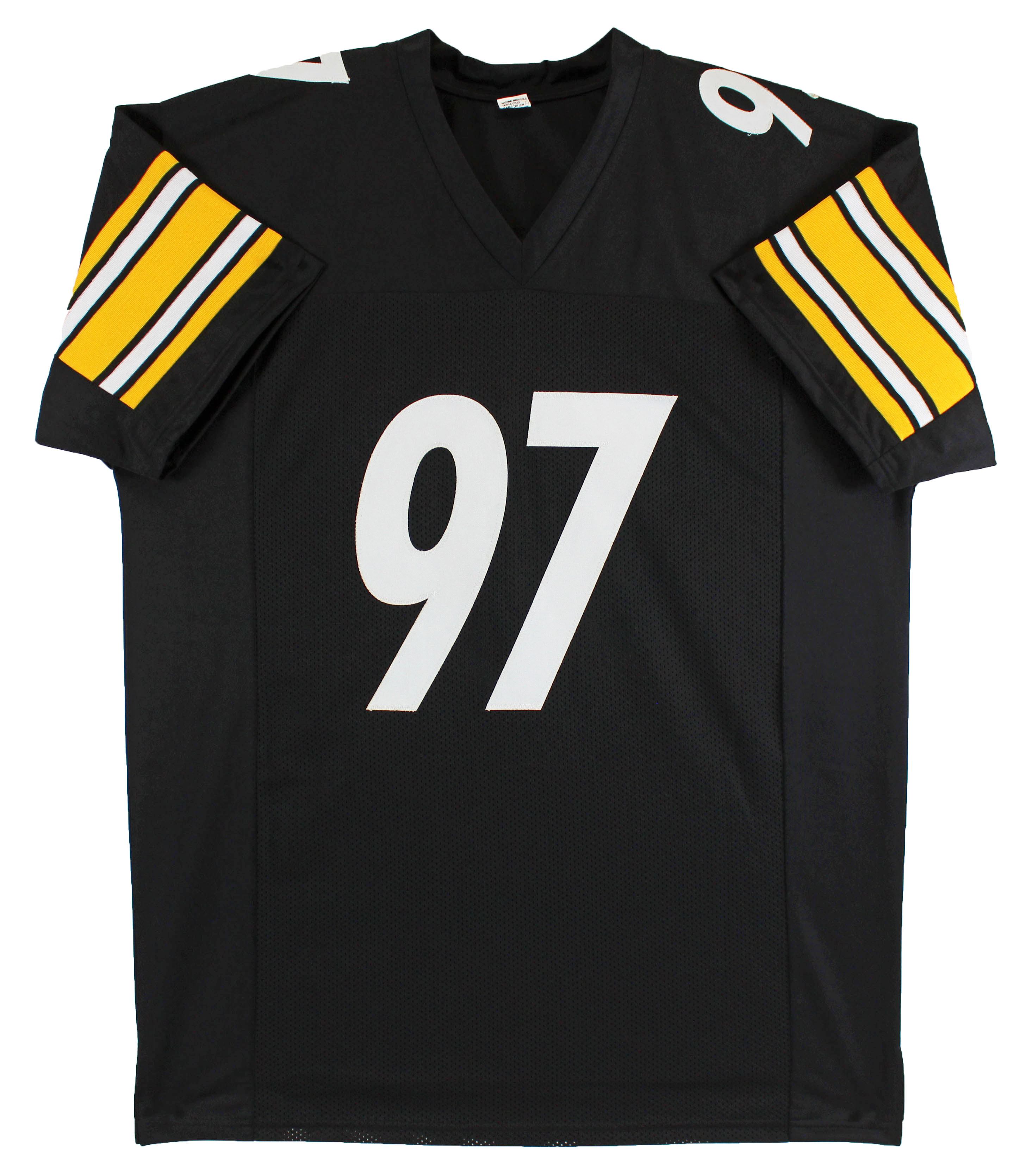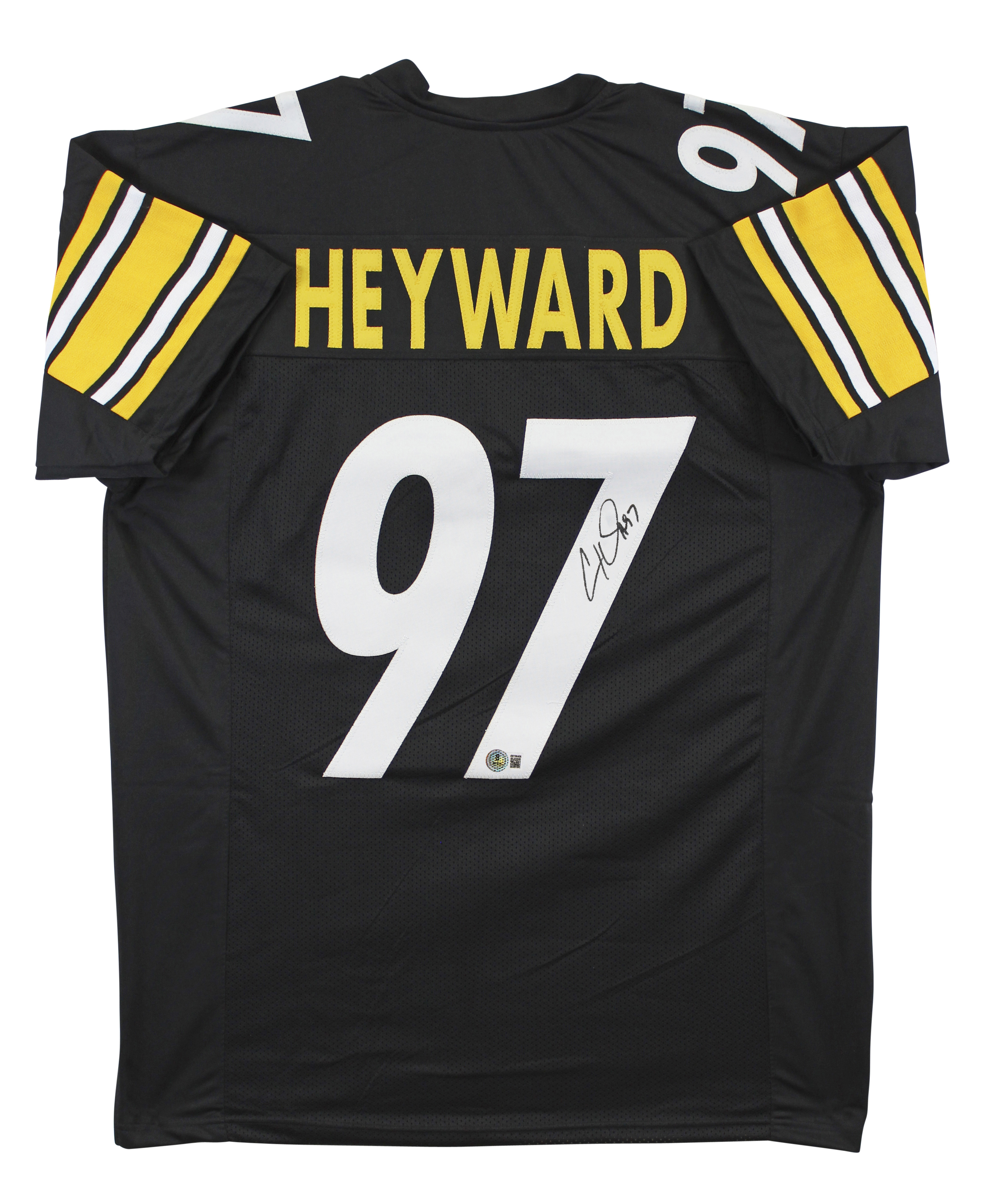 This Autographed Black Pro Style Jersey has been Personally Signed by Cameron Heyward of the Pittsburgh Steelers. This item is 100% Authentic to include a hologram by Beckett Authentication Services. This item will come with an affixed Beckett Authentication Services (BAS) authentication sticker, which includes a scannable QR code to verify authenticity. Please note that Beckett no longer provides serial-numbered COA cards, and the attached BAS sticker will serve as the complete authentication for this item. This is a BAS Witnessed Protection Program item which means a Beckett Authentication Service representative was present when this item was being signed. We conducted an autograph signing with Cameron Heyward where multiples of the same item were signed. While the photographs are representative of this item, the size, placement and strength of the signature may vary. Each item is hand signed, therefore, each autograph is unique. This item can be verified through BAS Witnessed. This is a X-Large sized, non-branded, custom-stitched Jersey. There is some bleeding coming from the back of the numbers and is giving a blueish tint to the white numbers.