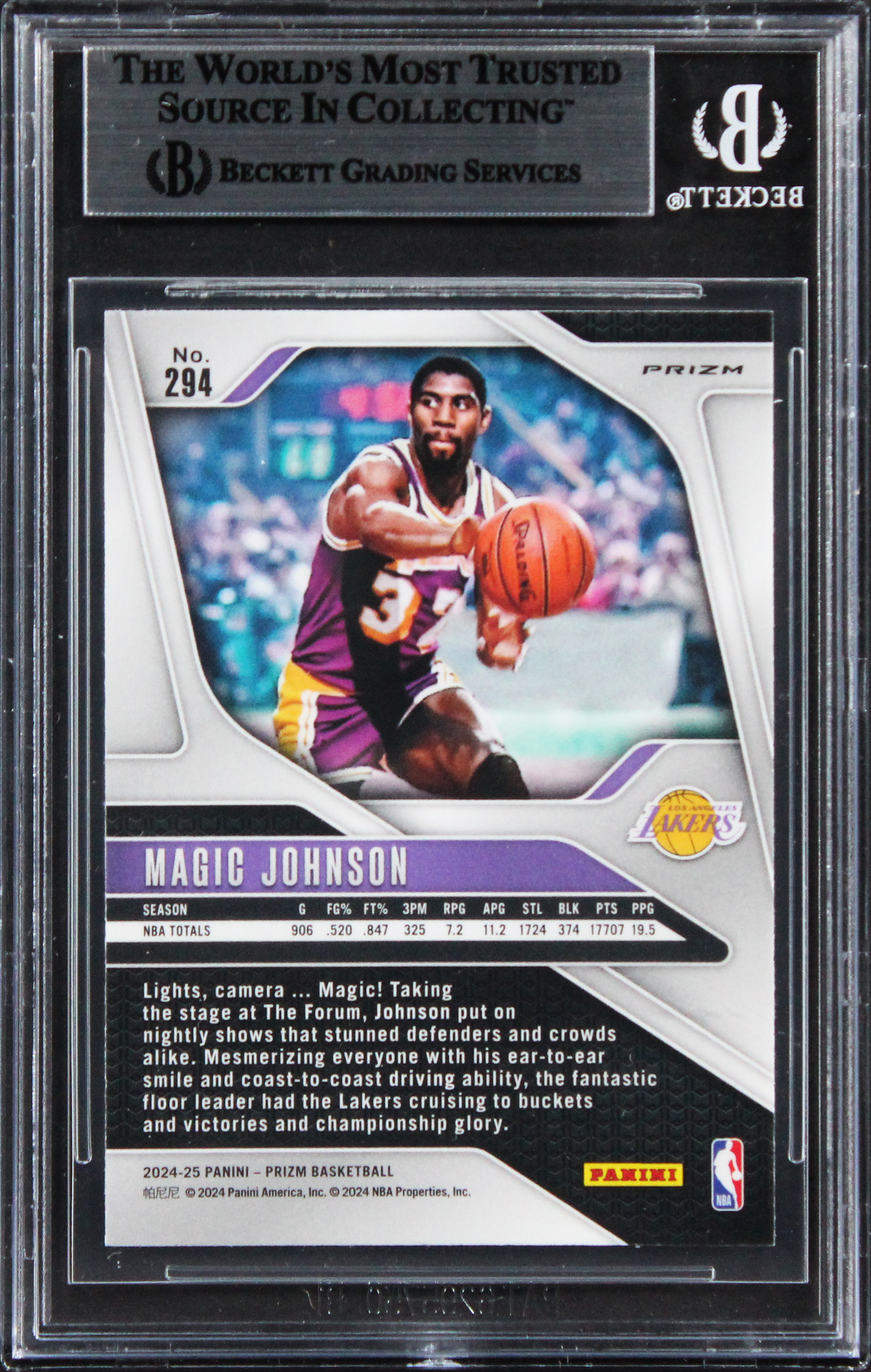 This Autographed 2024 Panini Prizm Prizms Red White & Blue #294 Card has been Personally Signed by Magic Johnson of the Los Angeles Lakers. This item is 100% Authentic, it comes slabbed and authenticated by Beckett Authentication Services. The authenticity can be verified on Beckett Authentication Services website.