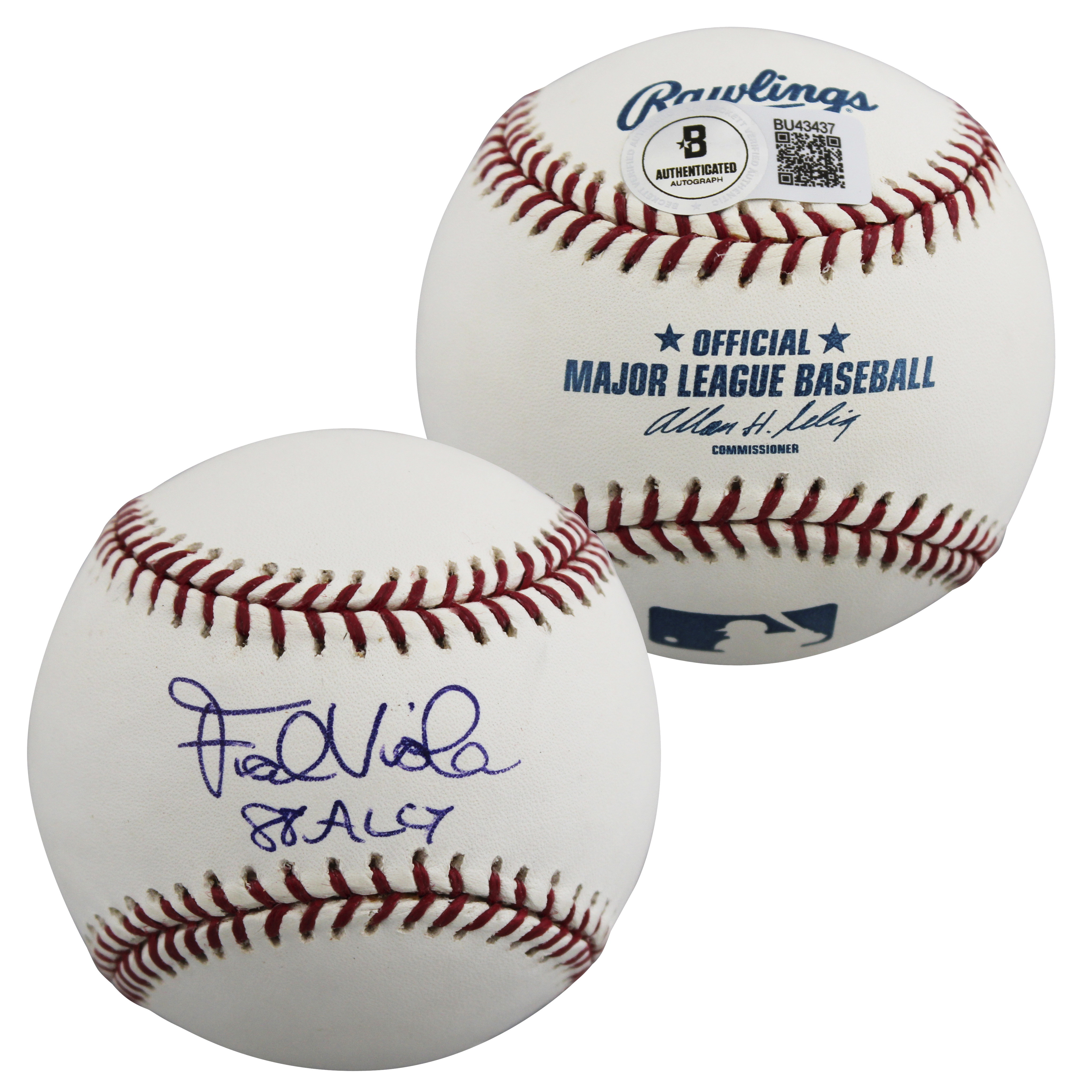 This Autographed Allen Selig Baseball with the inscription of "88 AL CY" has been Personally Signed by Frank Viola of the Minnesota Twins. This item is 100% Authentic to include a hologram by Beckett Authentication Services. This item will come with an affixed Beckett Authentication Services (BAS) authentication sticker, which includes a scannable QR code to verify authenticity. Please note that Beckett no longer provides serial-numbered COA cards, and the attached BAS sticker will serve as the complete authentication for this item. The authenticity can be verified on Beckett Authentication Services website.
