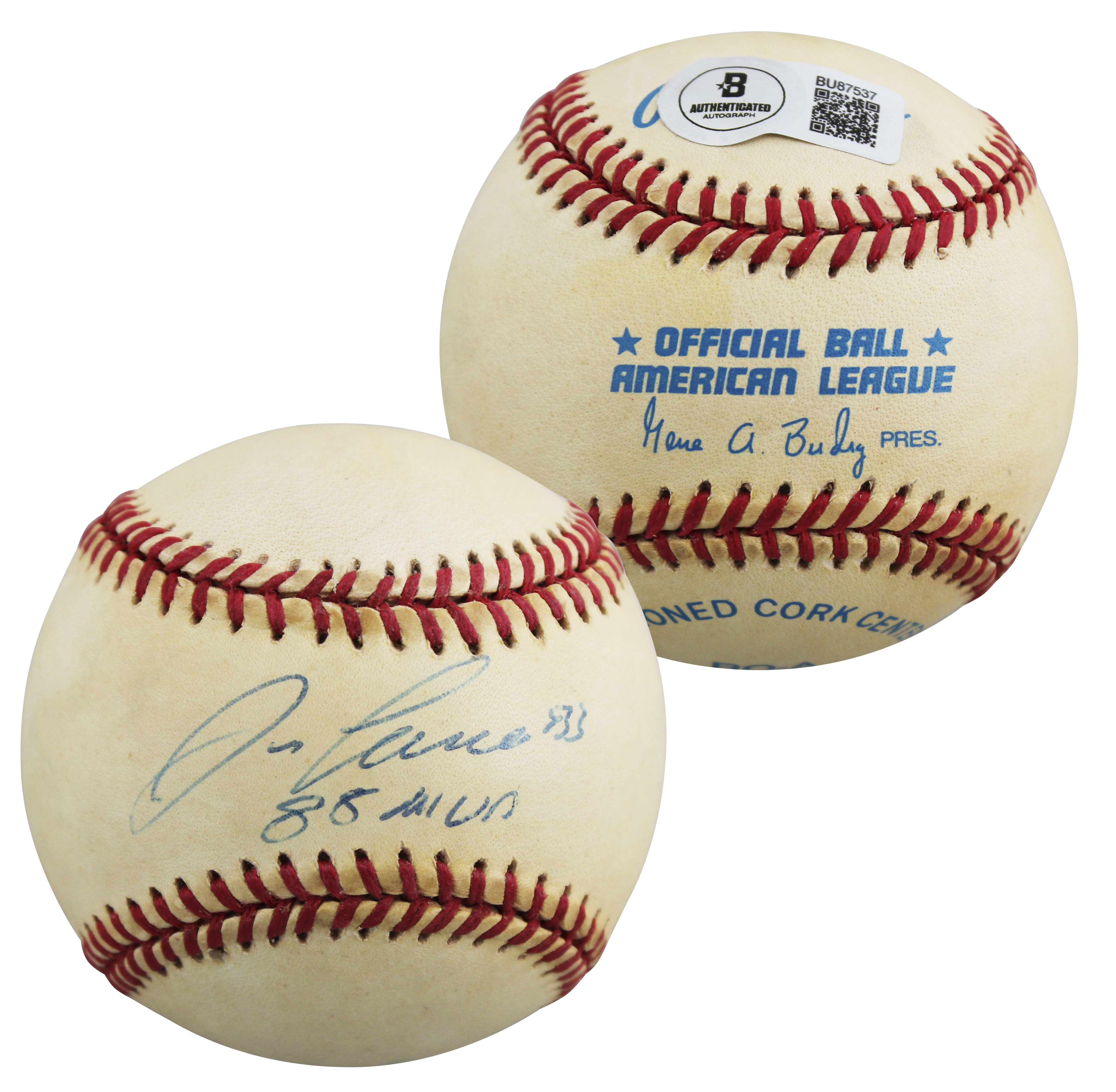 This Autographed Gene Budig Baseball with the inscription of "88 MVP" has been Personally Signed by Jose Canseco of the Oakland Athletics. This item is 100% Authentic to include a hologram by Beckett Authentication Services. This item will come with an affixed Beckett Authentication Services (BAS) authentication sticker, which includes a scannable QR code to verify authenticity. Please note that Beckett no longer provides serial-numbered COA cards, and the attached BAS sticker will serve as the complete authentication for this item. The authenticity can be verified on Beckett Authentication Services website.