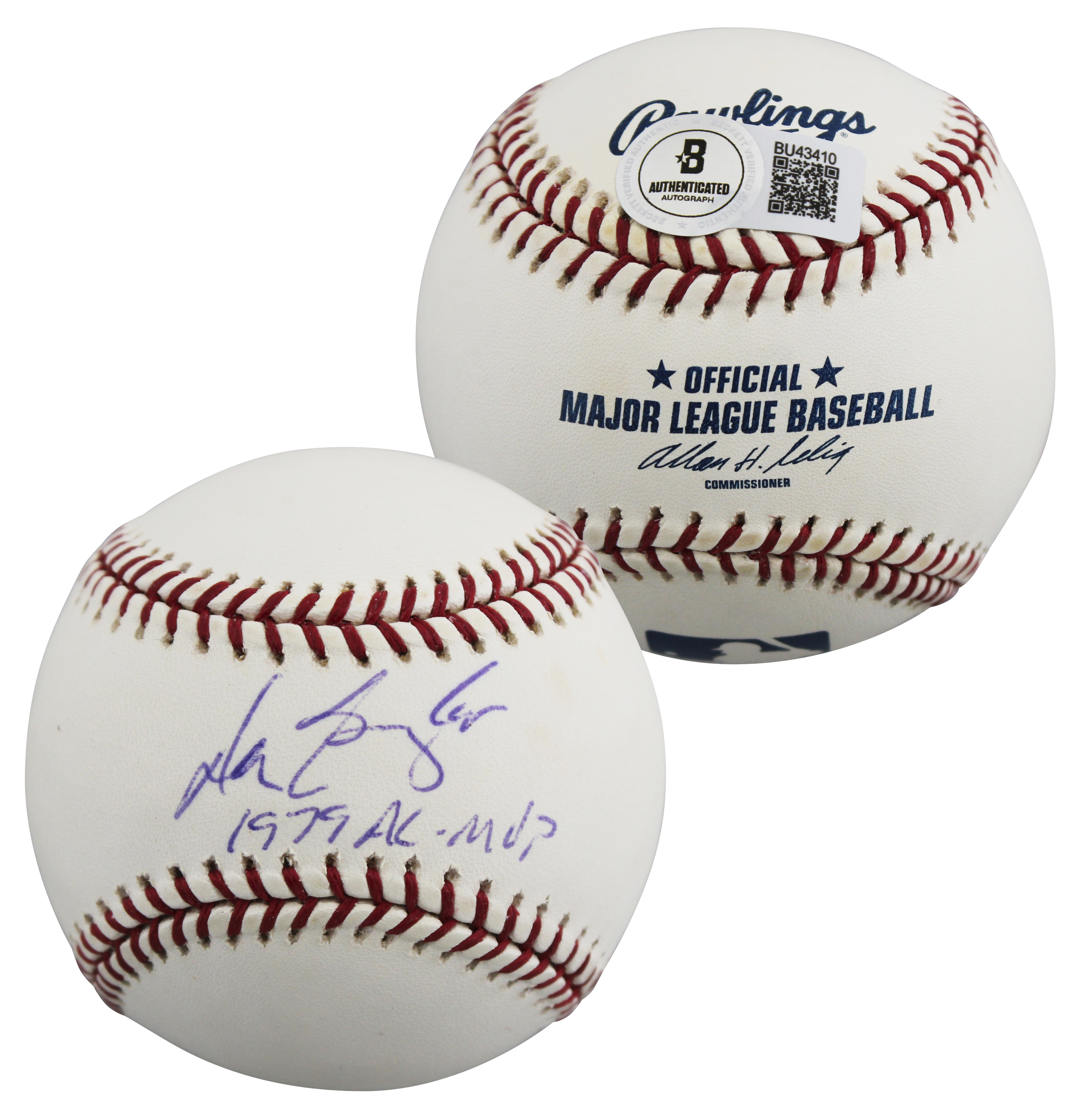 This Autographed Baseball with the inscription of "1979 AL MVP" has been Personally Signed by Don Baylor of the Los Angeles Angels. This item is 100% Authentic to include a hologram by Beckett Authentication Services. This item will come with an affixed Beckett Authentication Services (BAS) authentication sticker, which includes a scannable QR code to verify authenticity. Please note that Beckett no longer provides serial-numbered COA cards, and the attached BAS sticker will serve as the complete authentication for this item. The authenticity can be verified on Beckett Authentication Services website.