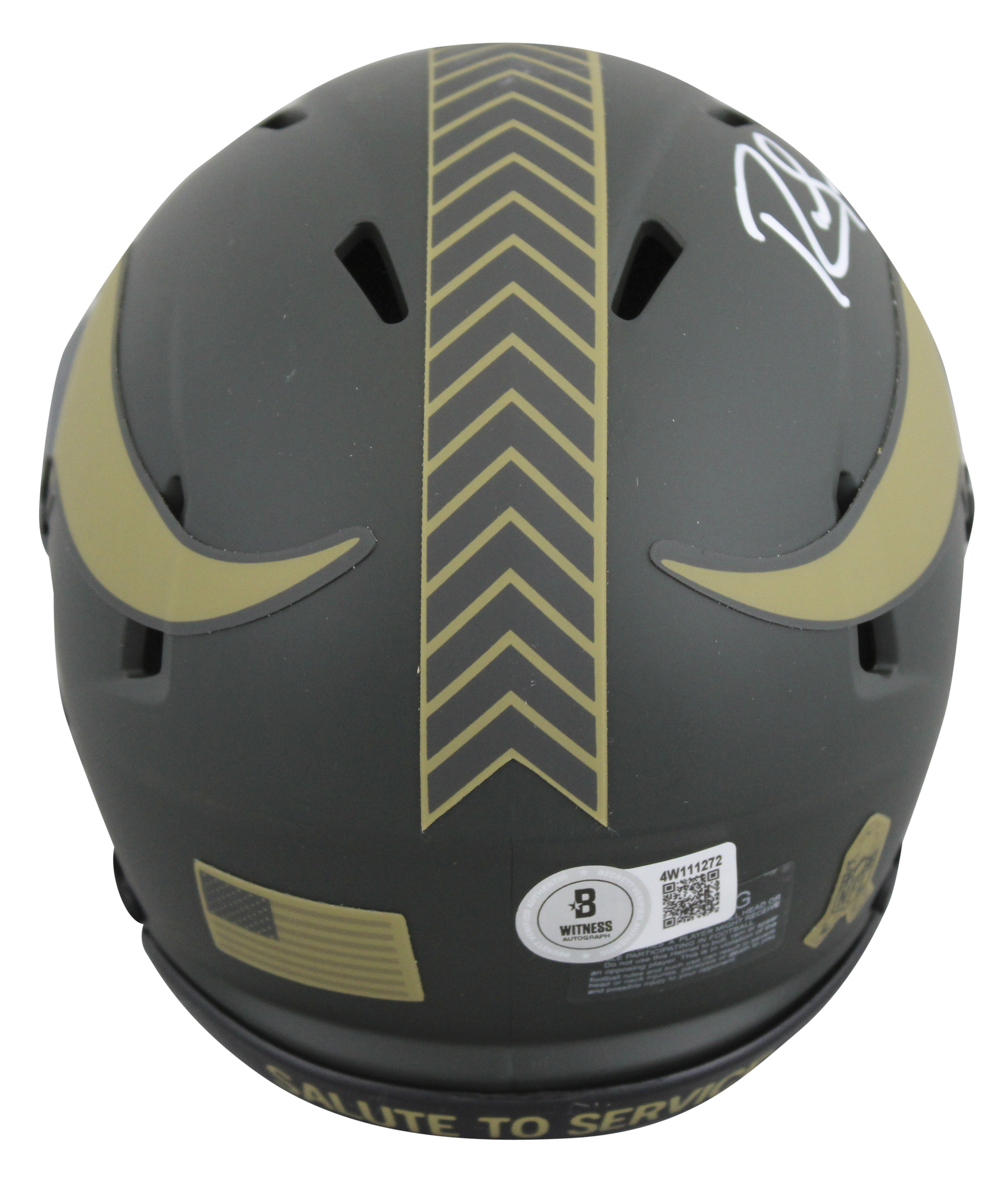 This Autographed Alternate 2025 Salute to Service IV Speed Mini Helmet W/ Uv Mirrored Back Acrylic Display Case has been Personally Signed by Randy Moss of the Minnesota Vikings. This item is 100% Authentic to include a hologram by Beckett Authentication Services. This item will come with an affixed Beckett Authentication Services (BAS) authentication sticker, which includes a scannable QR code to verify authenticity. Please note that Beckett no longer provides serial-numbered COA cards, and the attached BAS sticker will serve as the complete authentication for this item. This is a BAS Witnessed Protection Program item which means a Beckett Authentication Service representative was present when this item was being signed. We conducted an autograph signing with Randy Moss where multiples of the same item were signed. While the photographs are representative of this item, the size, placement and strength of the signature may vary. Each item is hand signed, therefore, each autograph is unique. This item can be verified through BAS Witnessed.