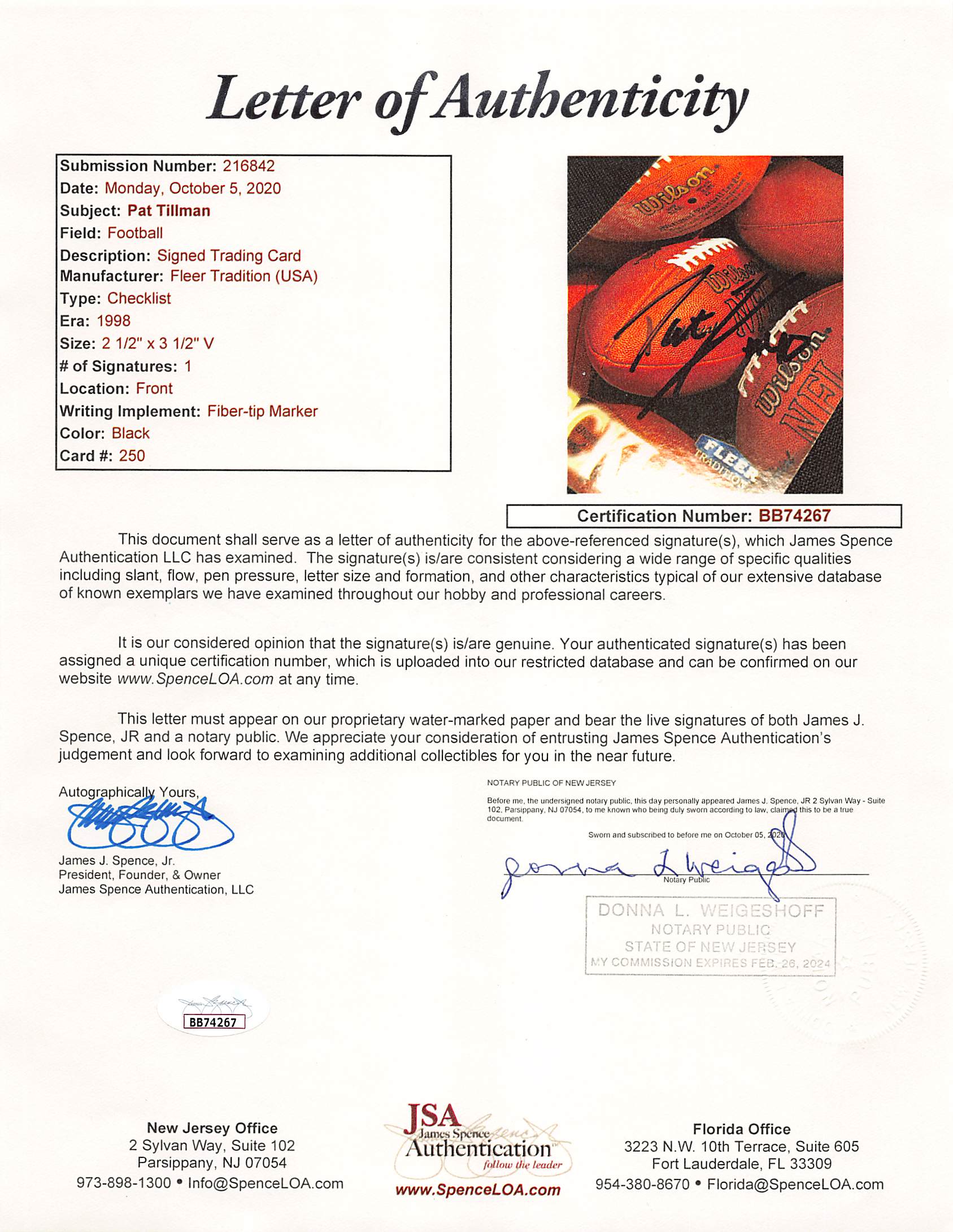 This Autographed 1998 Fleer Tradition Checklist #250 Framed Display has been Personally Signed by Pat Tillman of the Arizona Cardinals. This item is 100% Authentic to include a Certificate of Authenticity (COA) / hologram by JSA. The authenticity can be verified on JSA website. This item has been professionally framed to overall dimensions of approximately 36.5 x 445 inches.