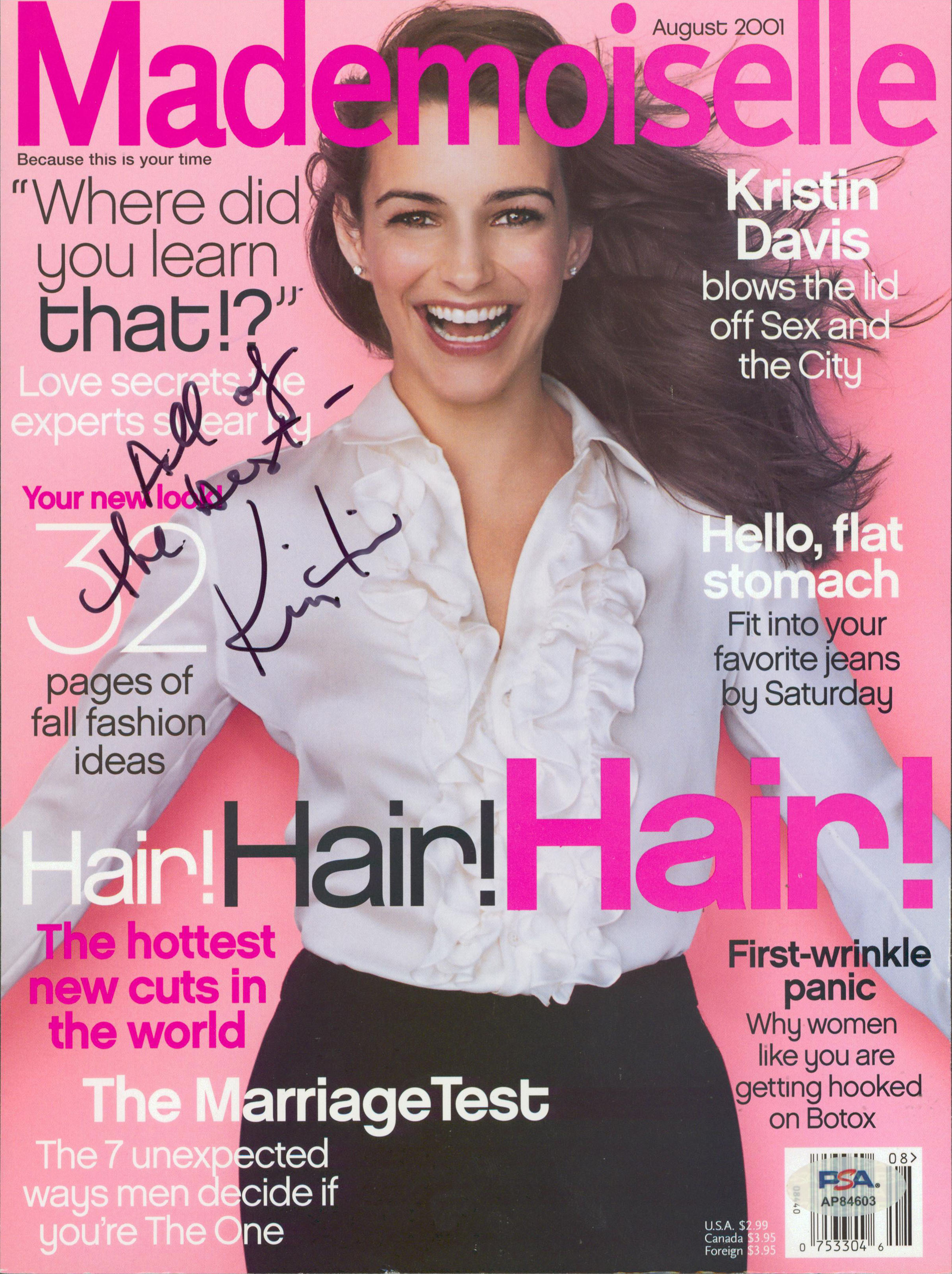 This Autographed Mademoiselle August 2001 Magazine Cover has been Personally Signed by Kristin Davis. This item is 100% Authentic and comes with a PSA/DNA Certification numbered Hologram. Please note that PSA/DNA no longer provides serial-numbered COA cards, and the attached PSA/DNA sticker will serve as the complete authentication for this item. The authenticity can be verified on Professional Sports Authenticators website.