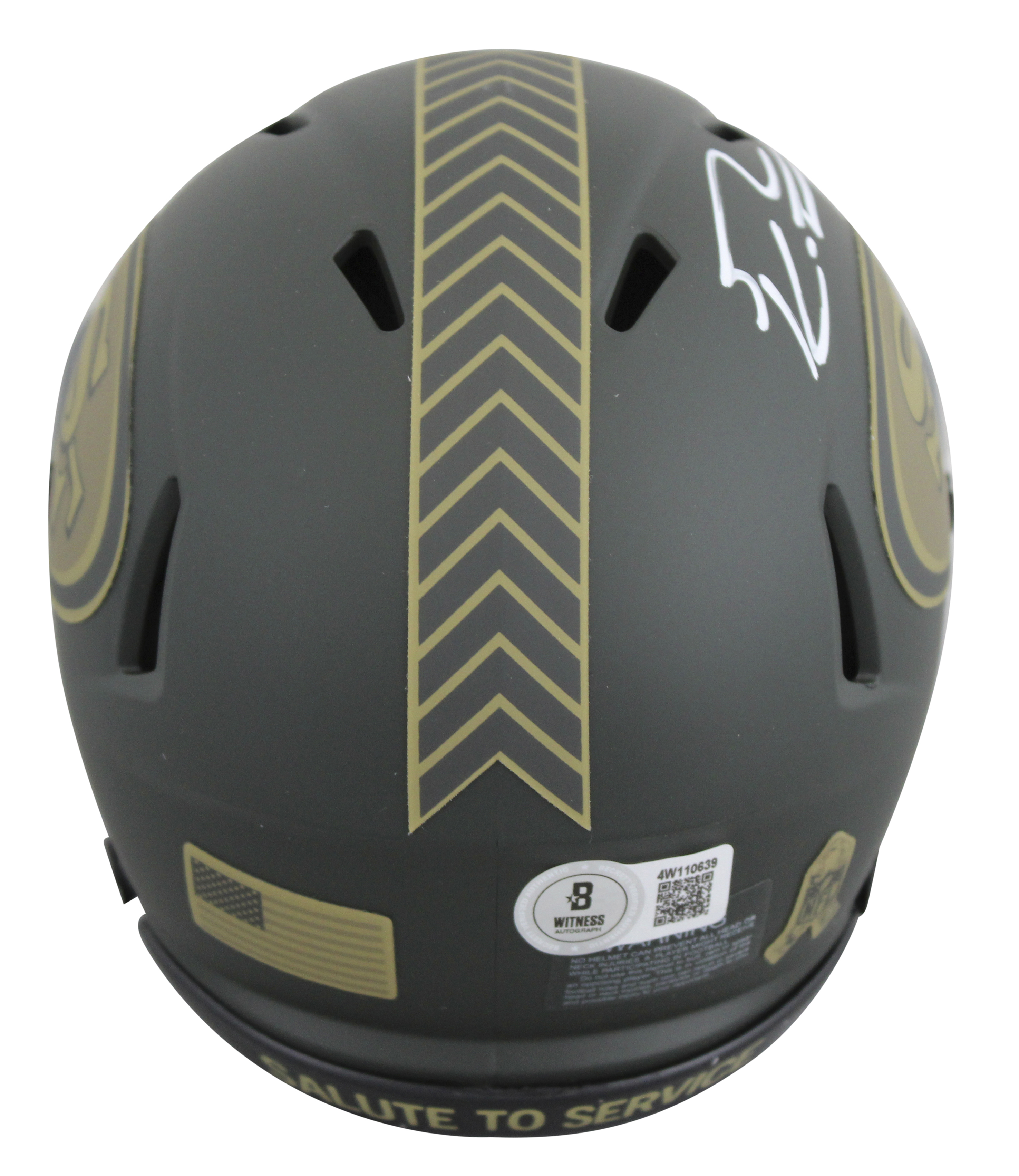This Autographed Alternate Salute To Service IV Speed Mini Helmet has been Personally Signed by George Kittle of the San Francisco 49ers. This item is 100% Authentic to include a hologram by Beckett Authentication Services. This item will come with an affixed Beckett Authentication Services (BAS) authentication sticker, which includes a scannable QR code to verify authenticity. Please note that Beckett no longer provides serial-numbered COA cards, and the attached BAS sticker will serve as the complete authentication for this item. This is a BAS Witnessed Protection Program item which means a Beckett Authentication Service representative was present when this item was being signed. We conducted an autograph signing with George Kittle where multiples of the same item were signed. While the photographs are representative of this item, the size, placement and strength of the signature may vary. Each item is hand signed, therefore, each autograph is unique. This item can be verified through BAS Witnessed.