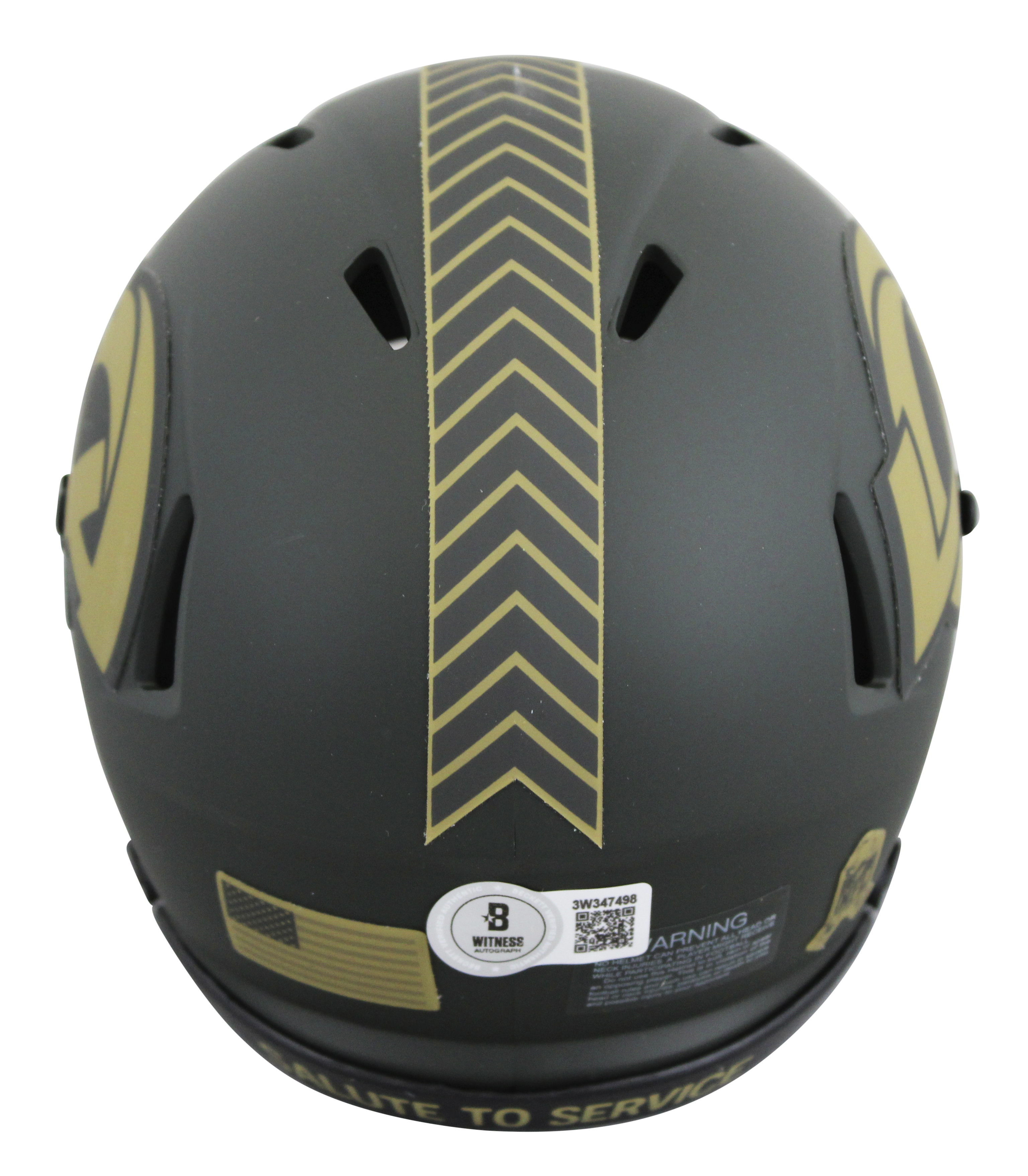 This Autographed Alternate Salute To Service IV Speed Mini Helmet has been Personally Signed by Marshall Faulk of the Los Angeles Rams. This item is 100% Authentic to include a hologram by Beckett Authentication Services. This item will come with an affixed Beckett Authentication Services (BAS) authentication sticker, which includes a scannable QR code to verify authenticity. Please note that Beckett no longer provides serial-numbered COA cards, and the attached BAS sticker will serve as the complete authentication for this item. This is a BAS Witnessed Protection Program item which means a Beckett Authentication Service representative was present when this item was being signed. We conducted an autograph signing with Marshall Faulk where multiples of the same item were signed. While the photographs are representative of this item, the size, placement and strength of the signature may vary. Each item is hand signed, therefore, each autograph is unique. This item can be verified through BAS Witnessed.