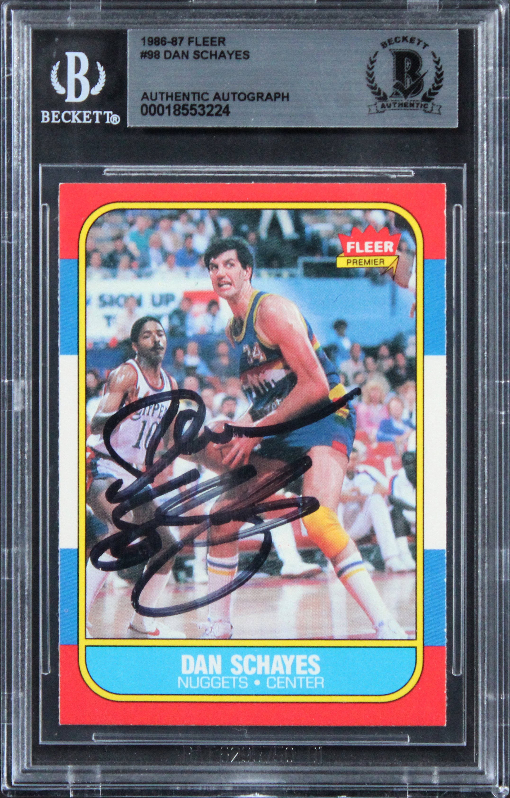 This Autographed 1986 Fleer #98 Card has been Personally Signed by Dan Schayes of the Denver Nuggets. This item is 100% Authentic, it comes slabbed and authenticated by Beckett Authentication Services. We have multiples of this same item. While the photographs are representative of this item, the size, placement and strength of the signature may vary. Each item is hand signed, therefore, each autograph is unique.