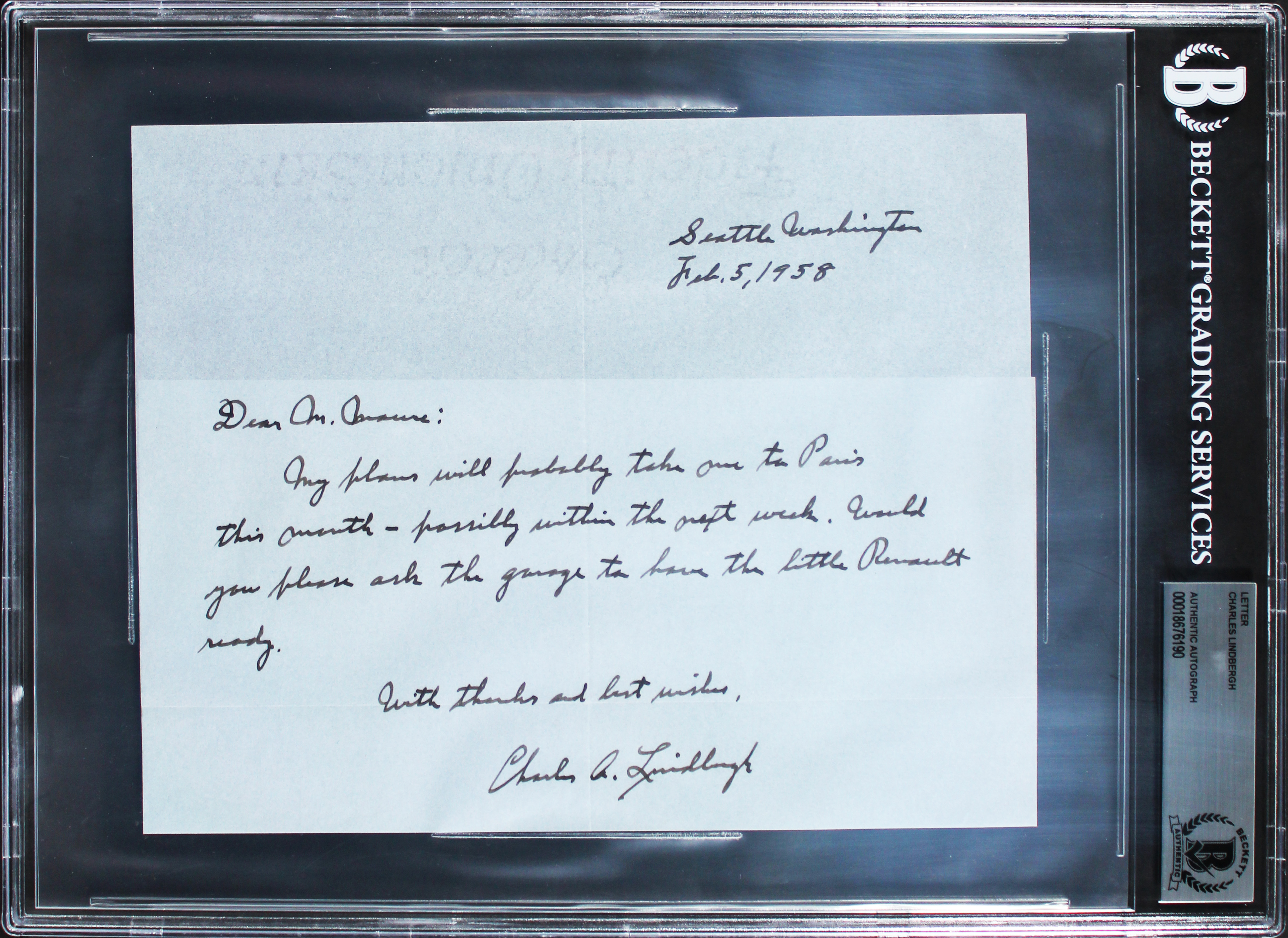 This Autographed Dated February 5, 1958 6.75x8.5 Handwritten Letter has been Personally Signed by Charles Lindbergh. This item is 100% Authentic, it comes slabbed and authenticated by Beckett Authentication Services. The authenticity can be verified on Beckett Authentication Services website. This handwritten letter to ���������M. Maure,��������� reads in full: ���������My plans will probably take me to Paris this month ��������� possibly within the next week. Would you please ask the garage to have the little Renault ready.���������